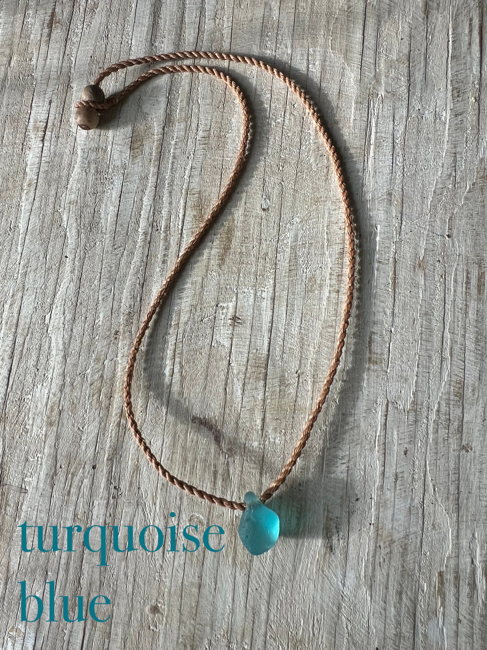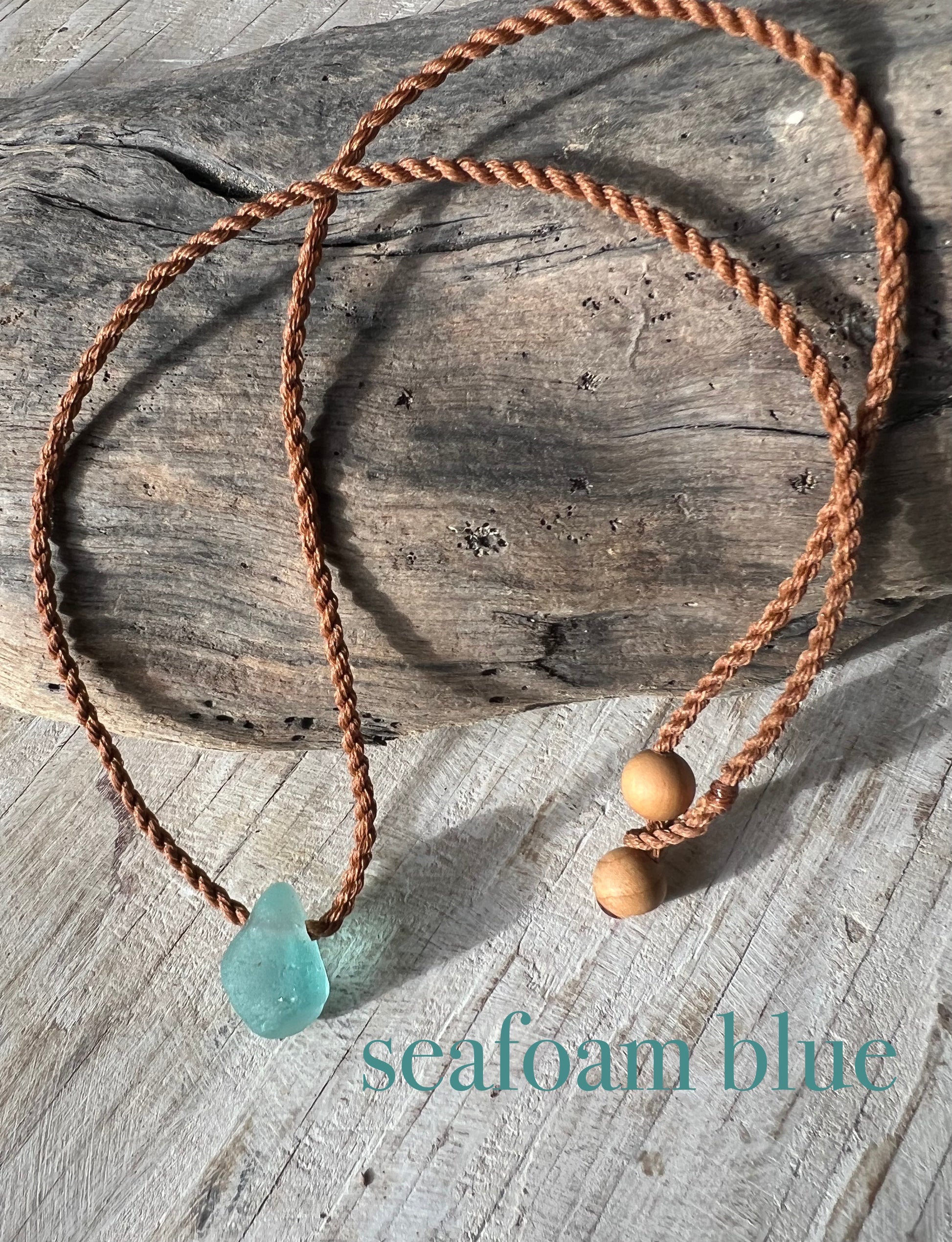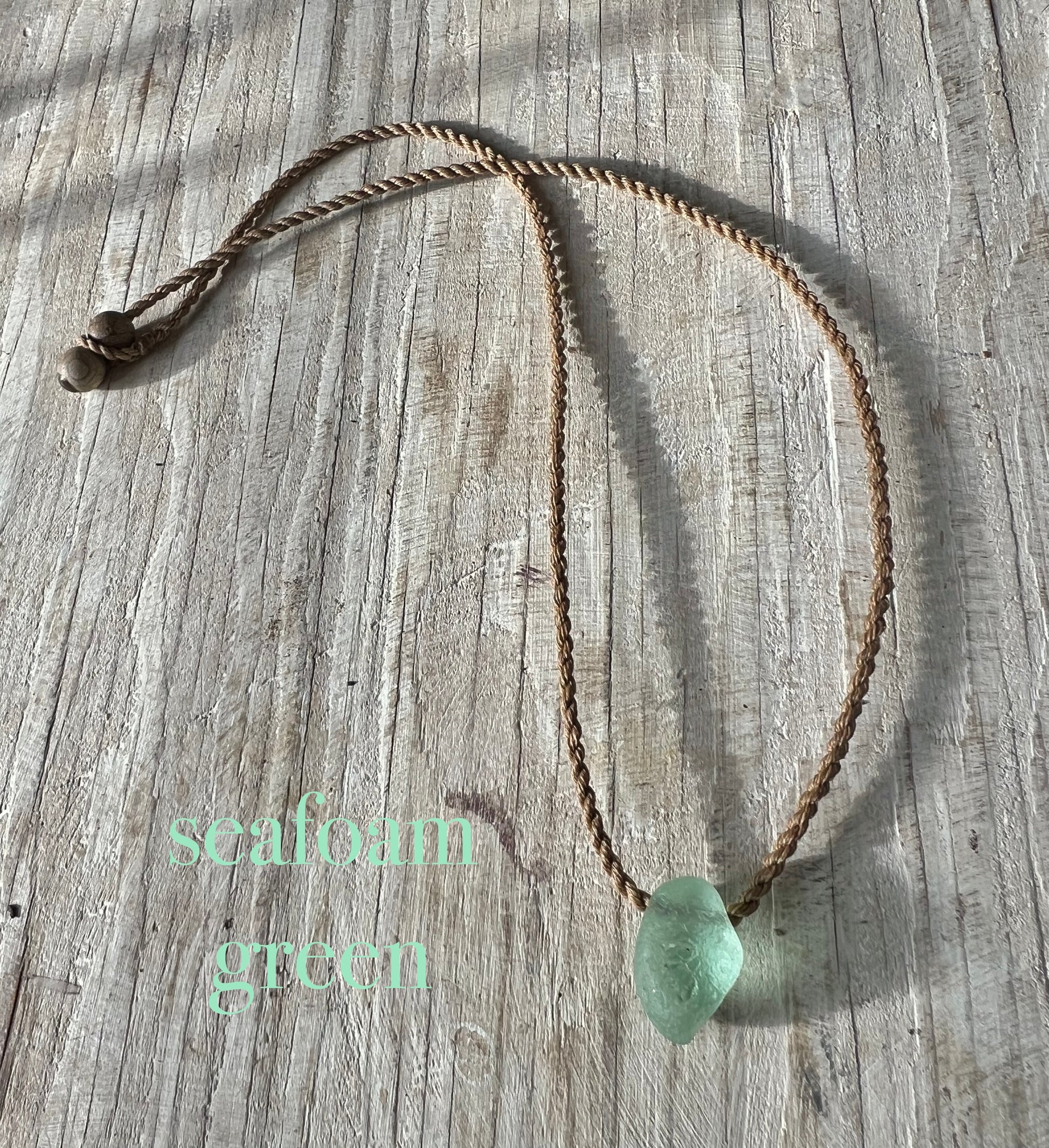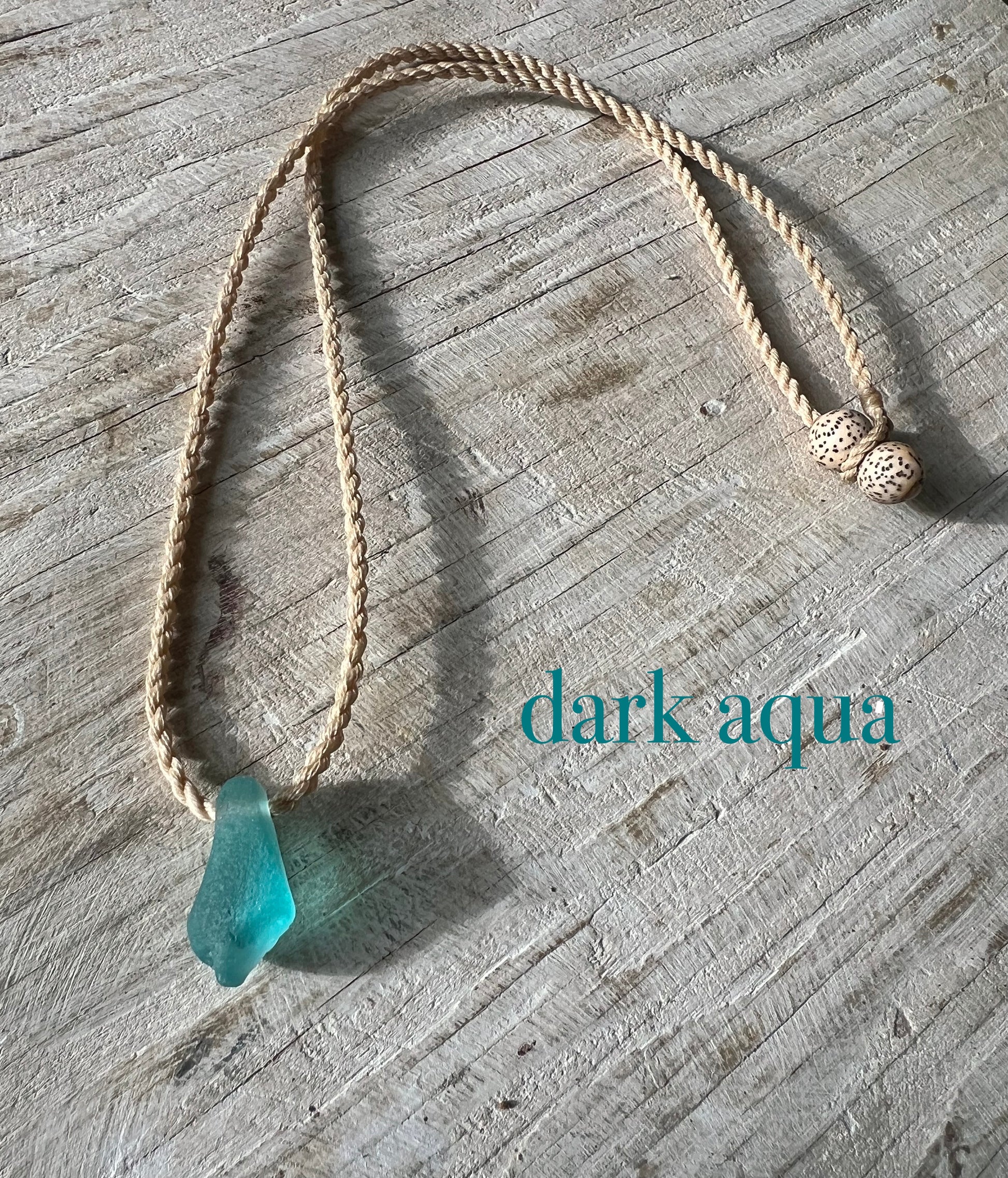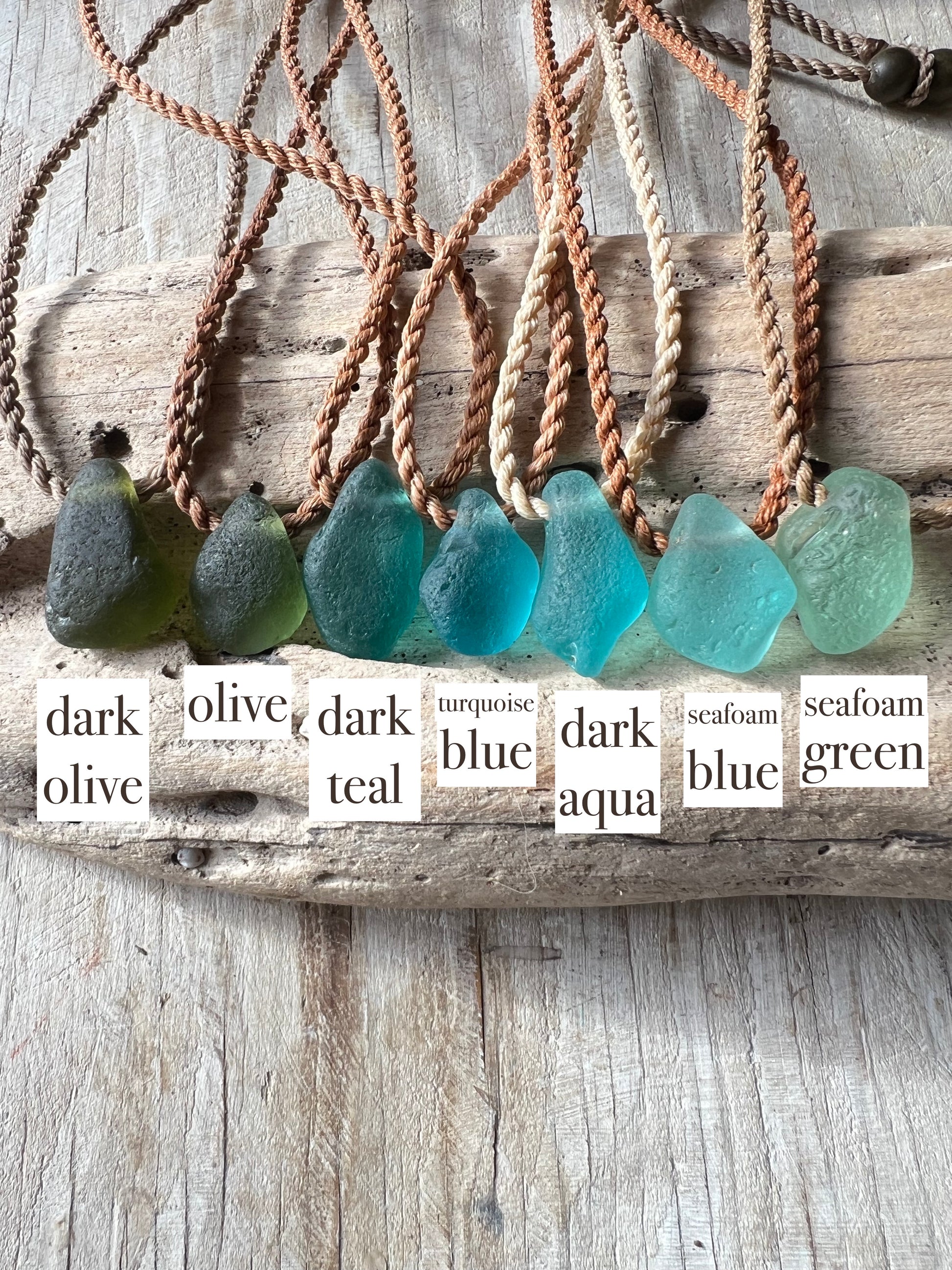 These sea glass pendant necklaces are nothing short of stunning. Their natural pendant shapes might make you think they were DESTINED for this! These pieces of (very old) sea glass have been drilled through the side so that they are able to "float" on their hand twisted rope cord. These gorgeous sea inspired colors absolutely GLOW in the sun.