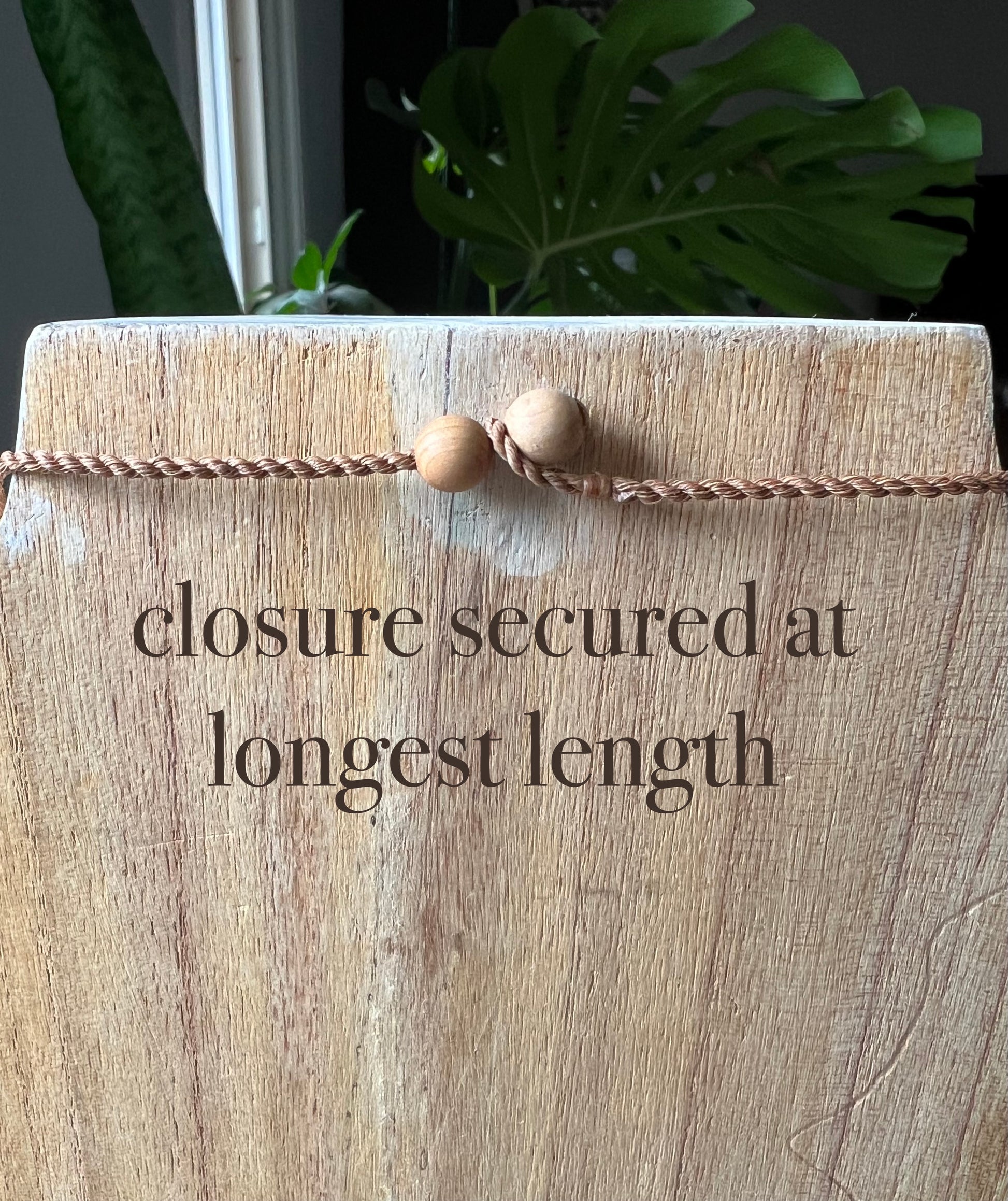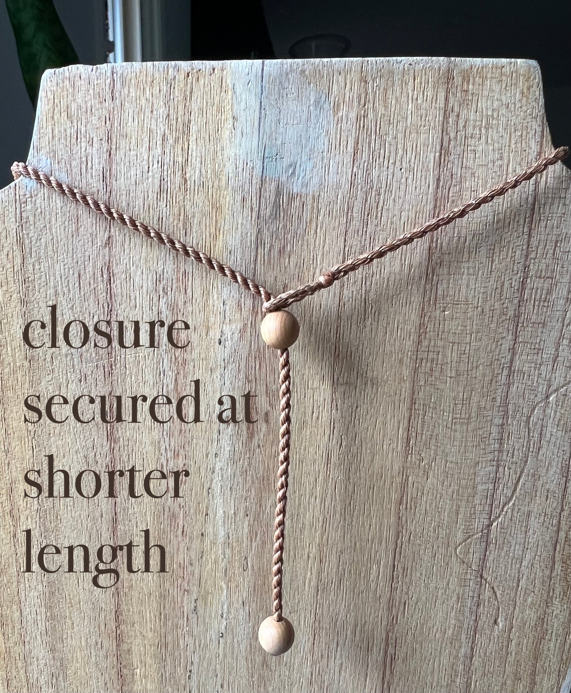 The semi adjustable closure allows you to set the perfect necklace length. Just use the top sliding wooden bead to shorten the overall length and recenter the sea glass on its cord. Please scroll through all pictures to see an example.