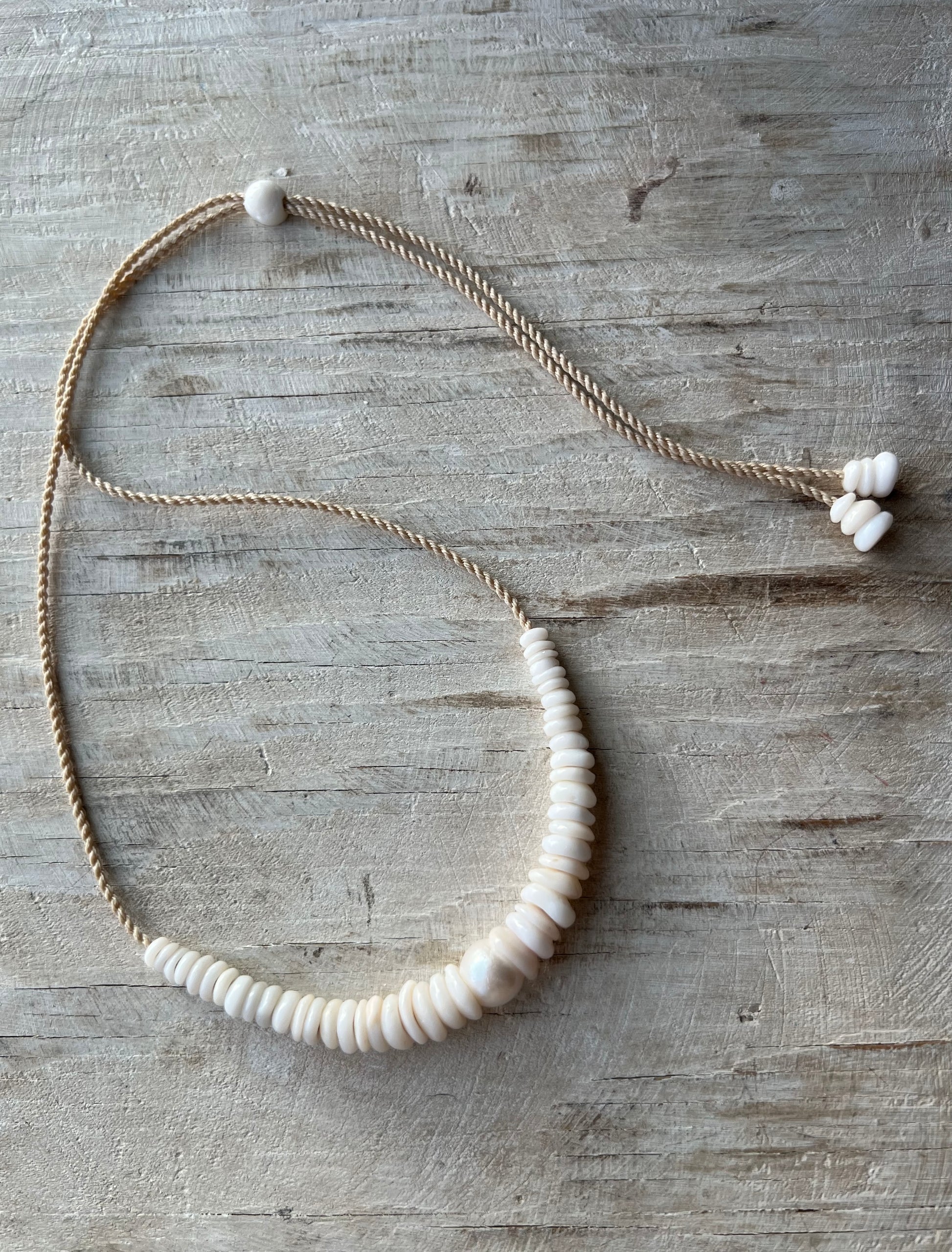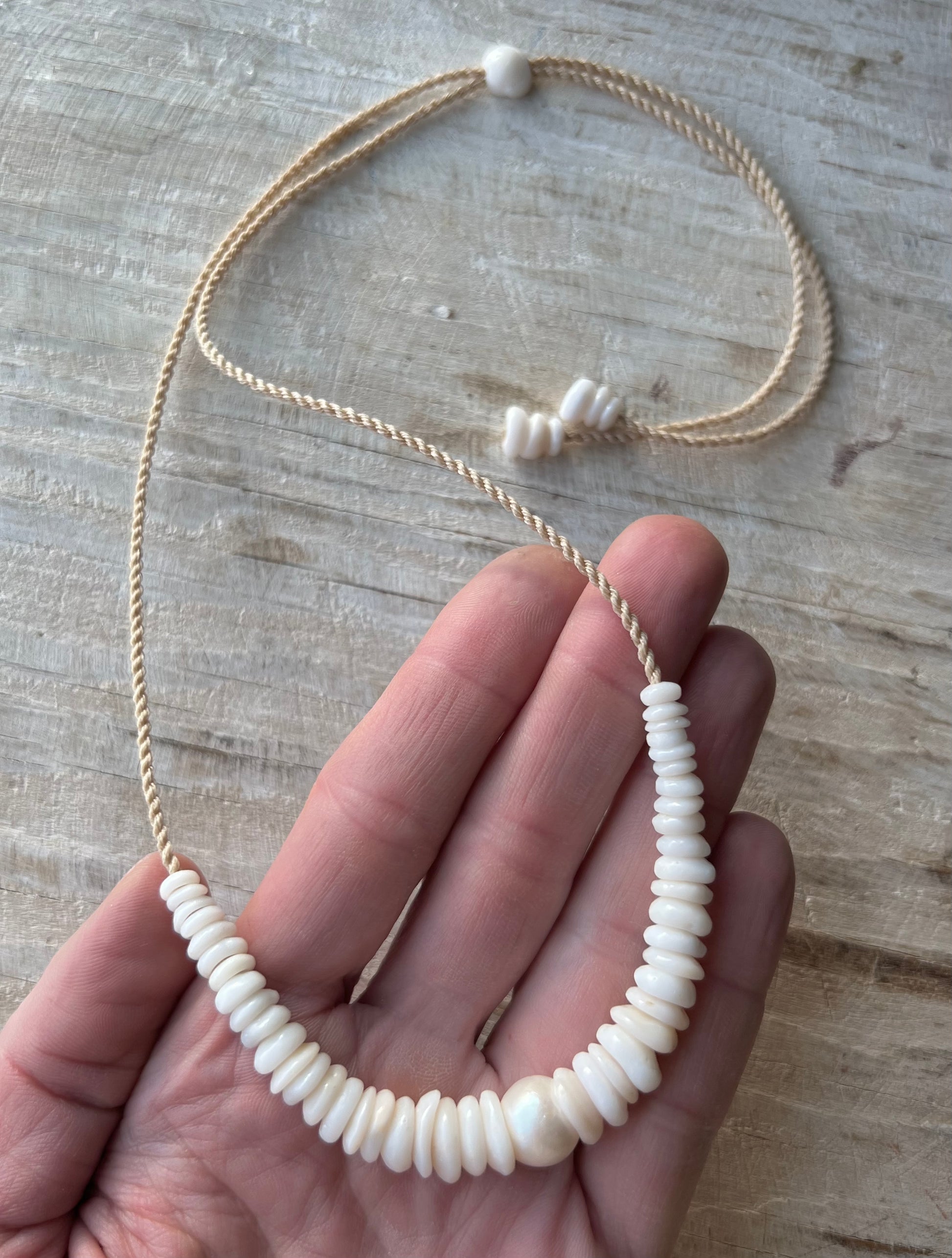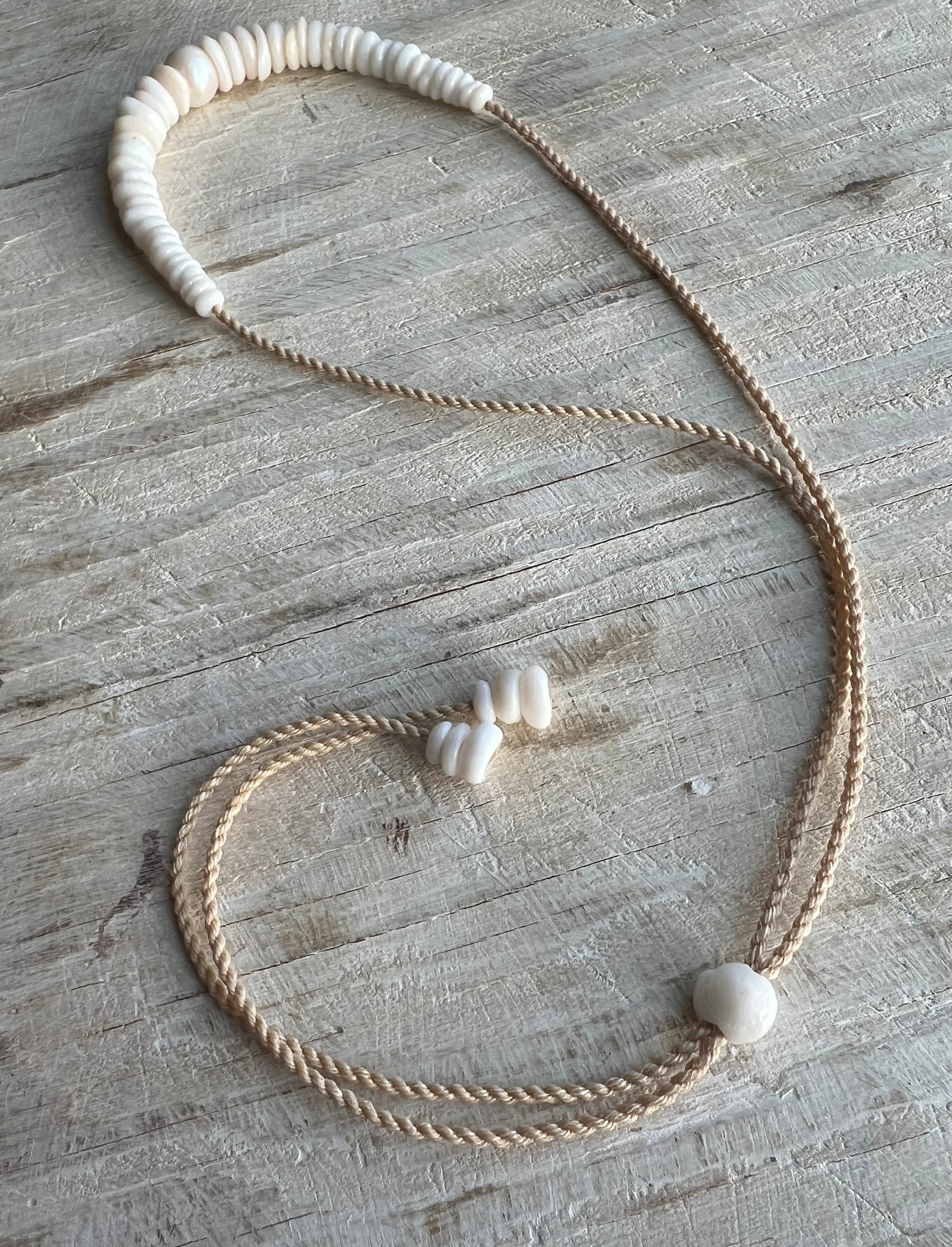 The secure adjustable closure is created using a cone top that has been drilled vertically. Each cord end is finished with 3 miniature pukas. The details and of this necklace are sweetly feminine as well as durable and functional.