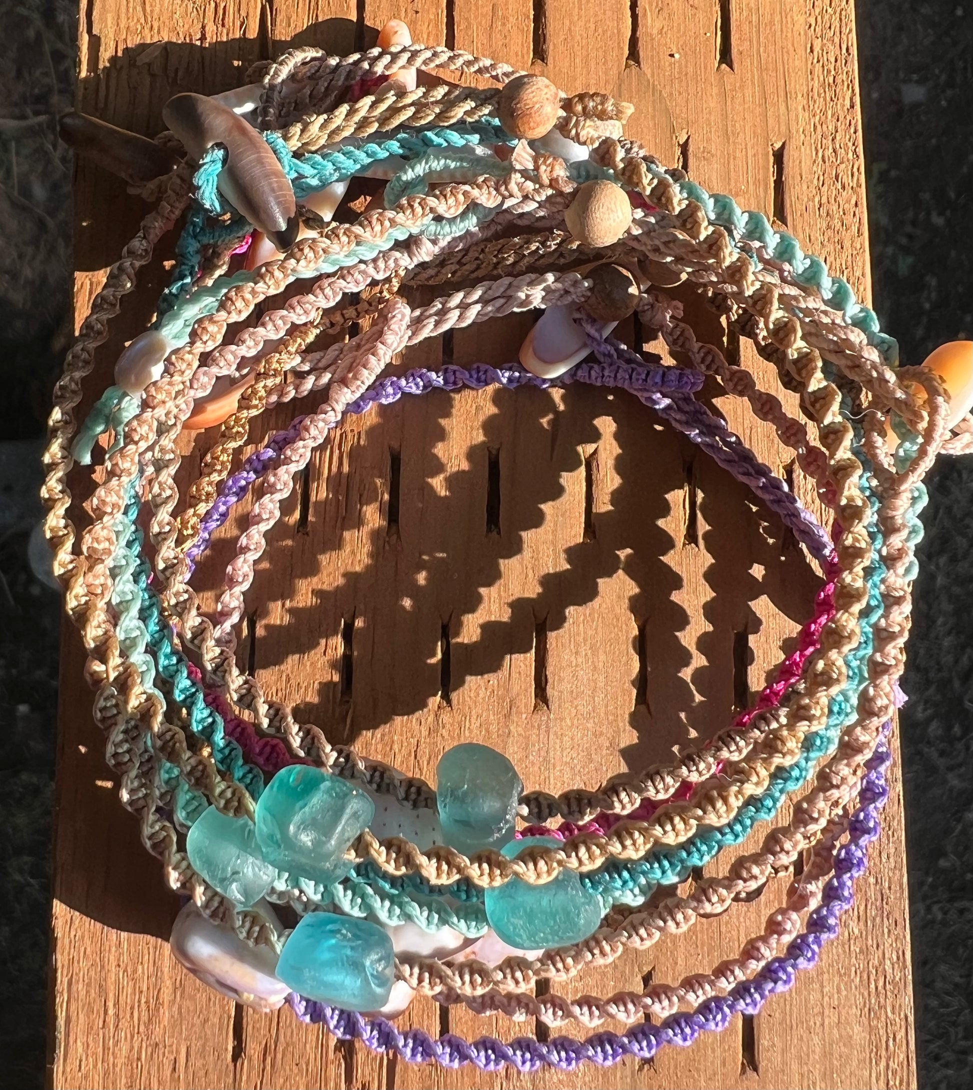A Maui found, surf tumbled cone shell float on hand knotted macrame cord made from bonded nylon. The secure toggle closure with cowrie lip blends into this simple and meaningful design, but still allows for easy on and off, AND it's adjustable! Just slide the small bead up or down to overlap more or less of the rope cord. Position the cowrie lip at the center of the overlap and voila! You have a perfect fit that doesn't need to be adjusted!