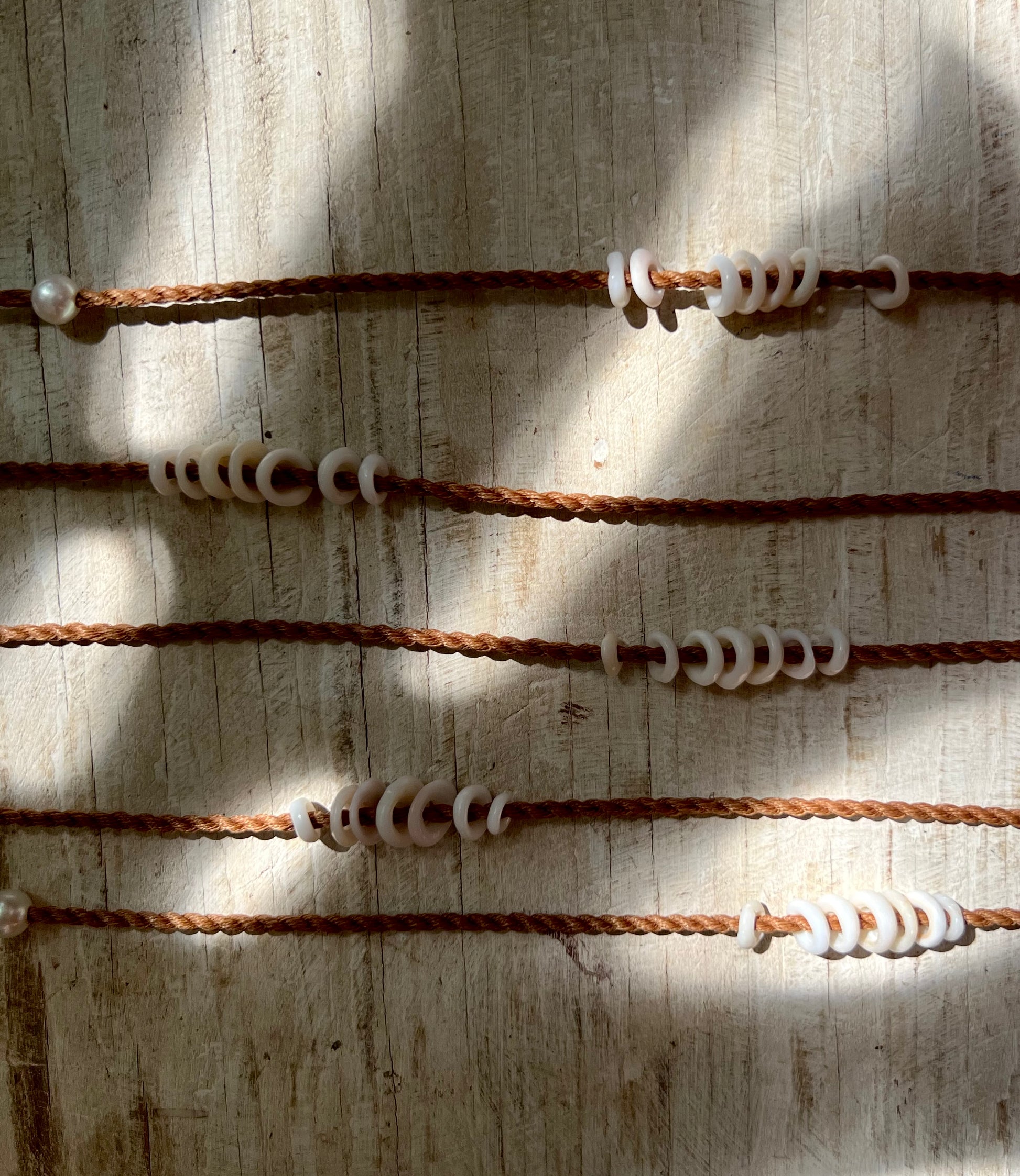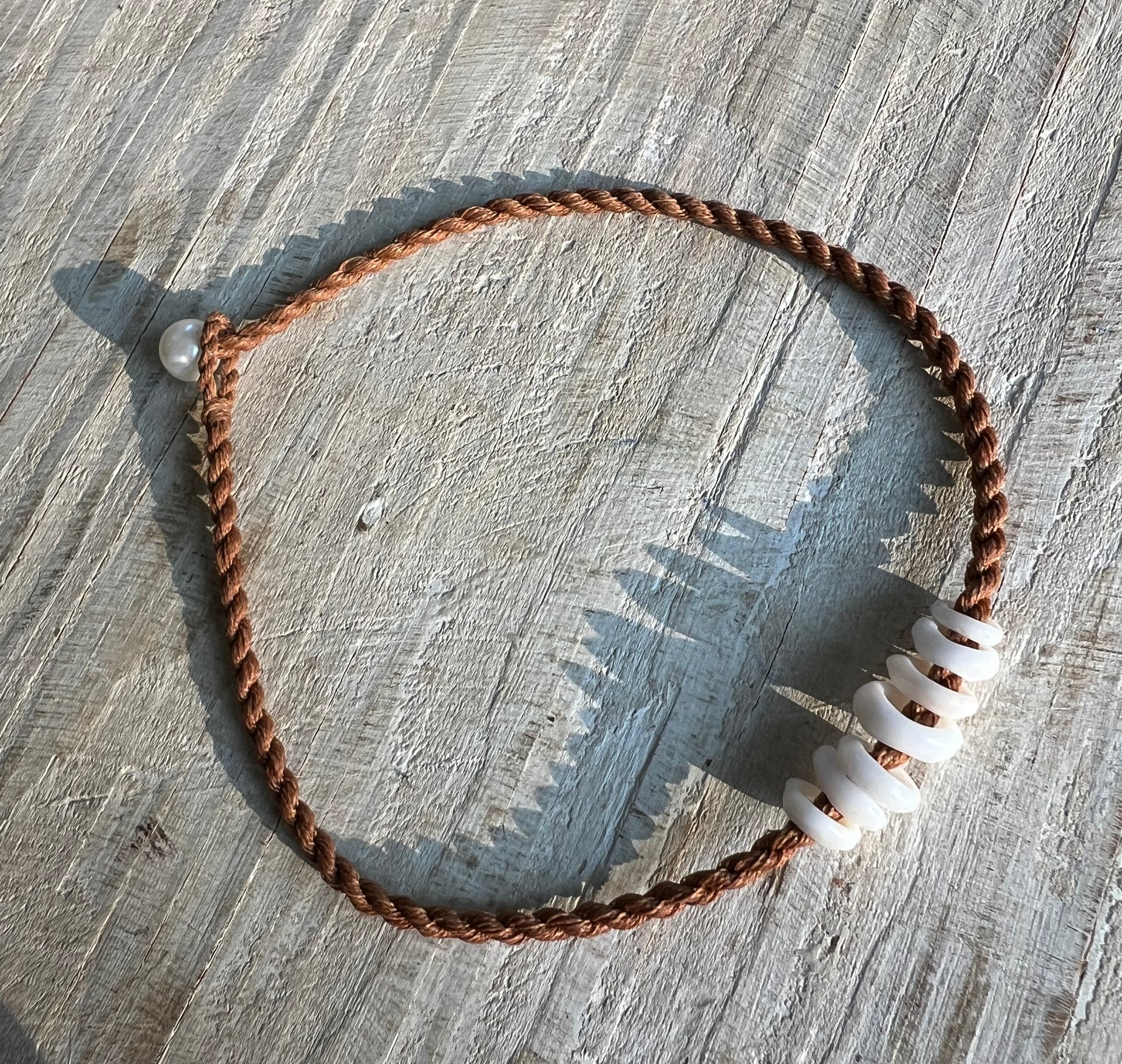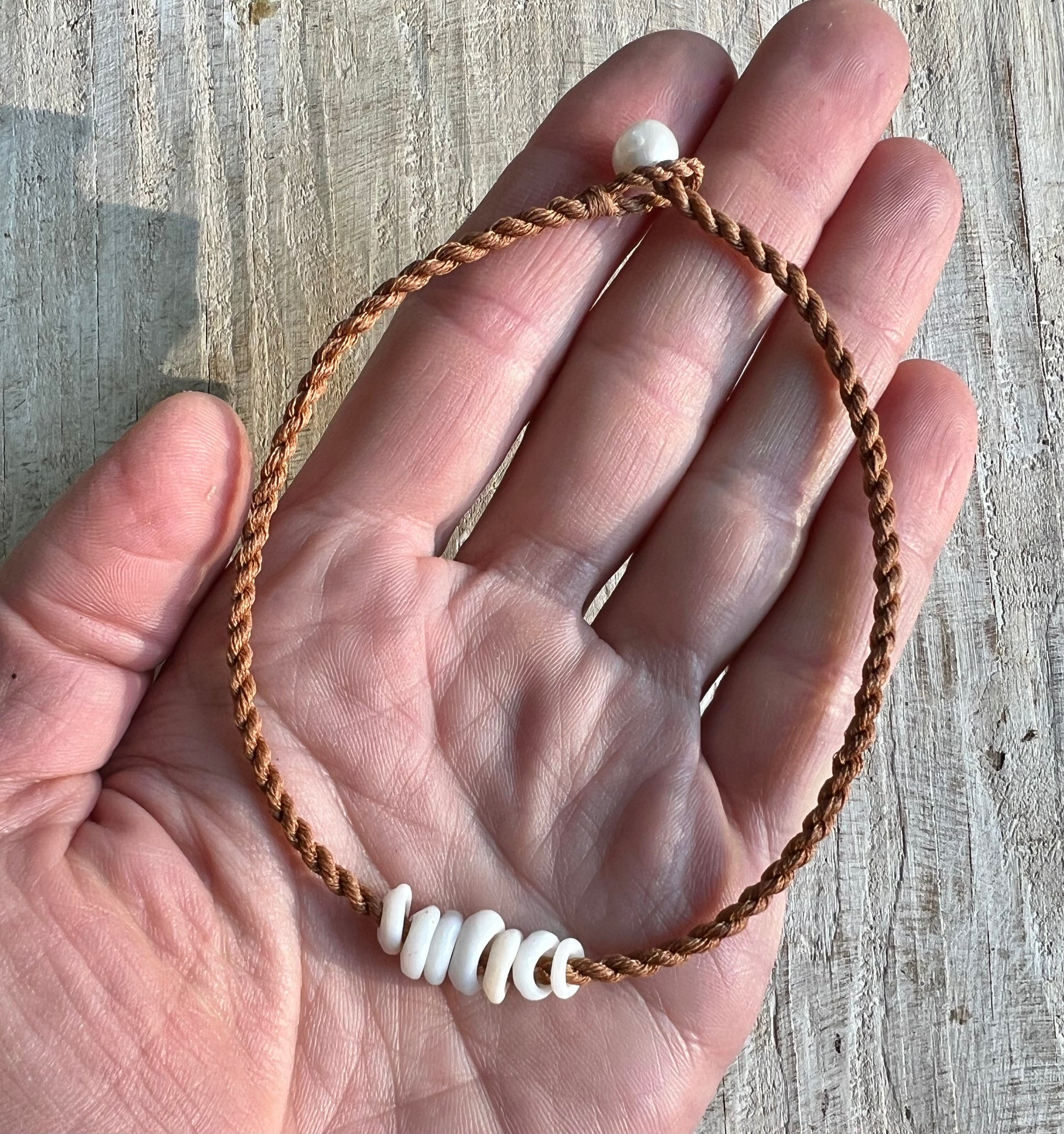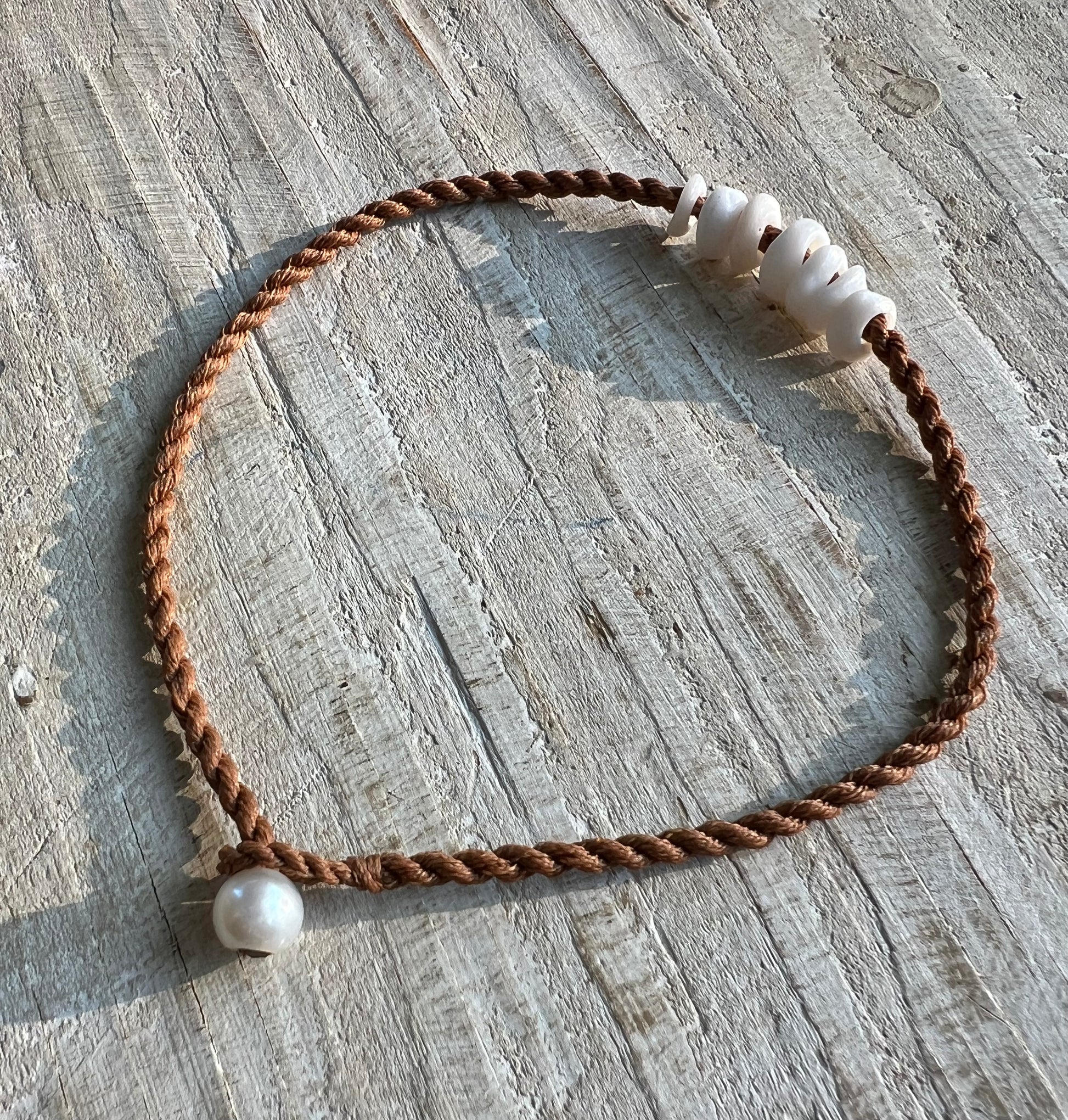 Each Hawaii Nei bracelet is strung on hand twisted 8 ply rope (made from flat waxed polyester thread) in a warm shade of medium brown. The secure and easy to use closure is created from a single pearl and a small loop. Just push the pearl in or out to put on or take off.