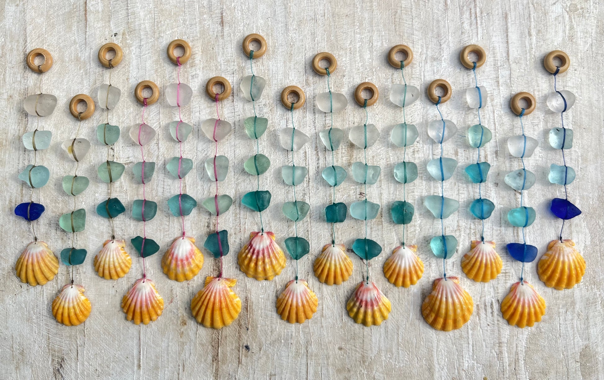 Each Kahiko is made of 4 pieces of chunky, vibrant, surf tumbled sea glass, hand strung on colorful nylon cord. These sun catchers will sparkle brilliantly in bright, indirect, natural light.