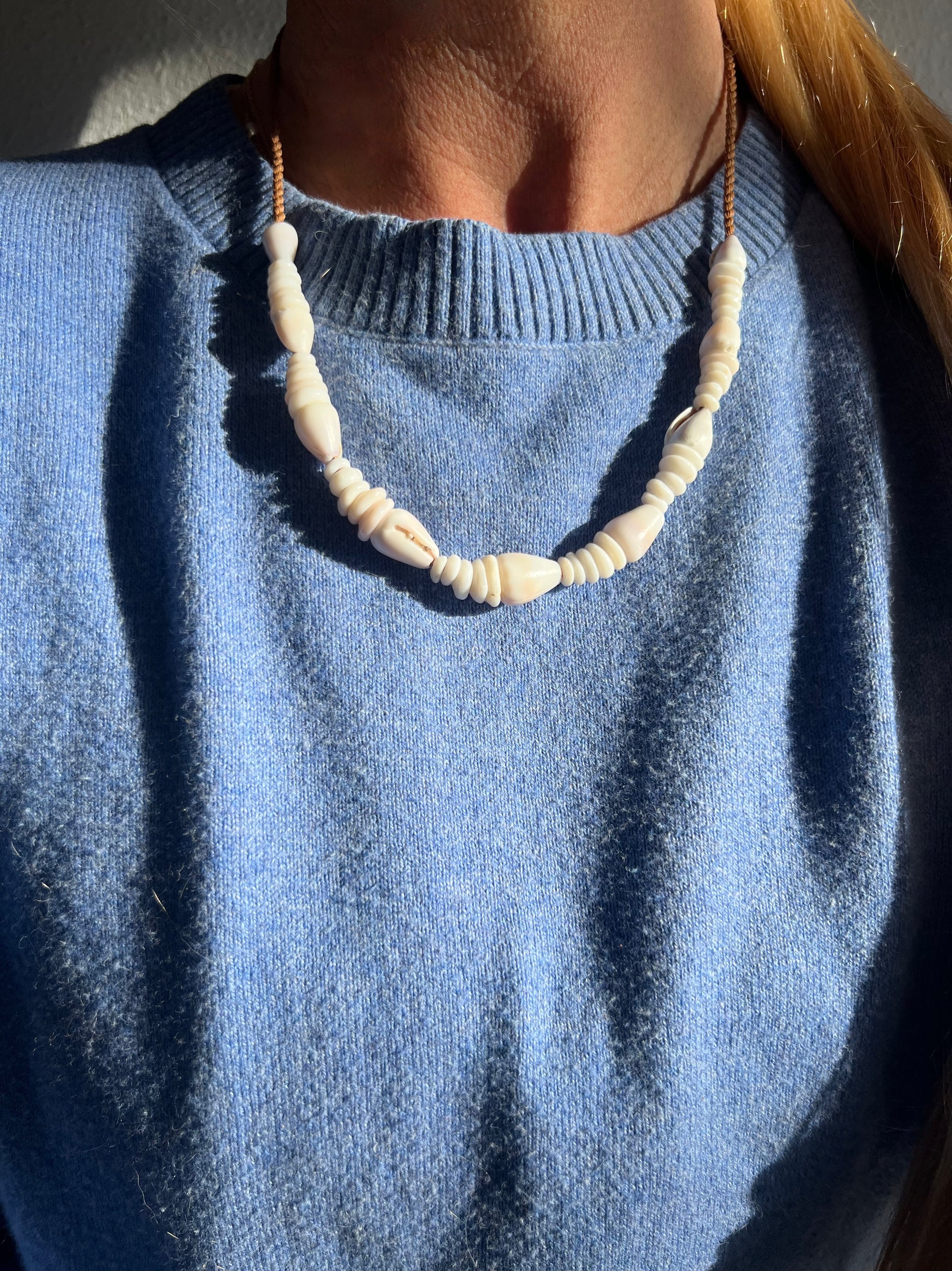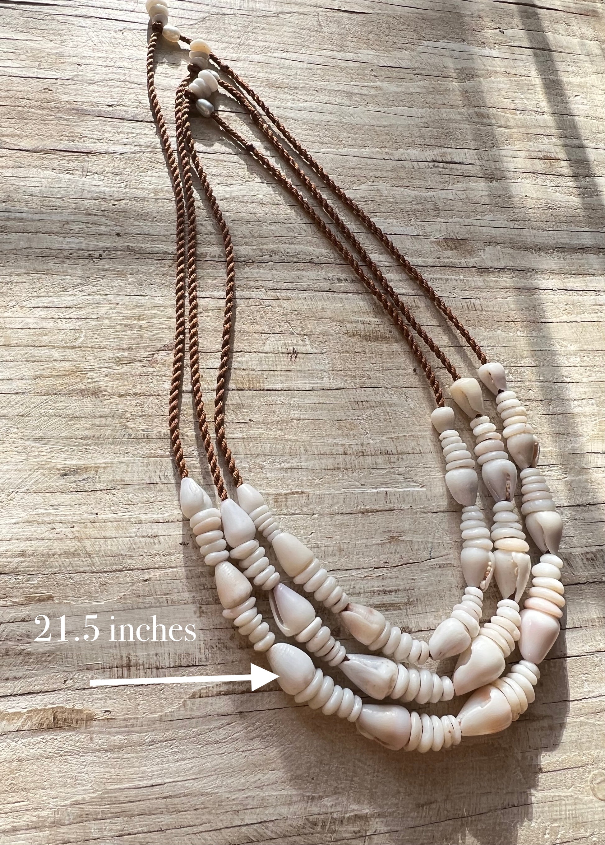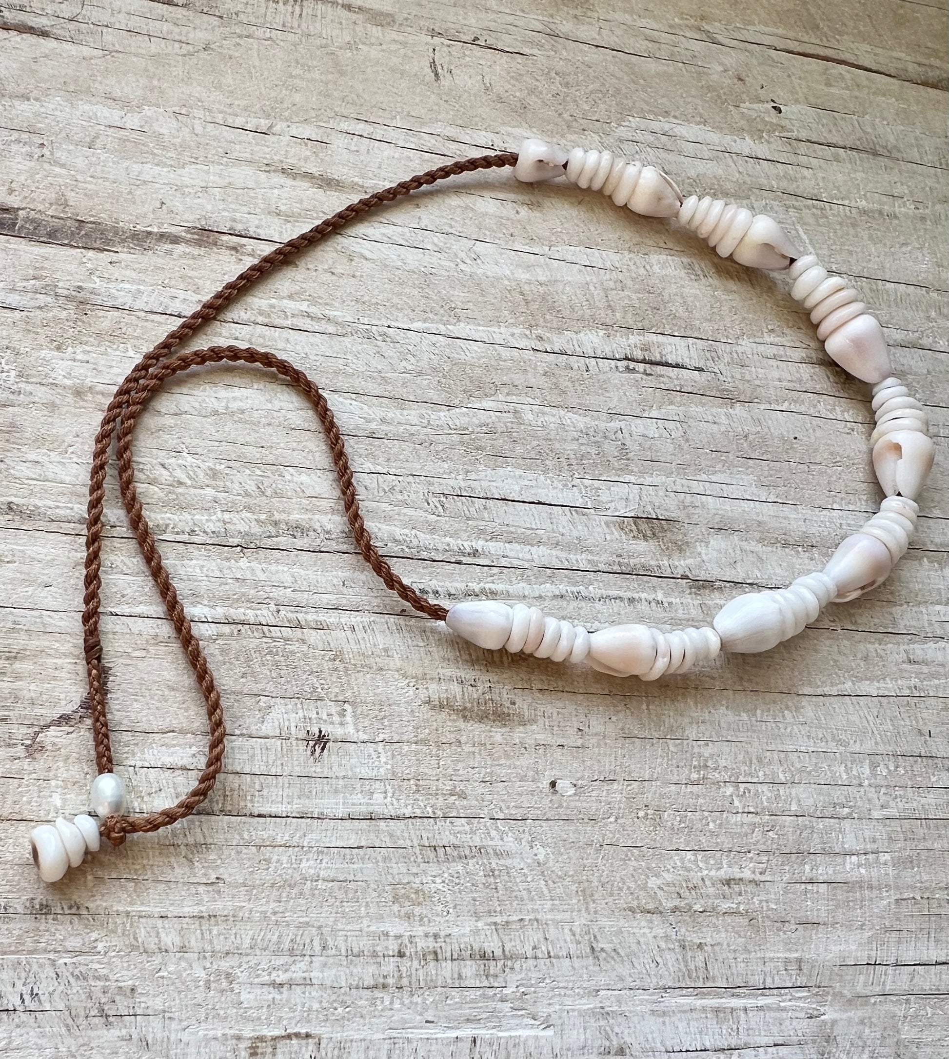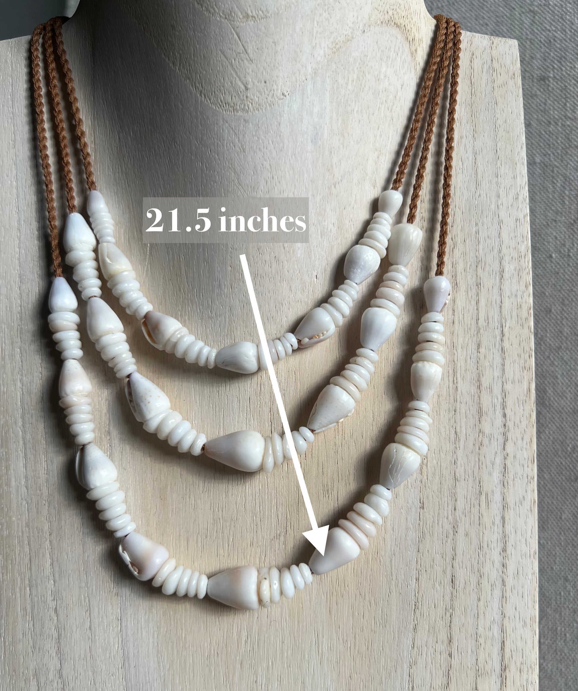 The cone shells and pukas used in this necklace are well tumbled, polished to perfection, and vary in their natural hues from bright white to light pastels. The strung shell detail measures 7 inches, leaving 5.75 inches of exposed rope cord on either size.