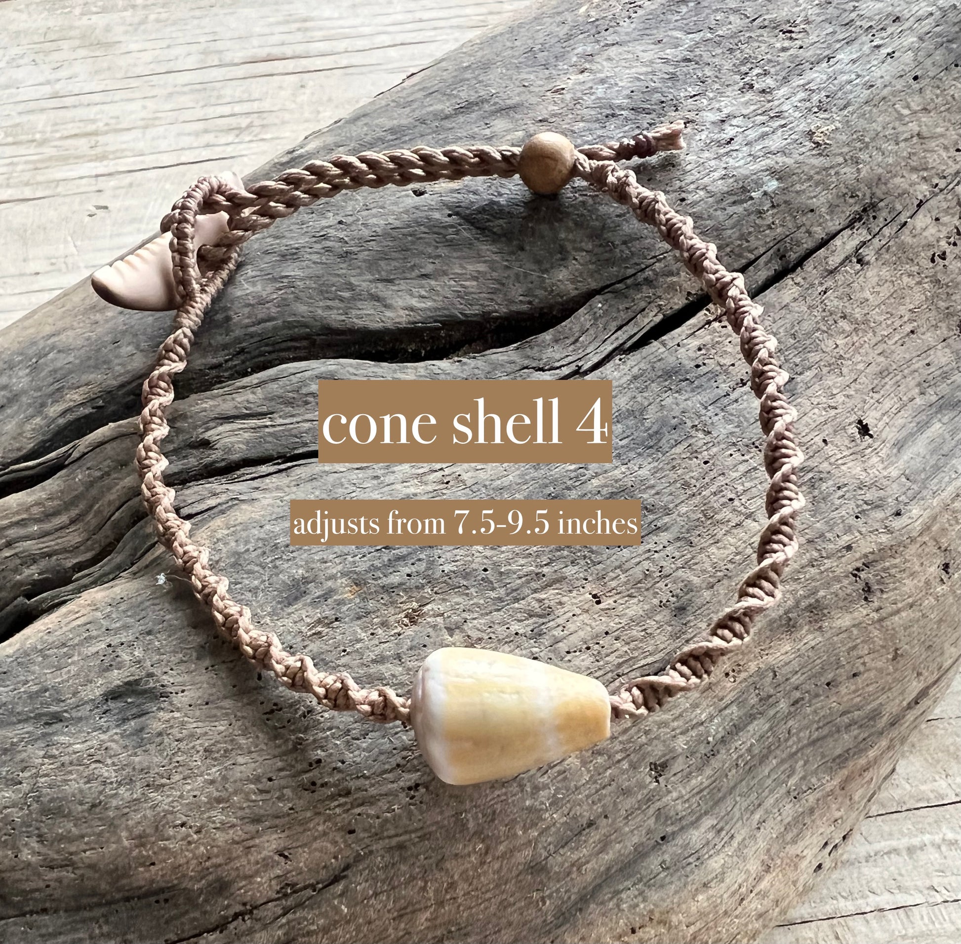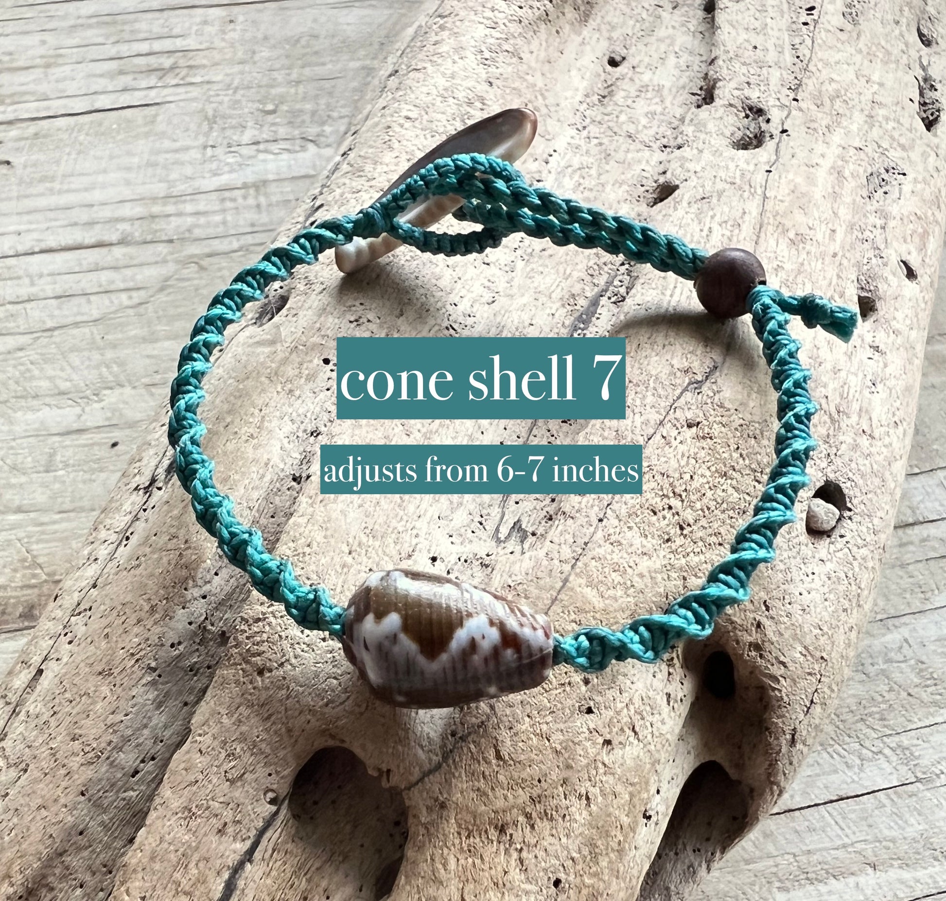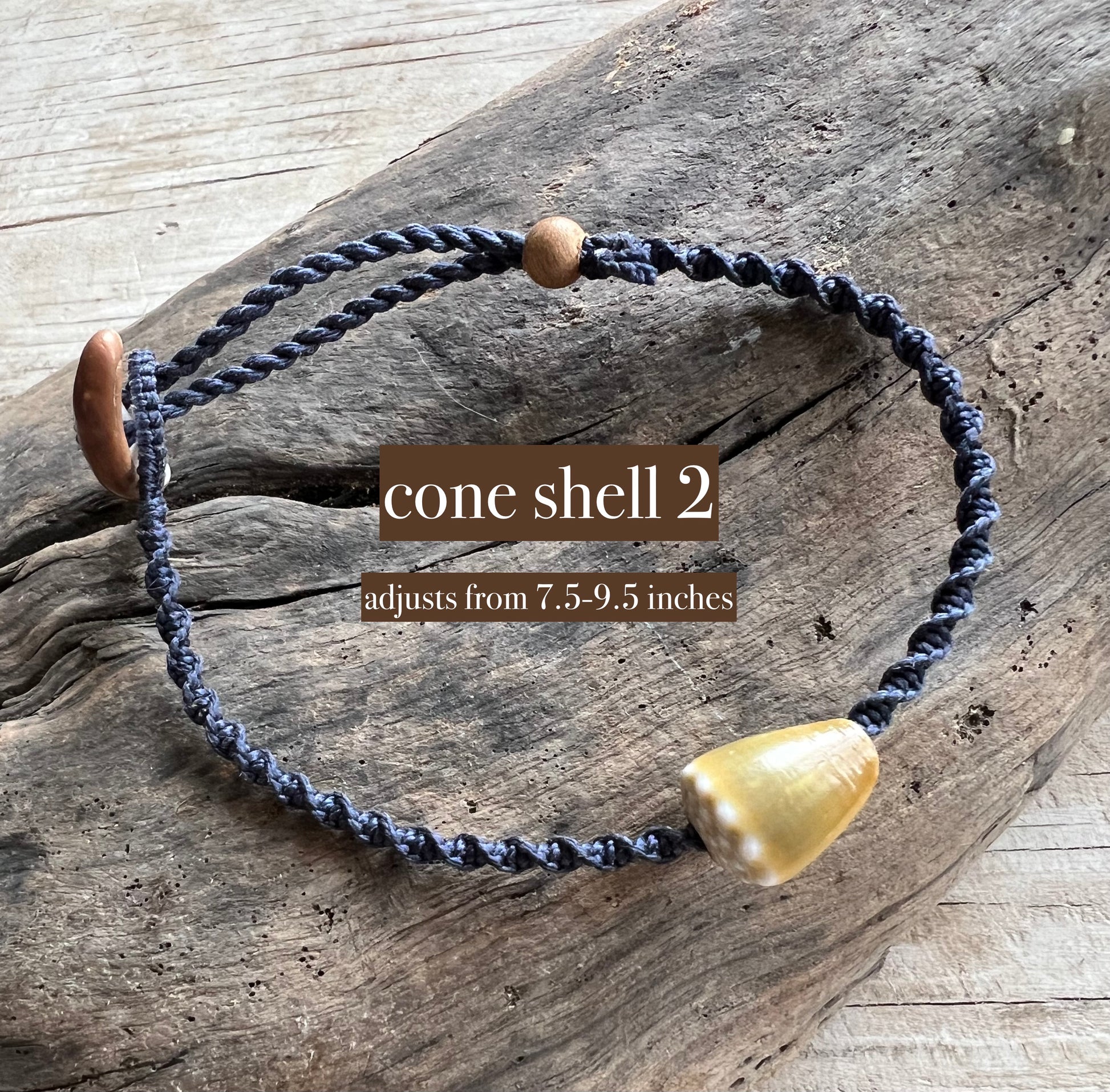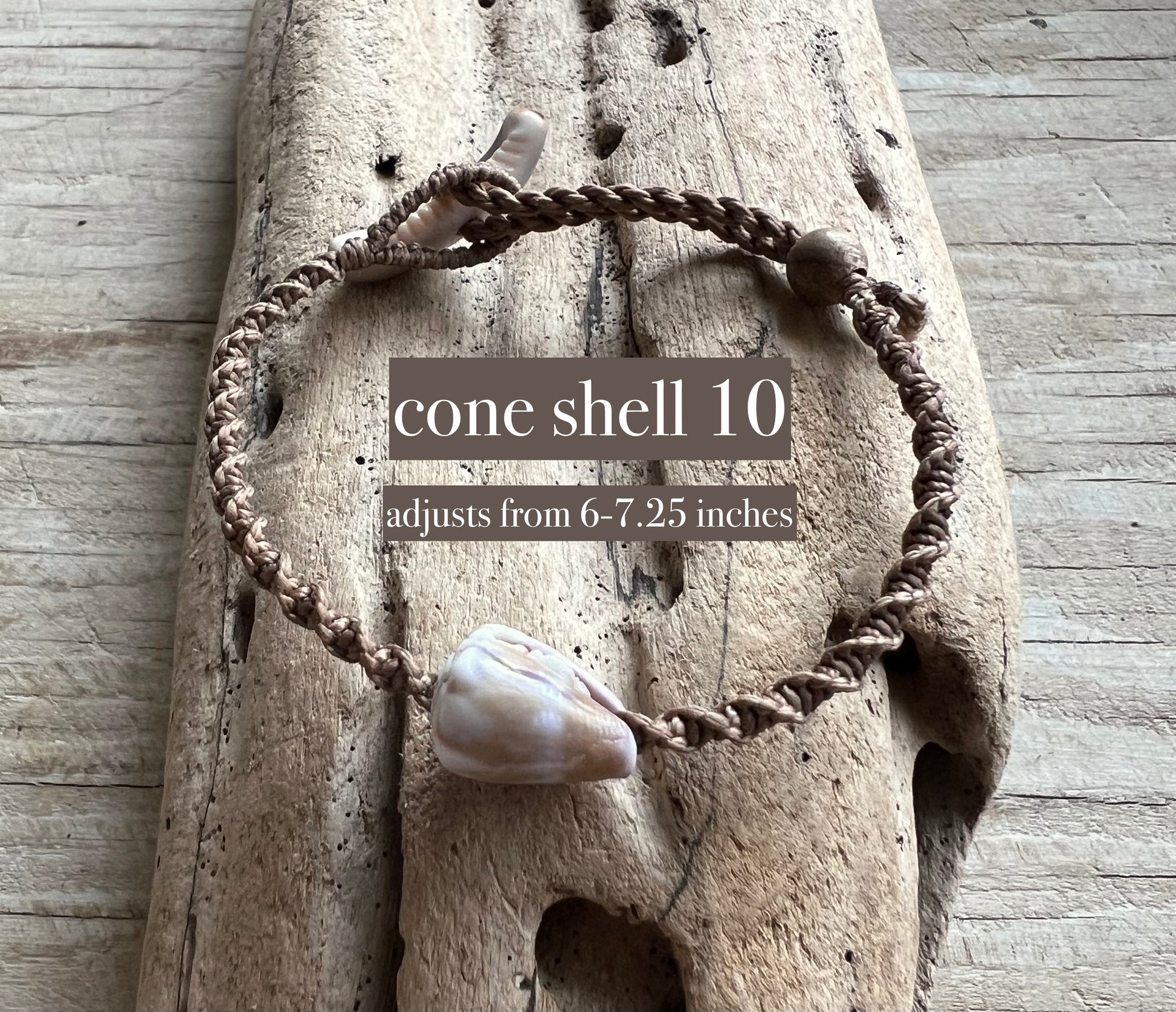 A Maui found, surf tumbled cone shell float on hand knotted macrame cord made from bonded nylon. The secure toggle closure with cowrie lip blends into this simple and meaningful design, but still allows for easy on and off, AND it's adjustable! Just slide the small bead up or down to overlap more or less of the rope cord. Position the cowrie lip at the center of the overlap and voila! You have a perfect fit that doesn't need to be adjusted!