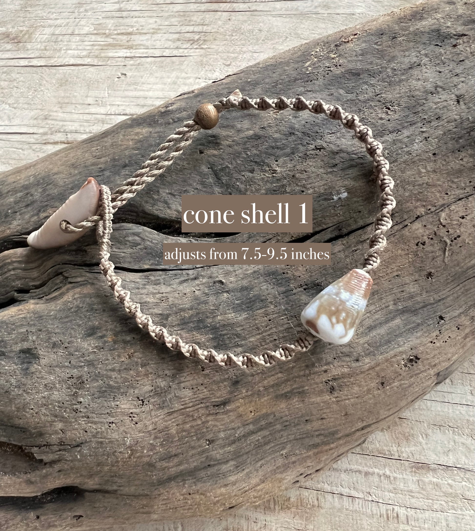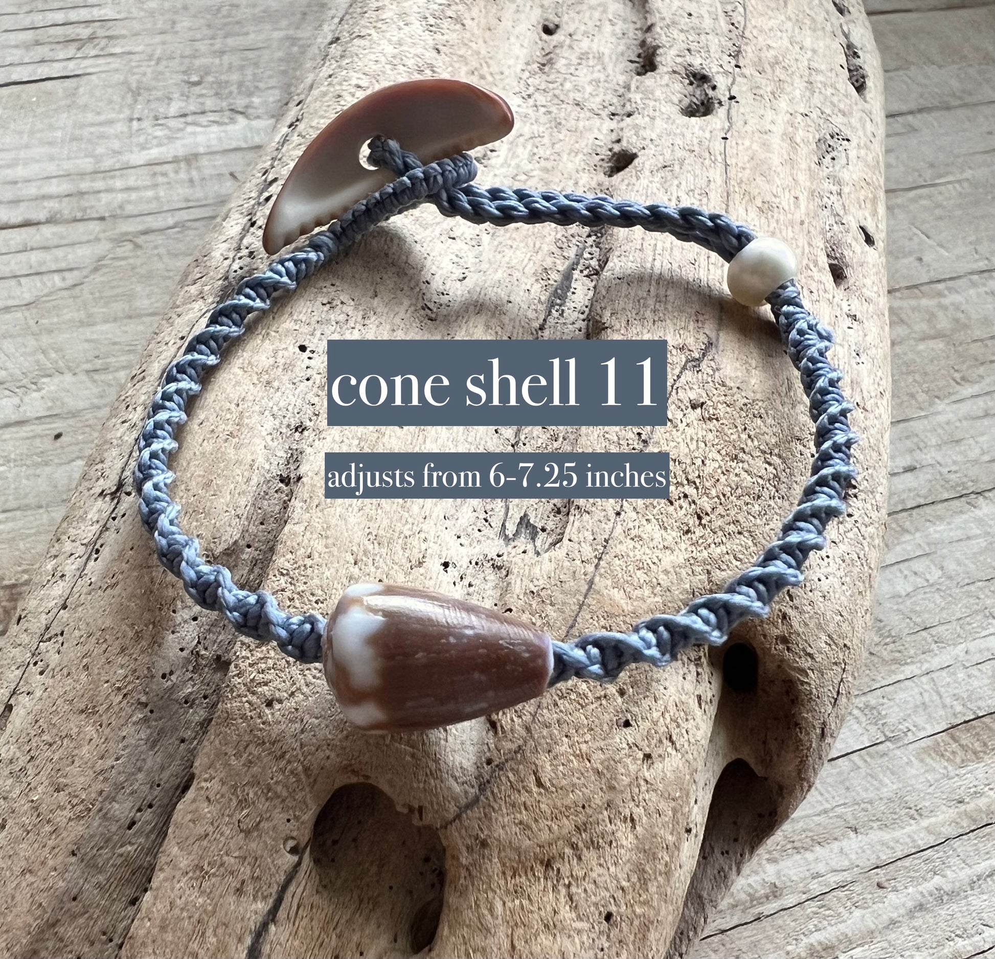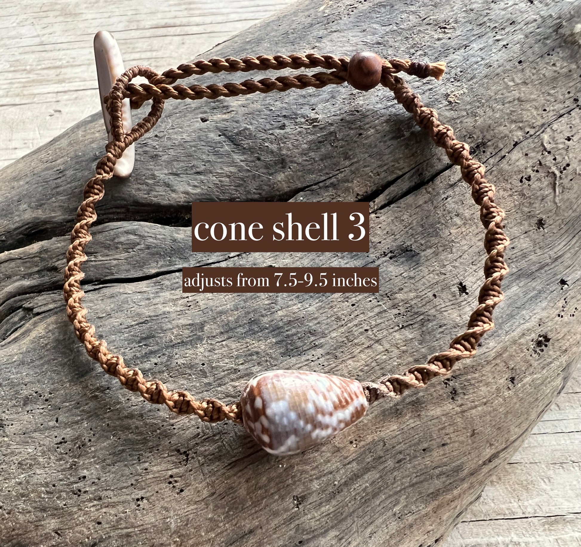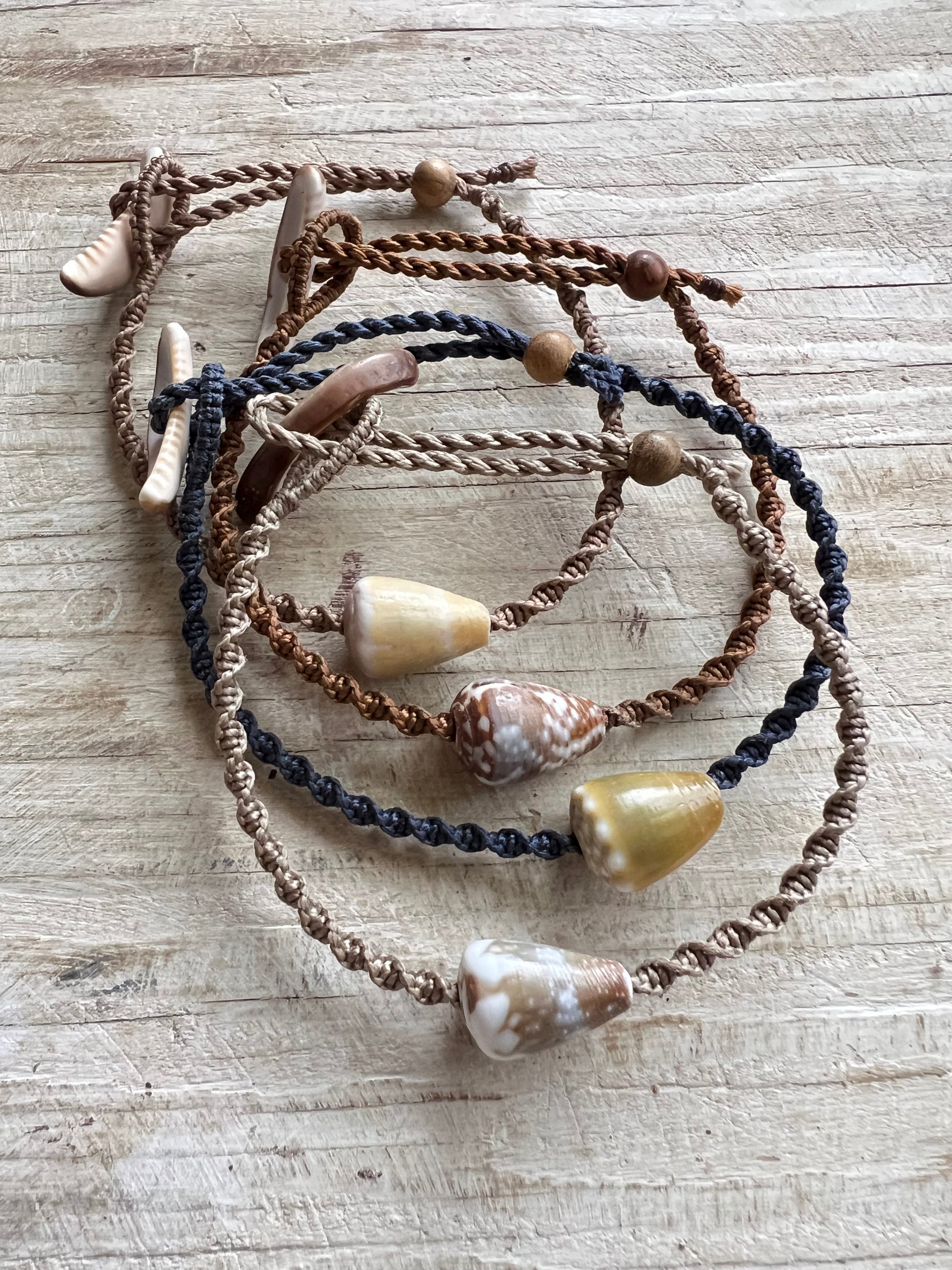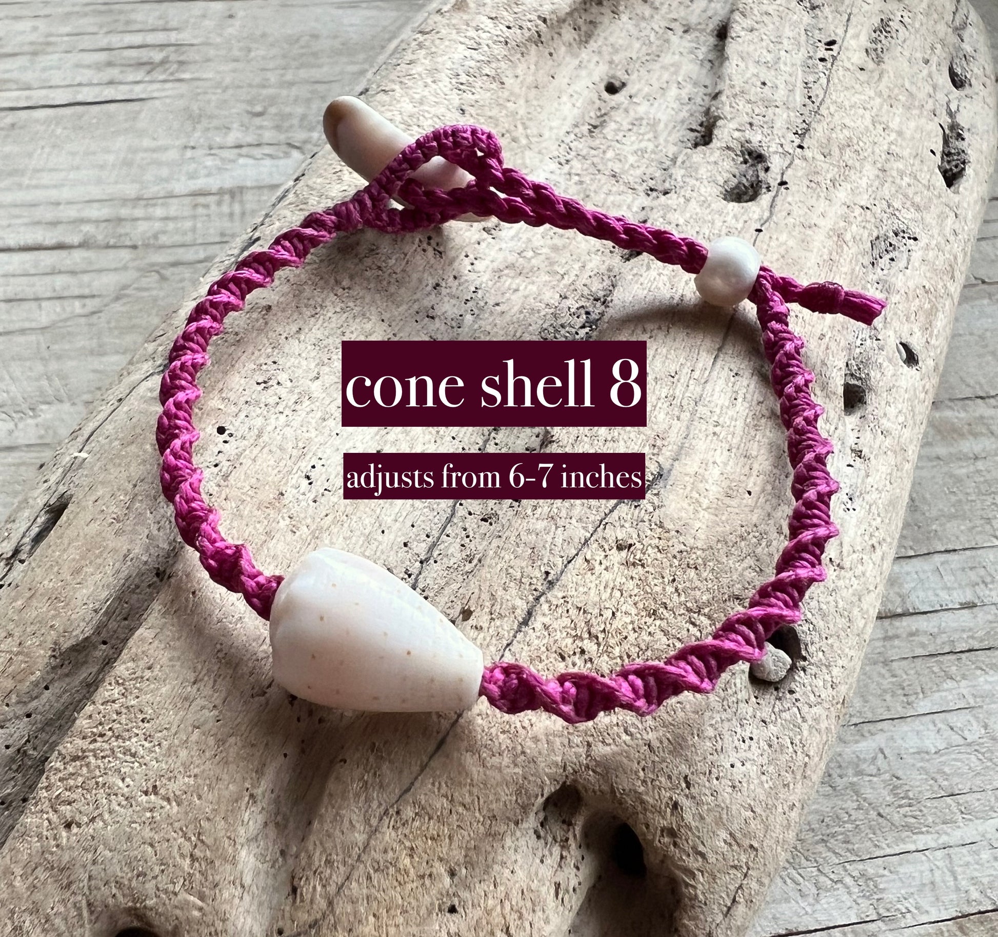 A Maui found, surf tumbled cone shell float on hand knotted macrame cord made from bonded nylon. The secure toggle closure with cowrie lip blends into this simple and meaningful design, but still allows for easy on and off, AND it's adjustable! Just slide the small bead up or down to overlap more or less of the rope cord. Position the cowrie lip at the center of the overlap and voila! You have a perfect fit that doesn't need to be adjusted!