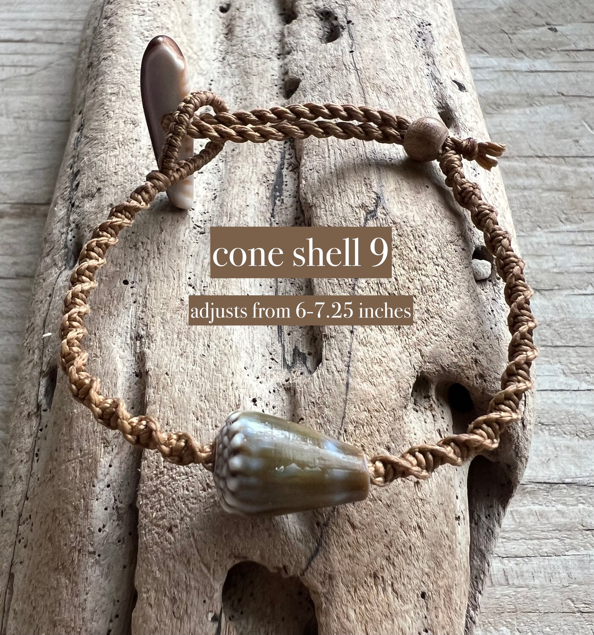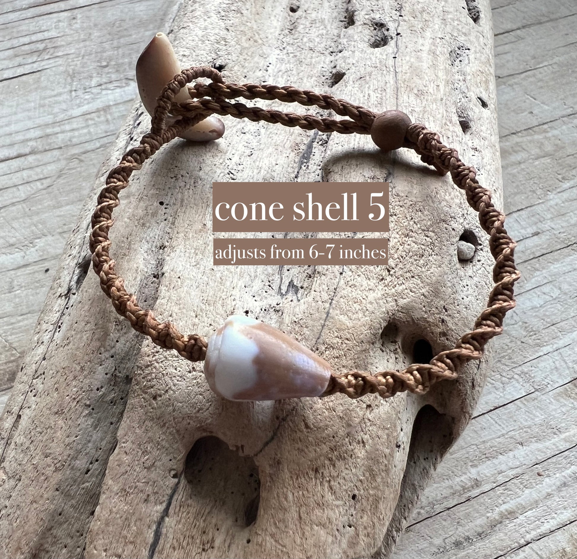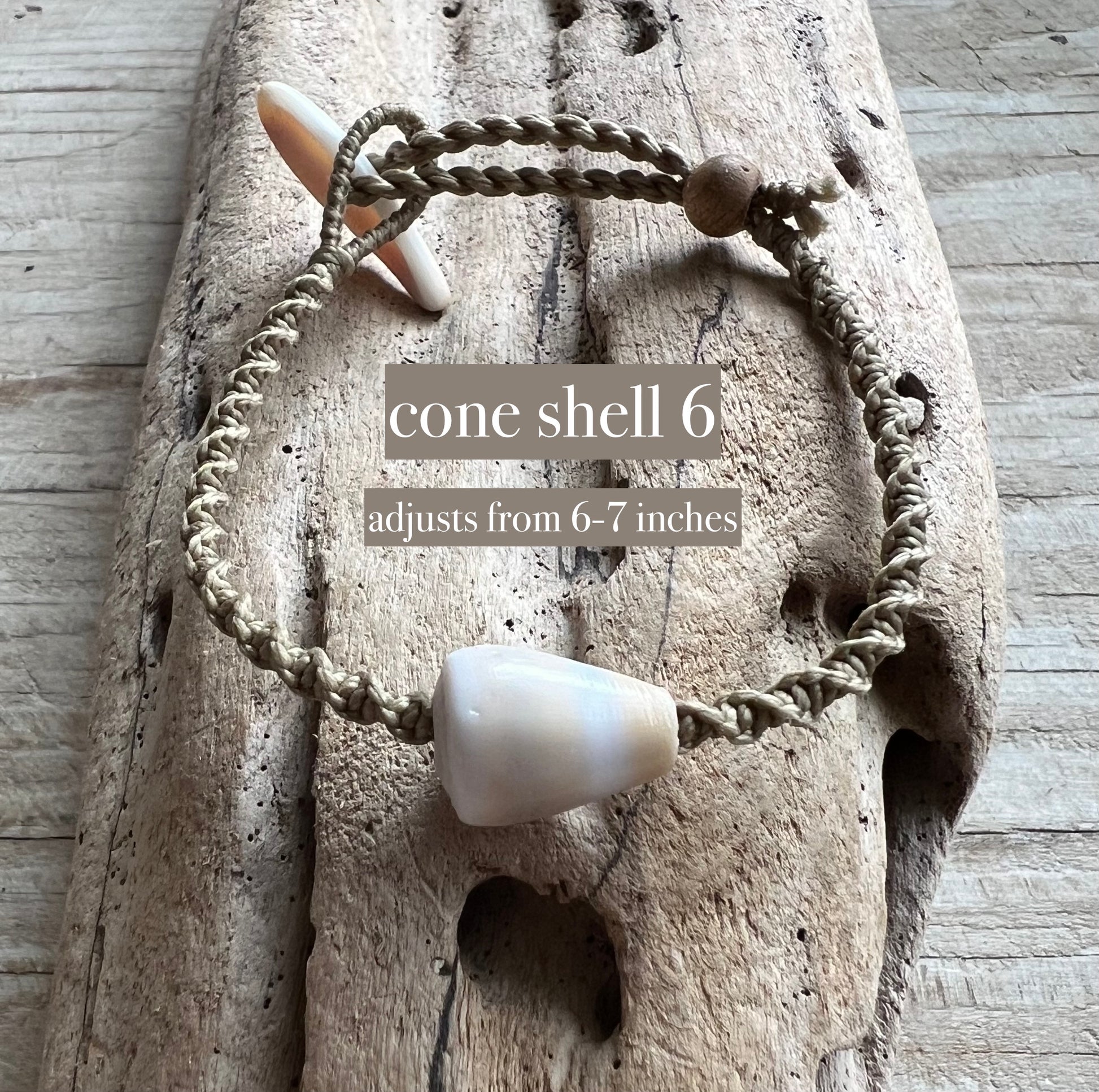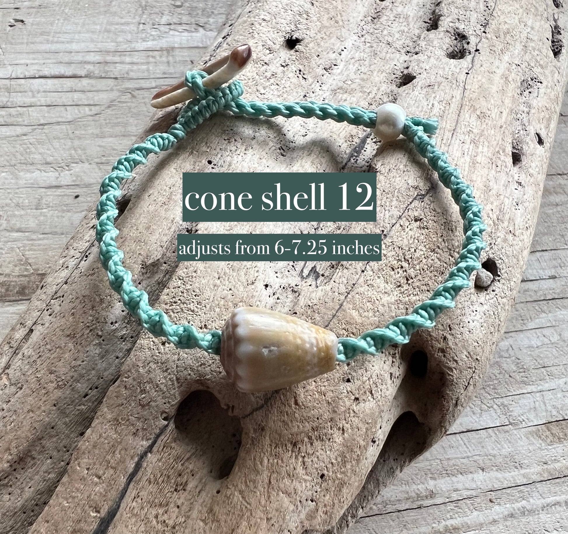 A Maui found, surf tumbled cone shell float on hand knotted macrame cord made from bonded nylon. The secure toggle closure with cowrie lip blends into this simple and meaningful design, but still allows for easy on and off, AND it's adjustable! Just slide the small bead up or down to overlap more or less of the rope cord. Position the cowrie lip at the center of the overlap and voila! You have a perfect fit that doesn't need to be adjusted!