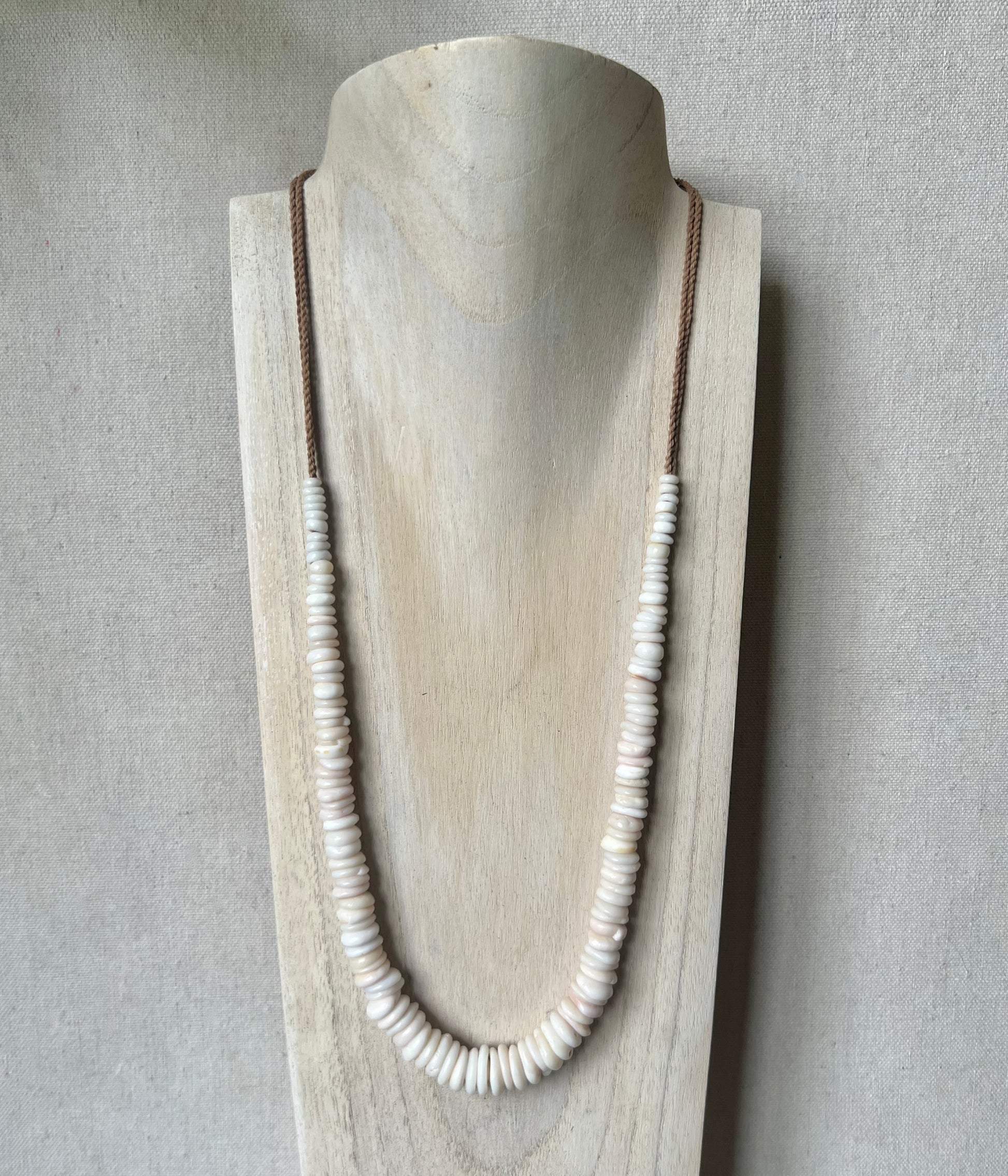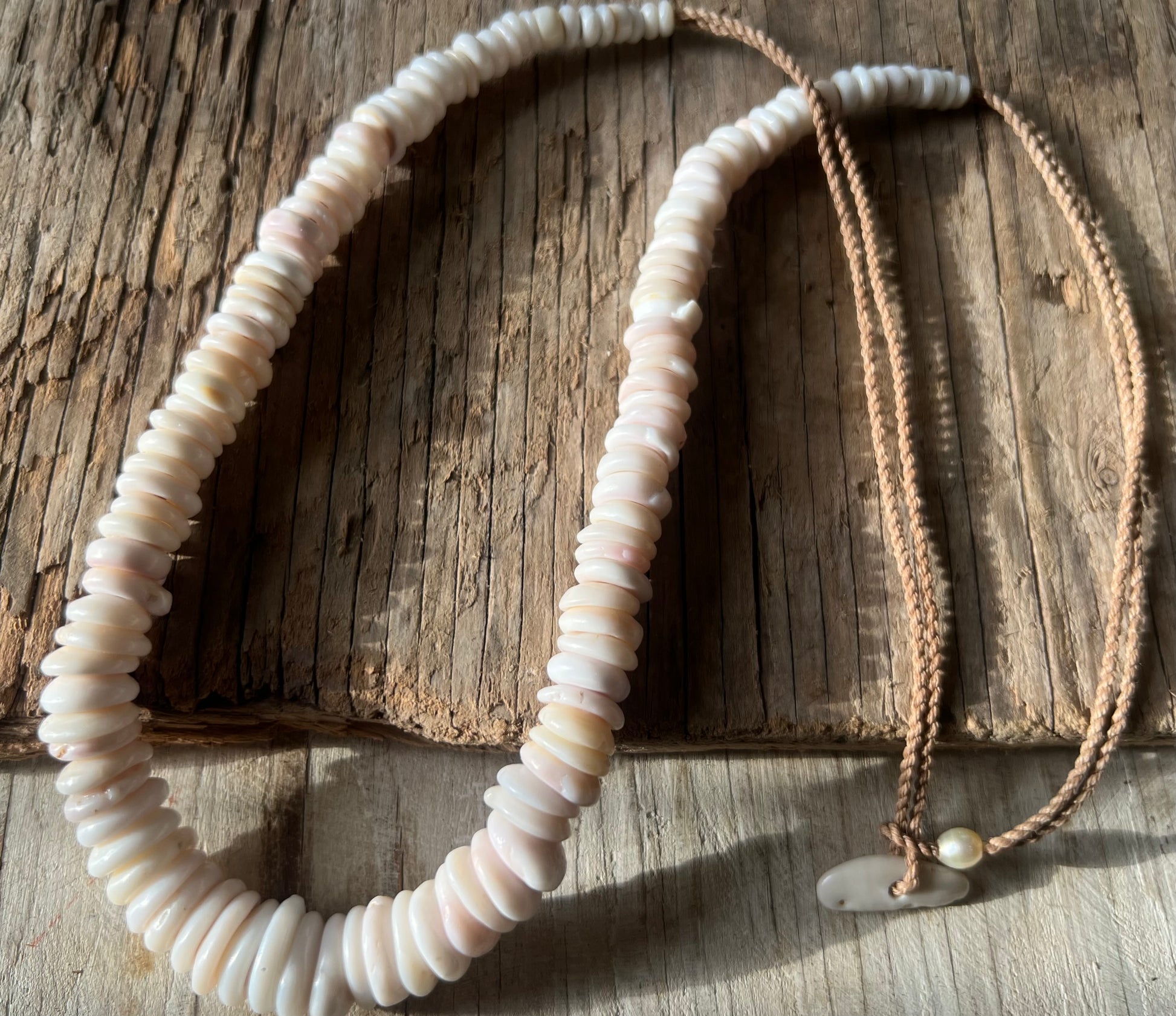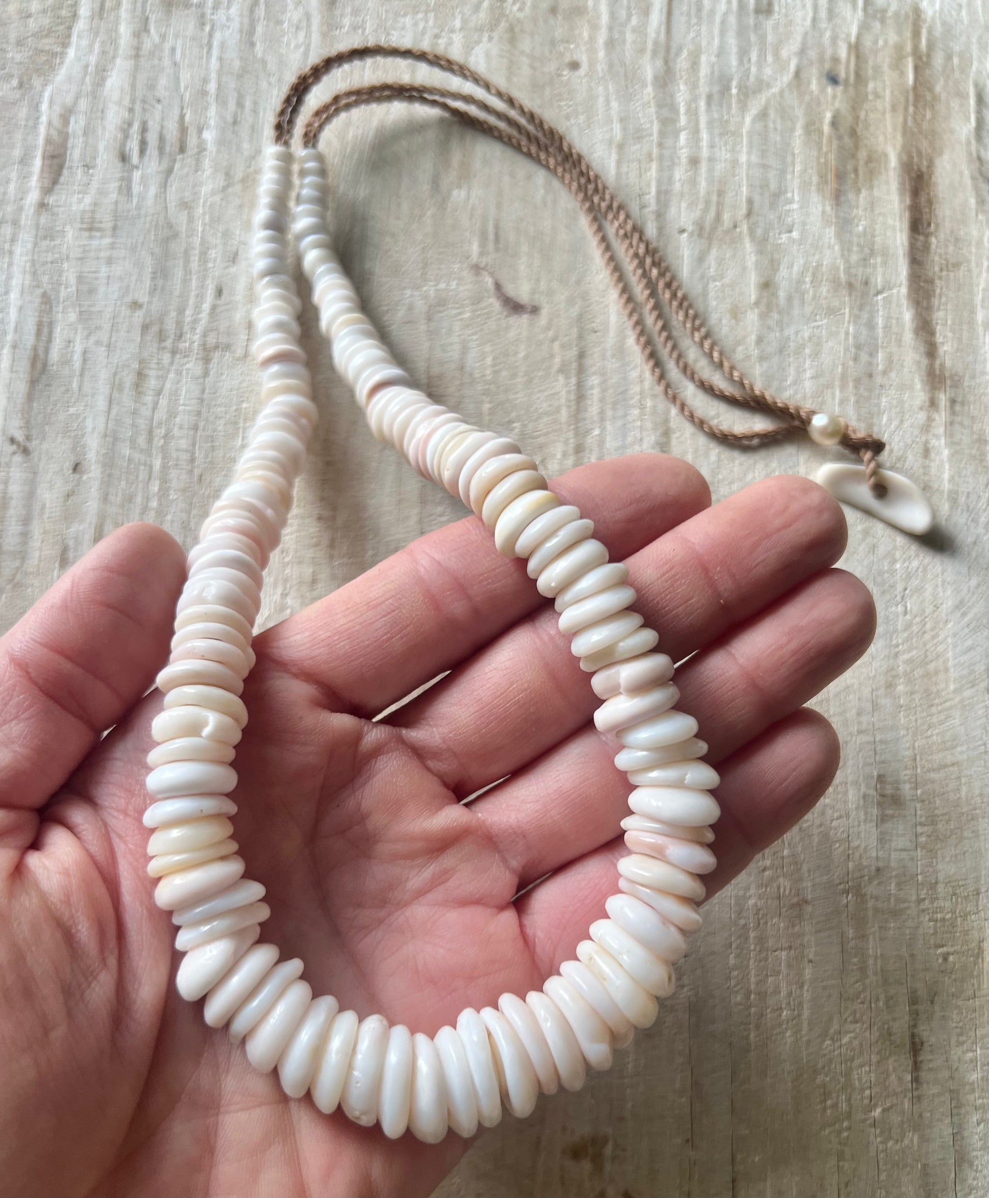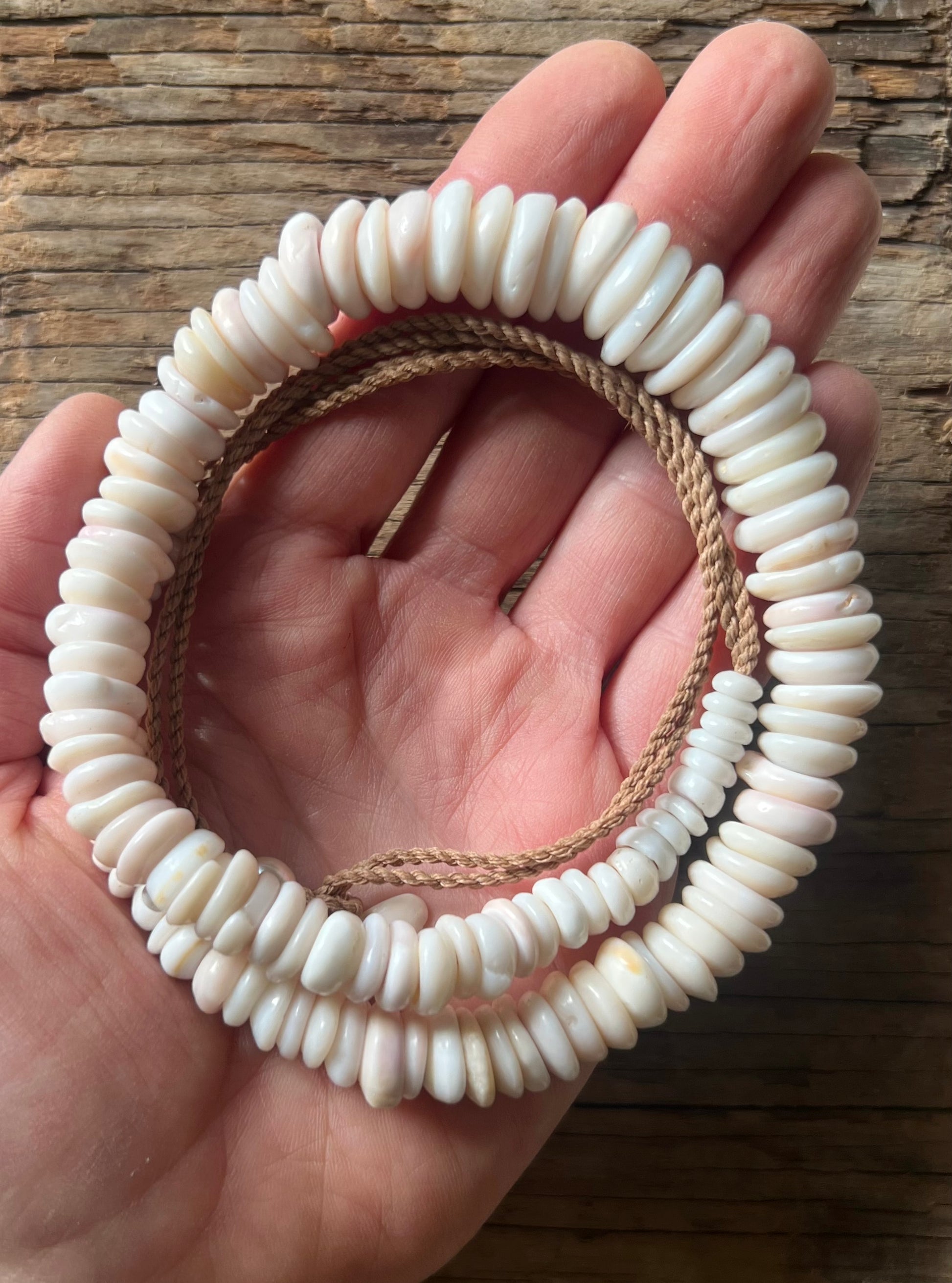 Over 10 dozen perfectly polished pukas in shades of white and pale neutrals are lovingly (and painstakingly) arranged from small to large, and strung on hand twisted 4 ply rope (made from flat waxed polyester thread) in an almond shade of medium brown.