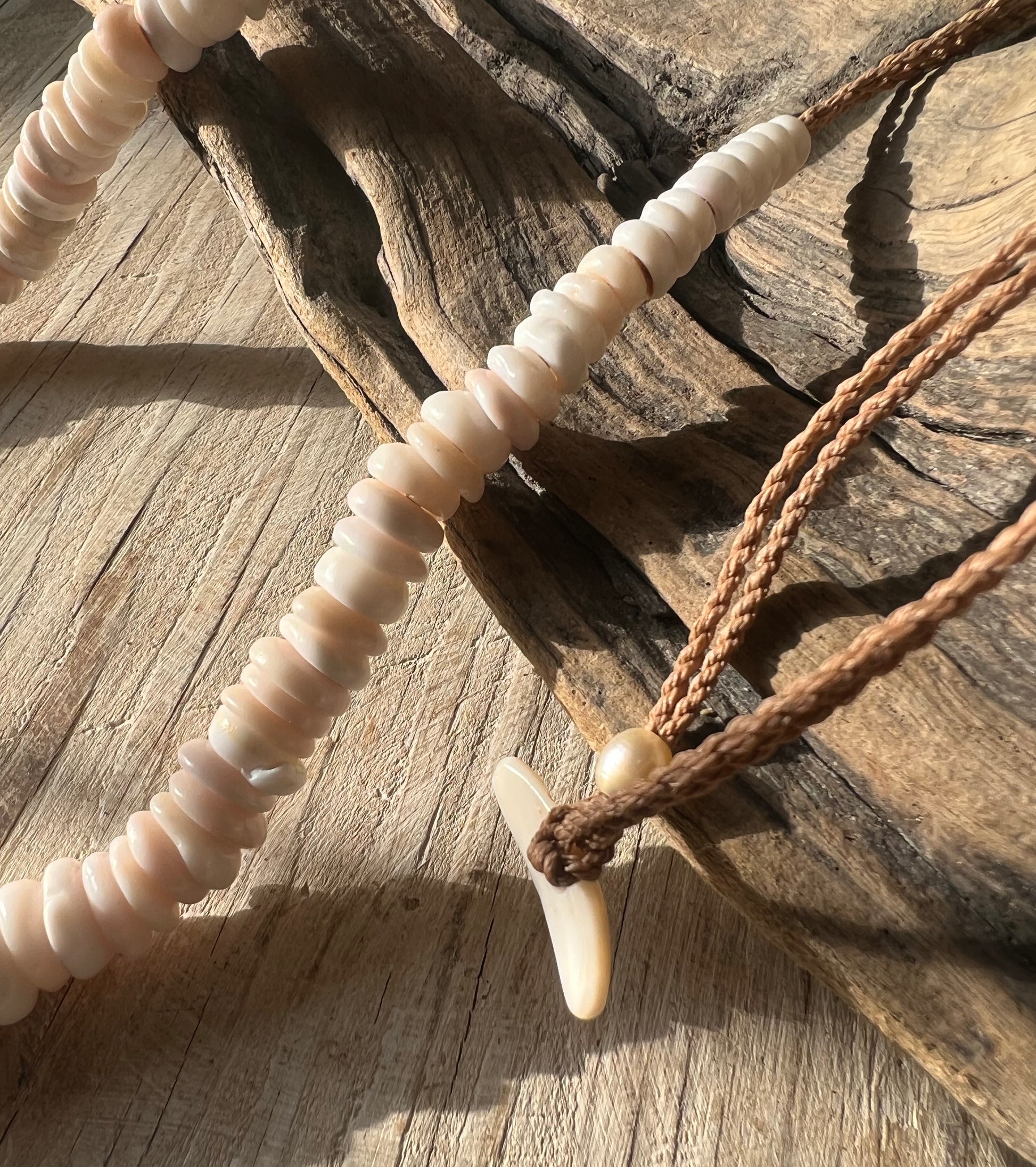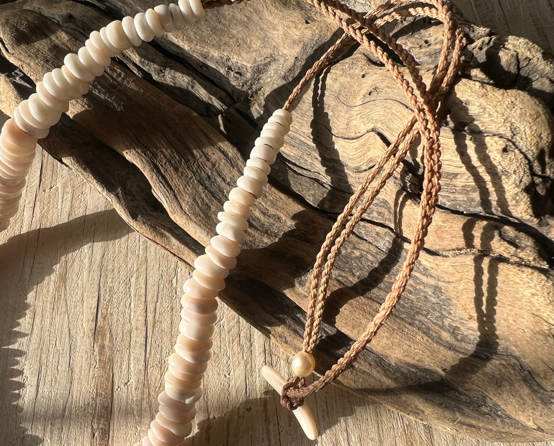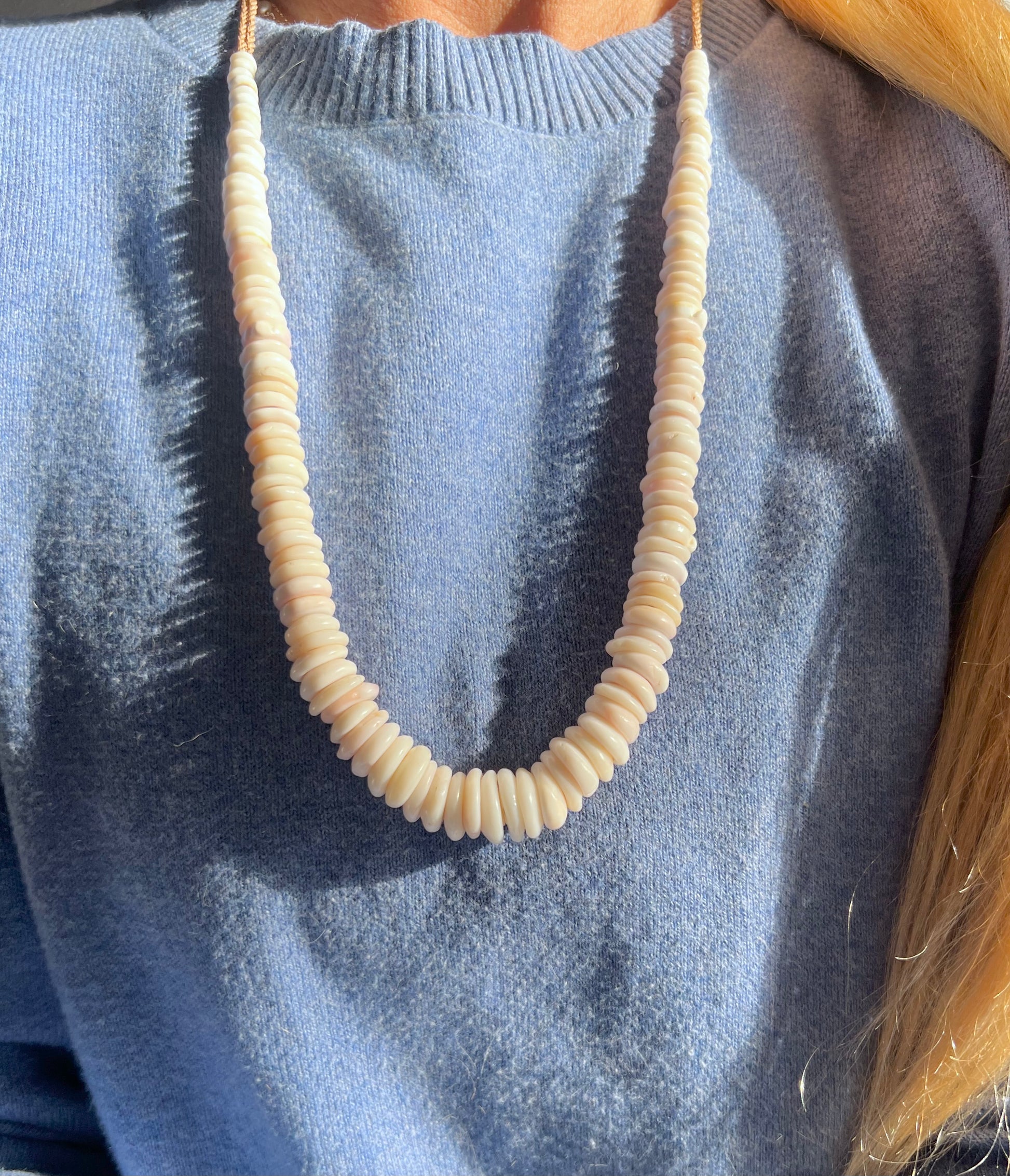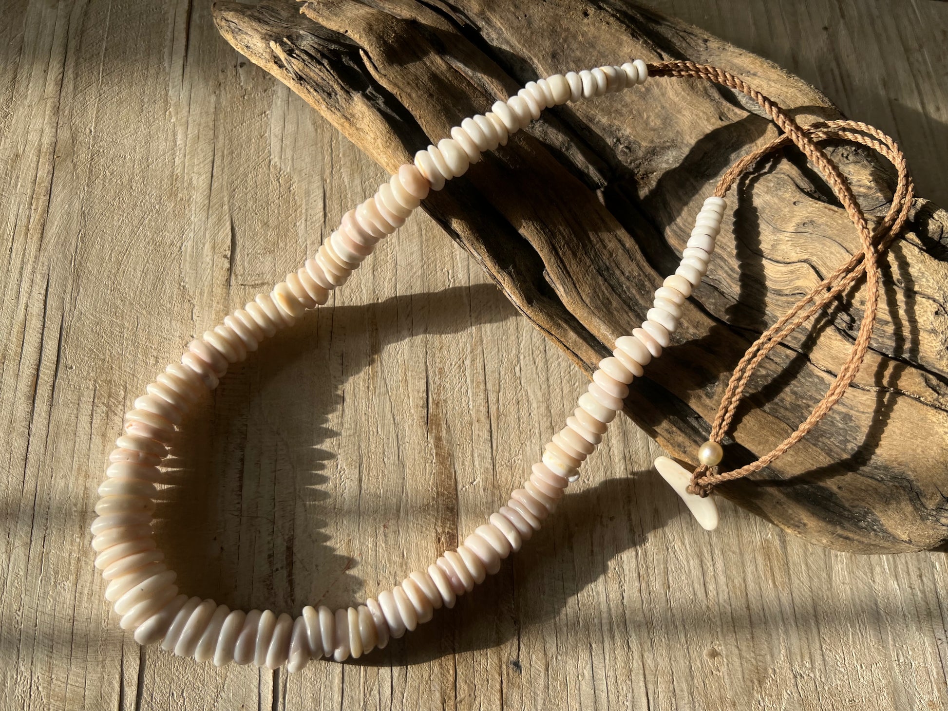 Over 10 dozen perfectly polished pukas in shades of white and pale neutrals are lovingly (and painstakingly) arranged from small to large, and strung on hand twisted 4 ply rope (made from flat waxed polyester thread) in an almond shade of medium brown.