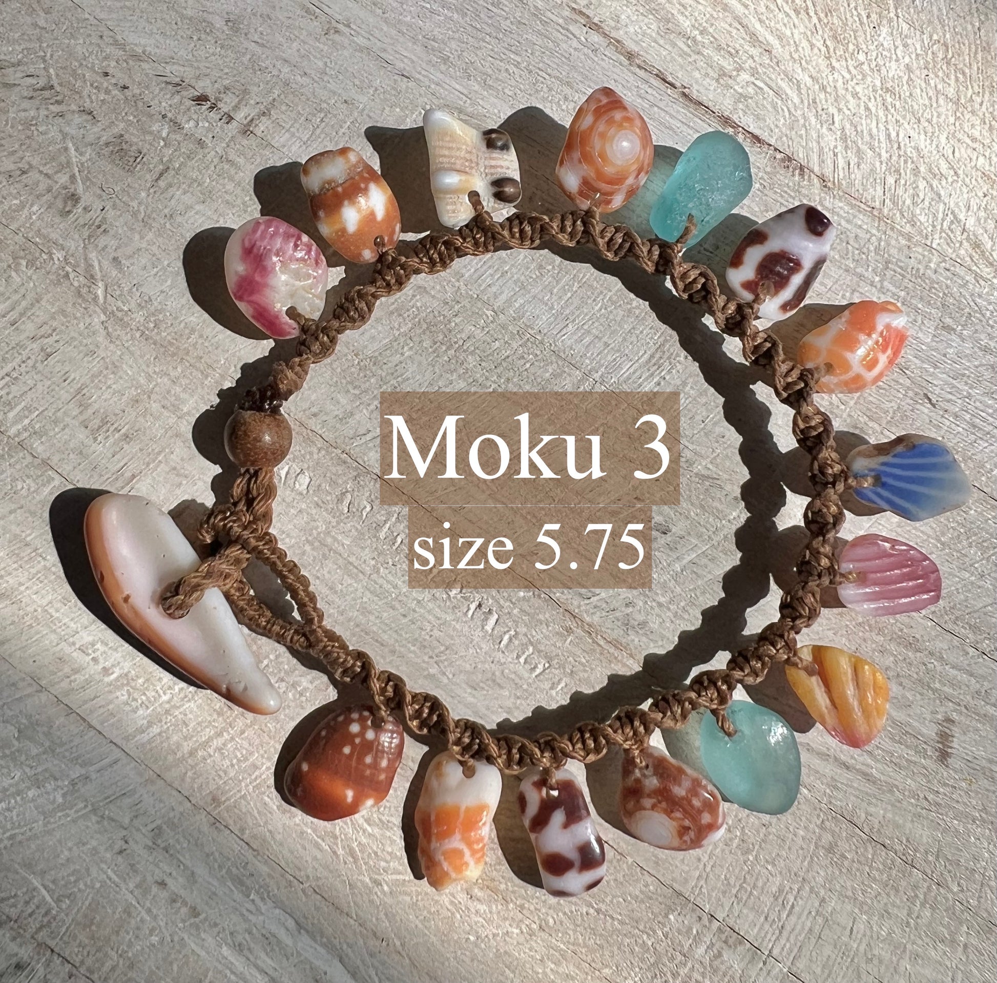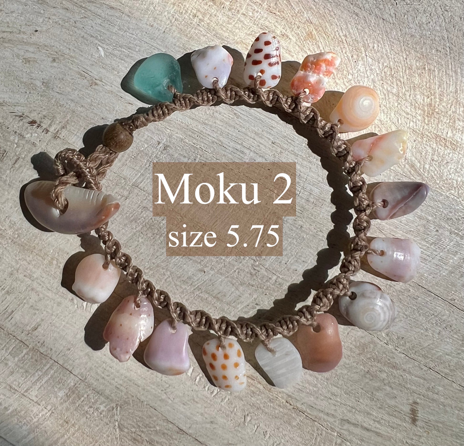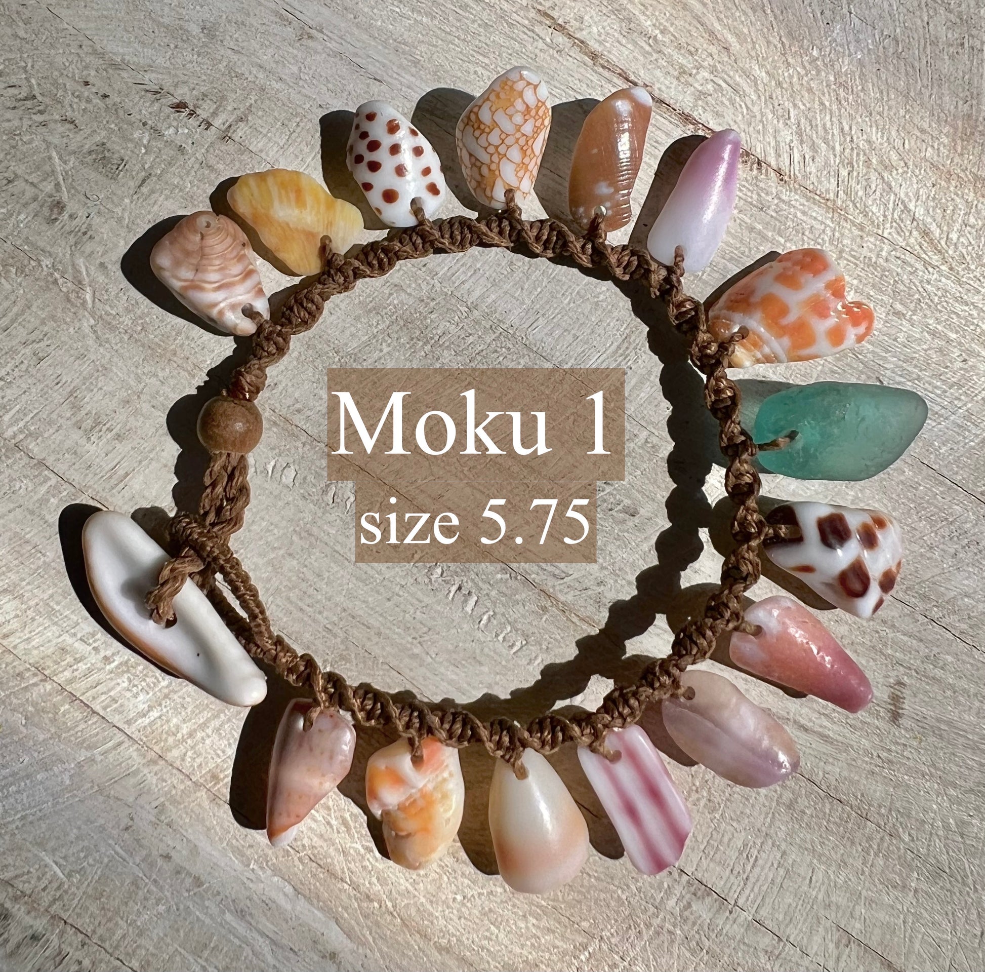 These finished bracelets consists of 15-18 colorful, surf tumbled shell and sea glass fragments. These ocean treasures are strung onto the hand knotted macrame cord which is made from bonded nylon thread. One cowrie lip and toggle loop create the secure and easy to use closure.