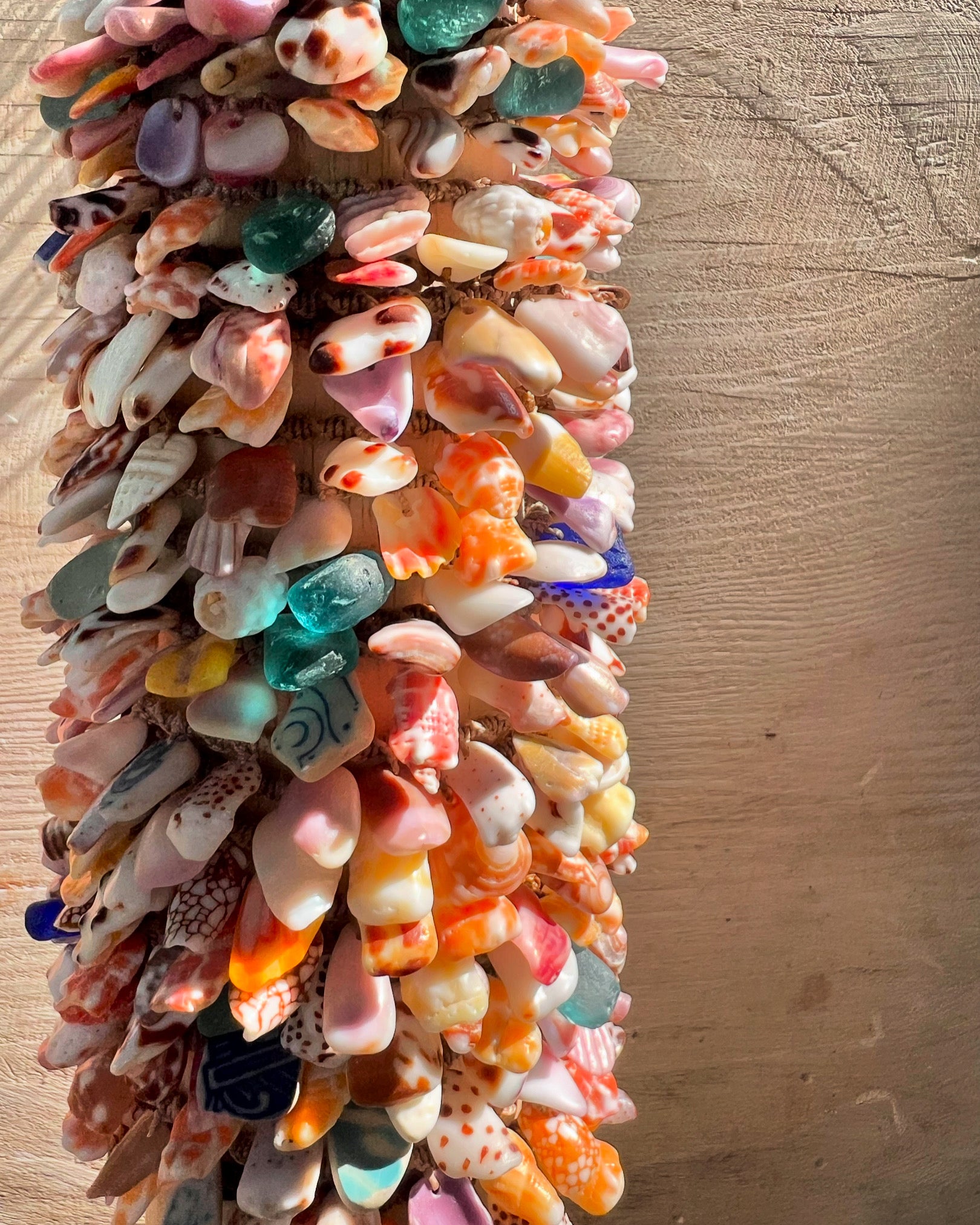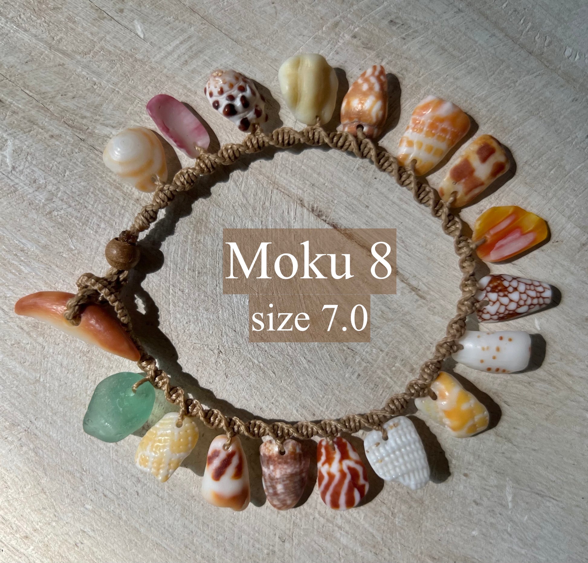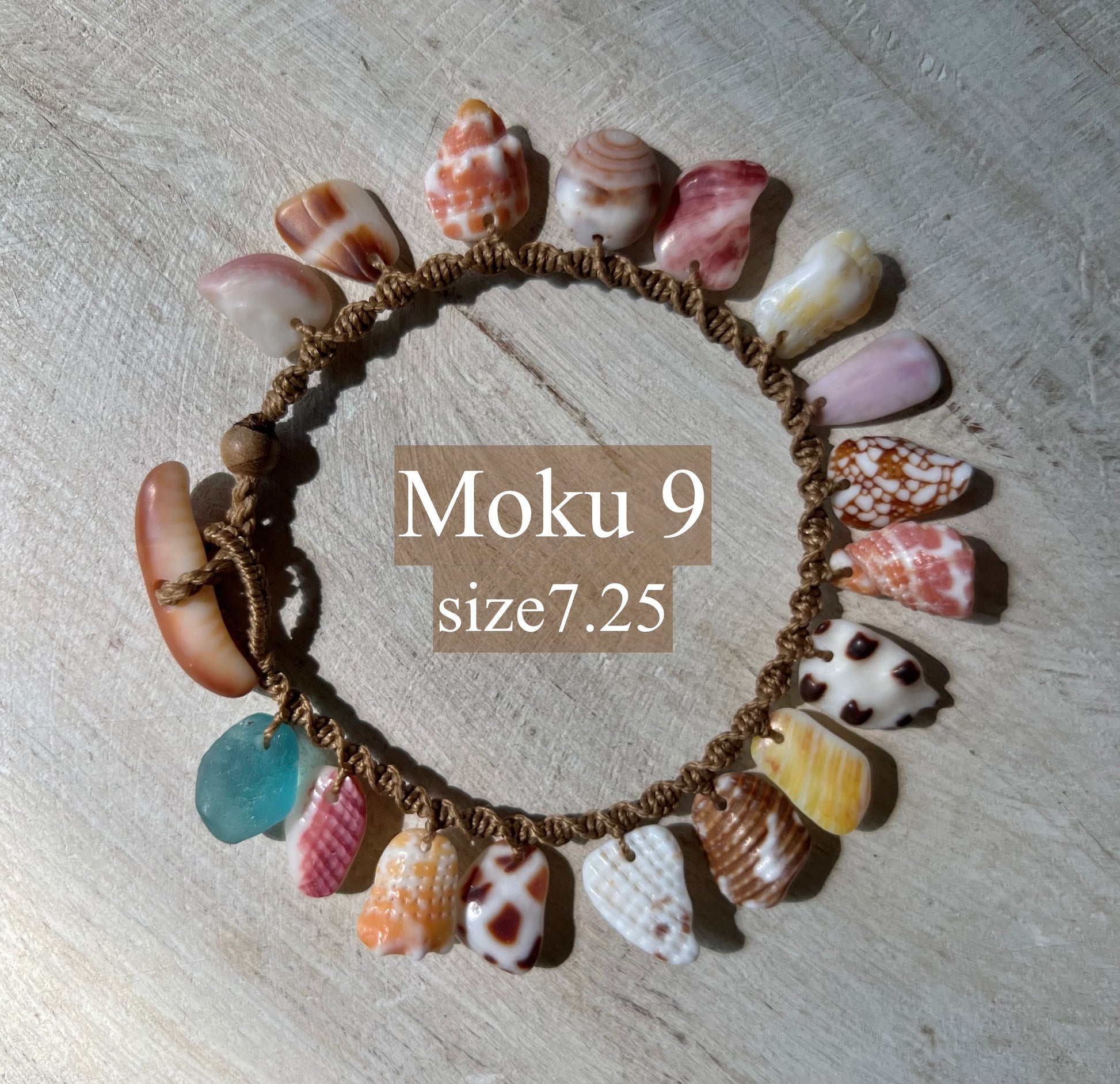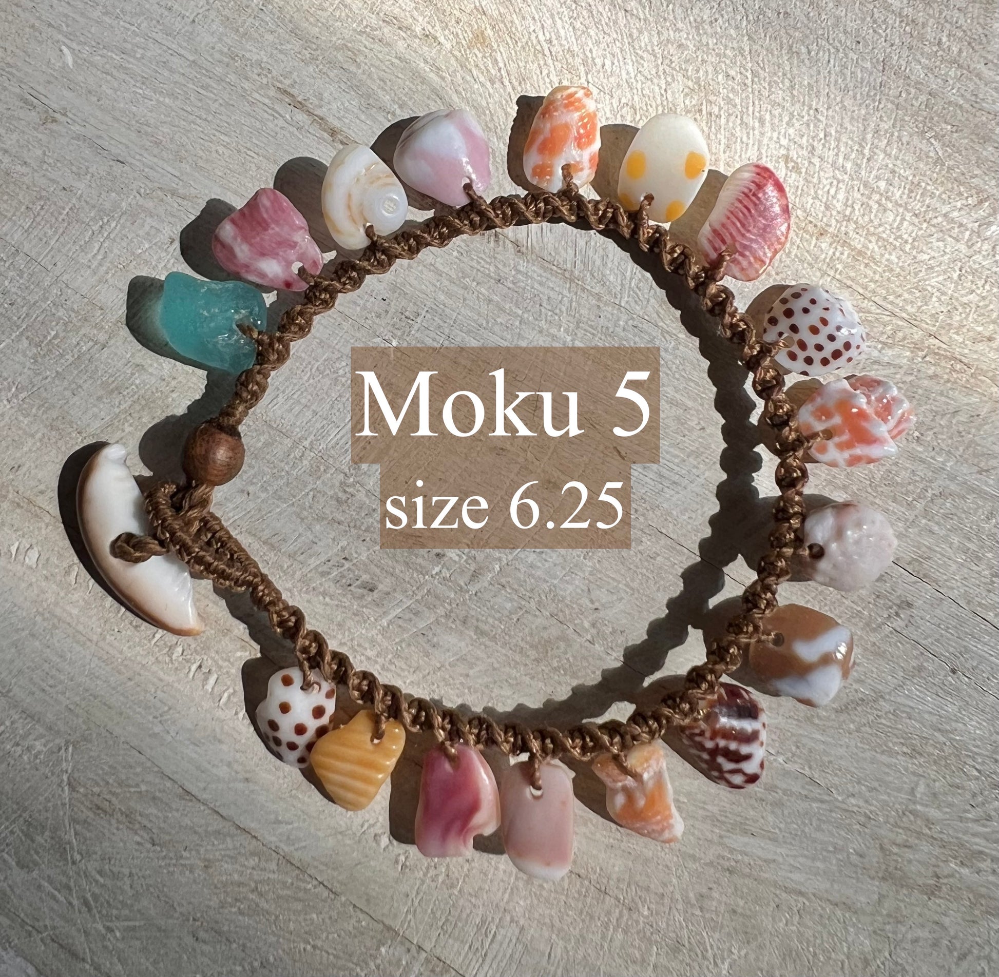 These finished bracelets consists of 15-18 colorful, surf tumbled shell and sea glass fragments. These ocean treasures are strung onto the hand knotted macrame cord which is made from bonded nylon thread. One cowrie lip and toggle loop create the secure and easy to use closure.