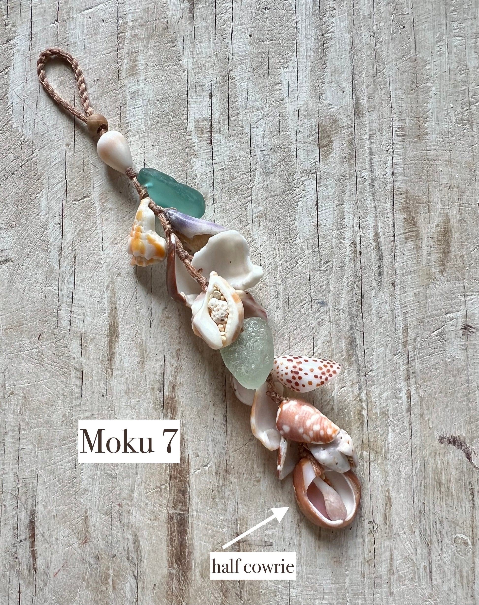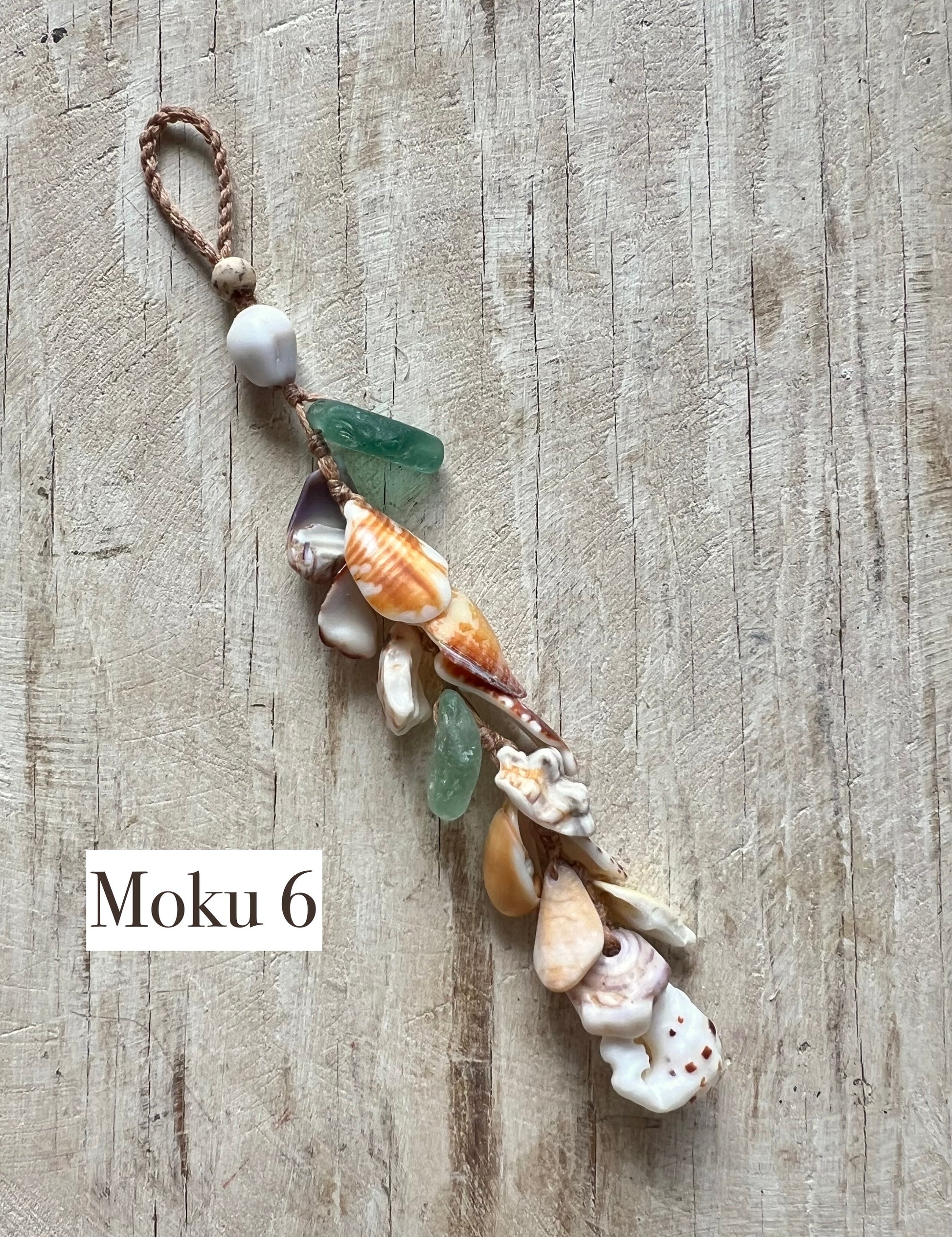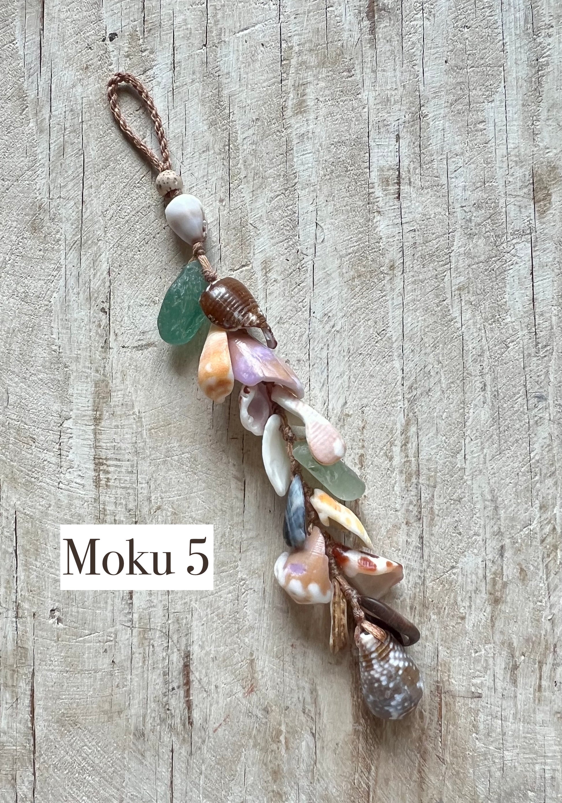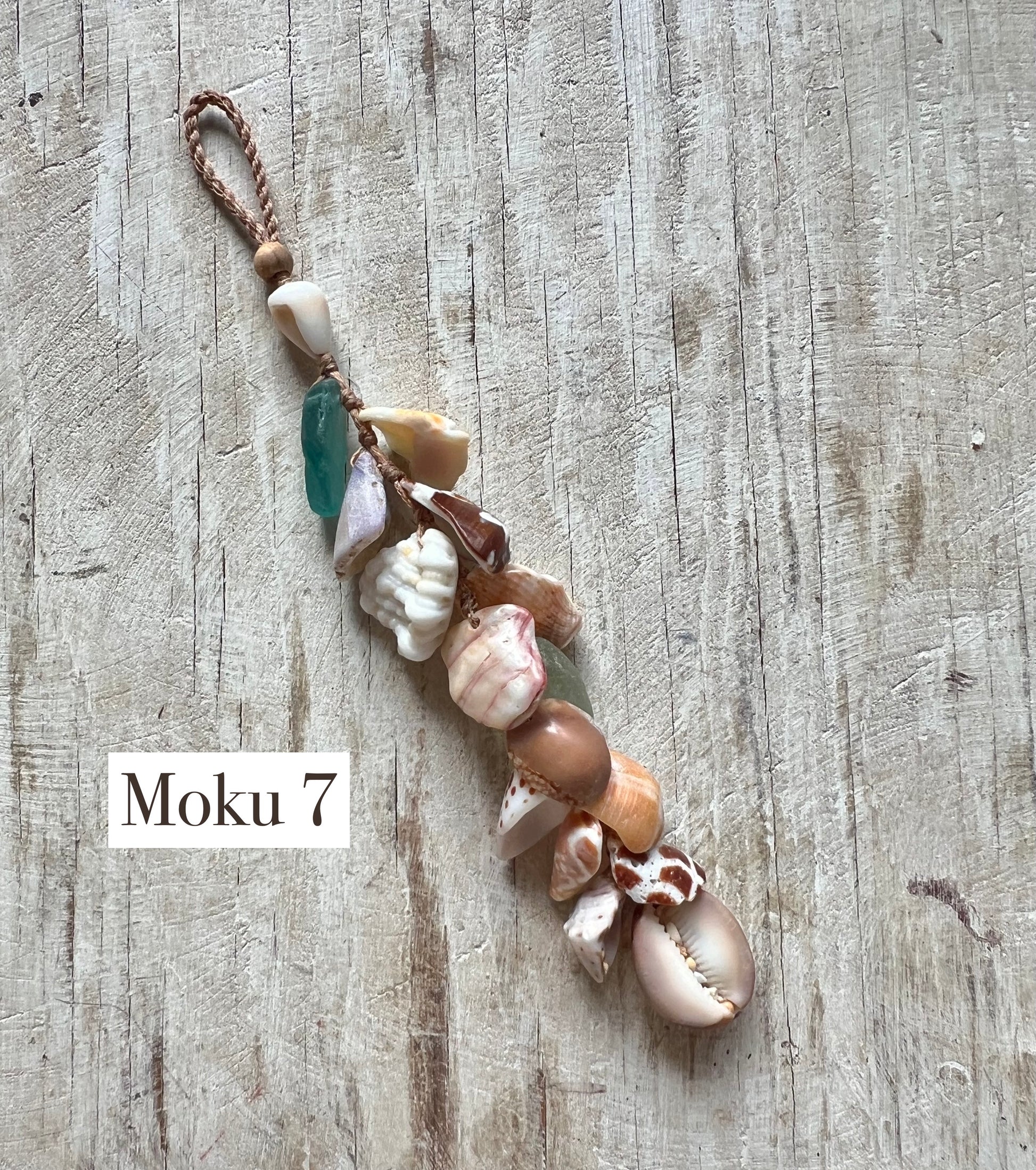 The Moku Sun Cather is hand tied on waxed polyester thread with 15 ocean treasures on each strand and a perfect chunky shell at the bottom.