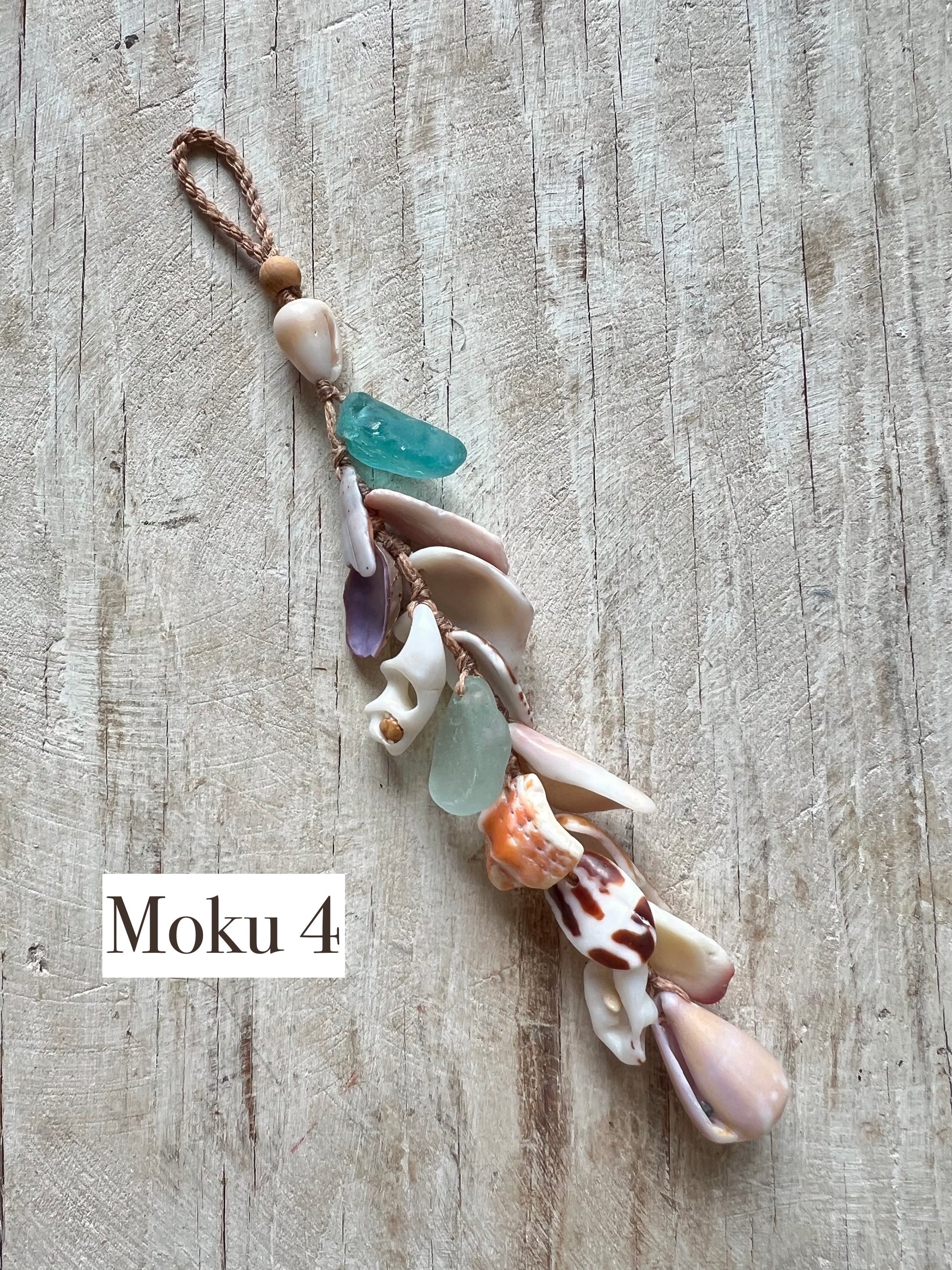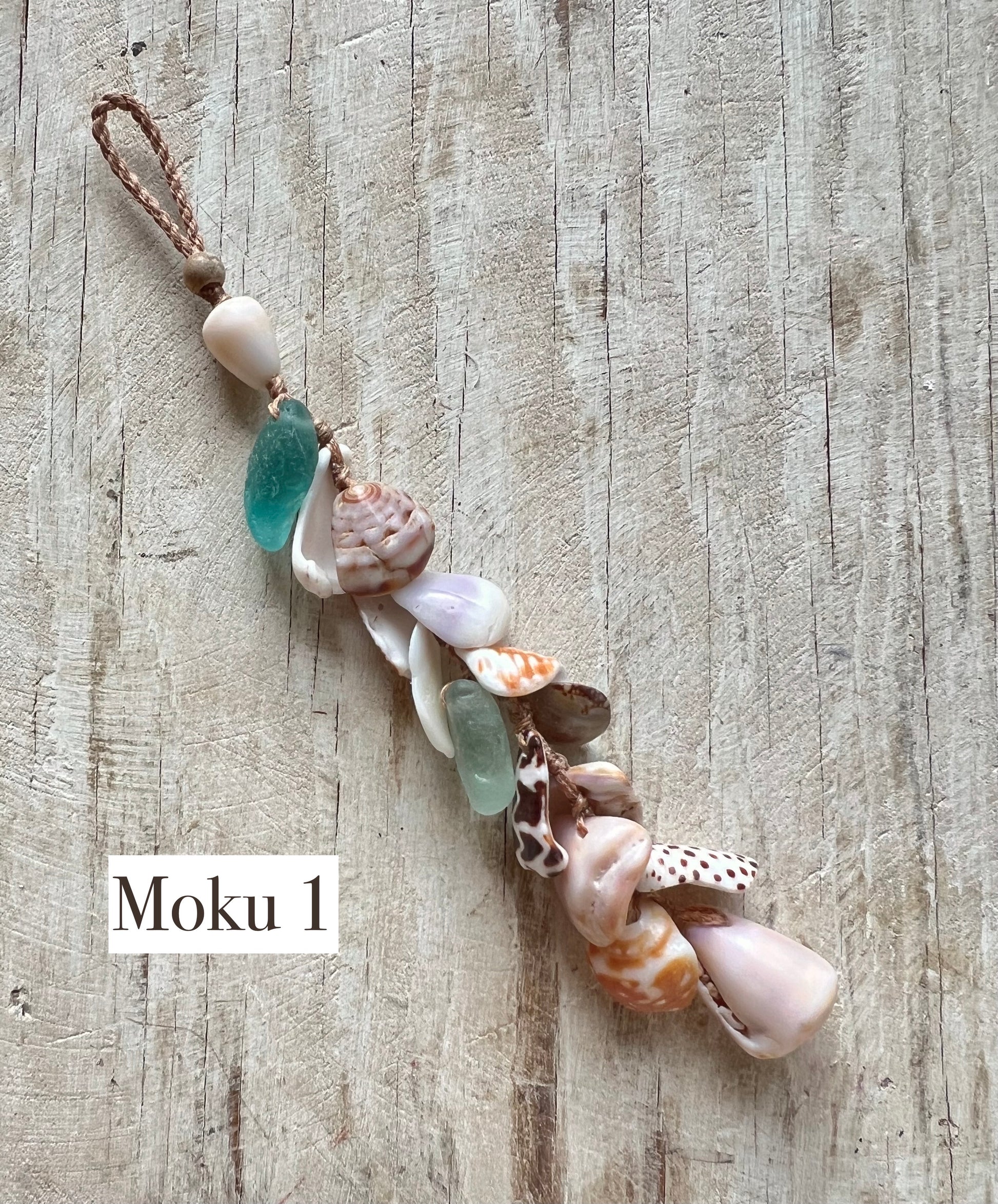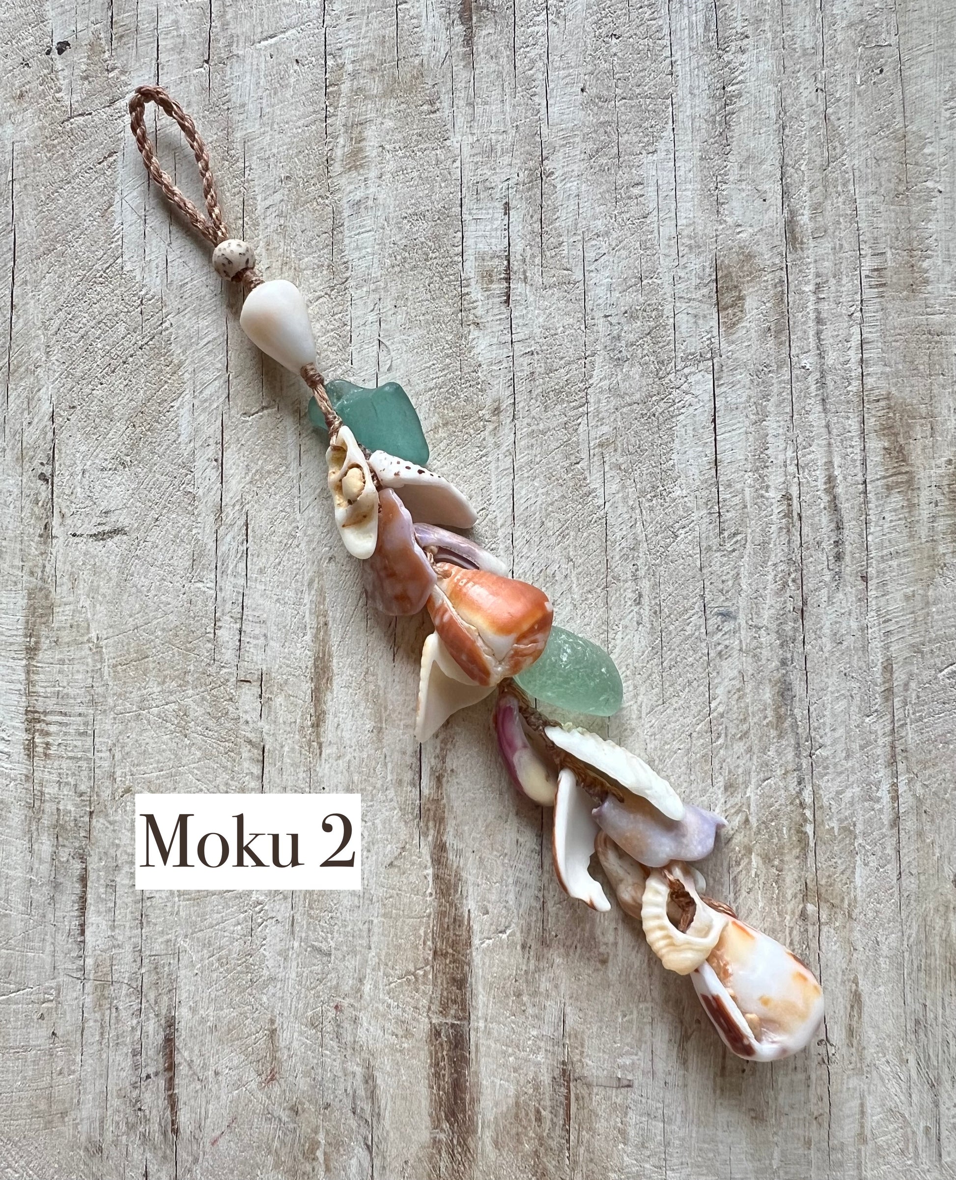 The Moku Sun Cather is hand tied on waxed polyester thread with 15 ocean treasures on each strand and a perfect chunky shell at the bottom.