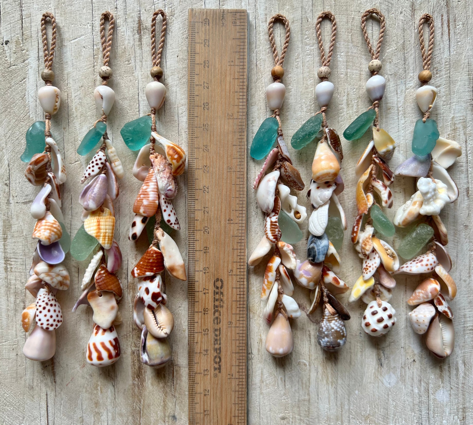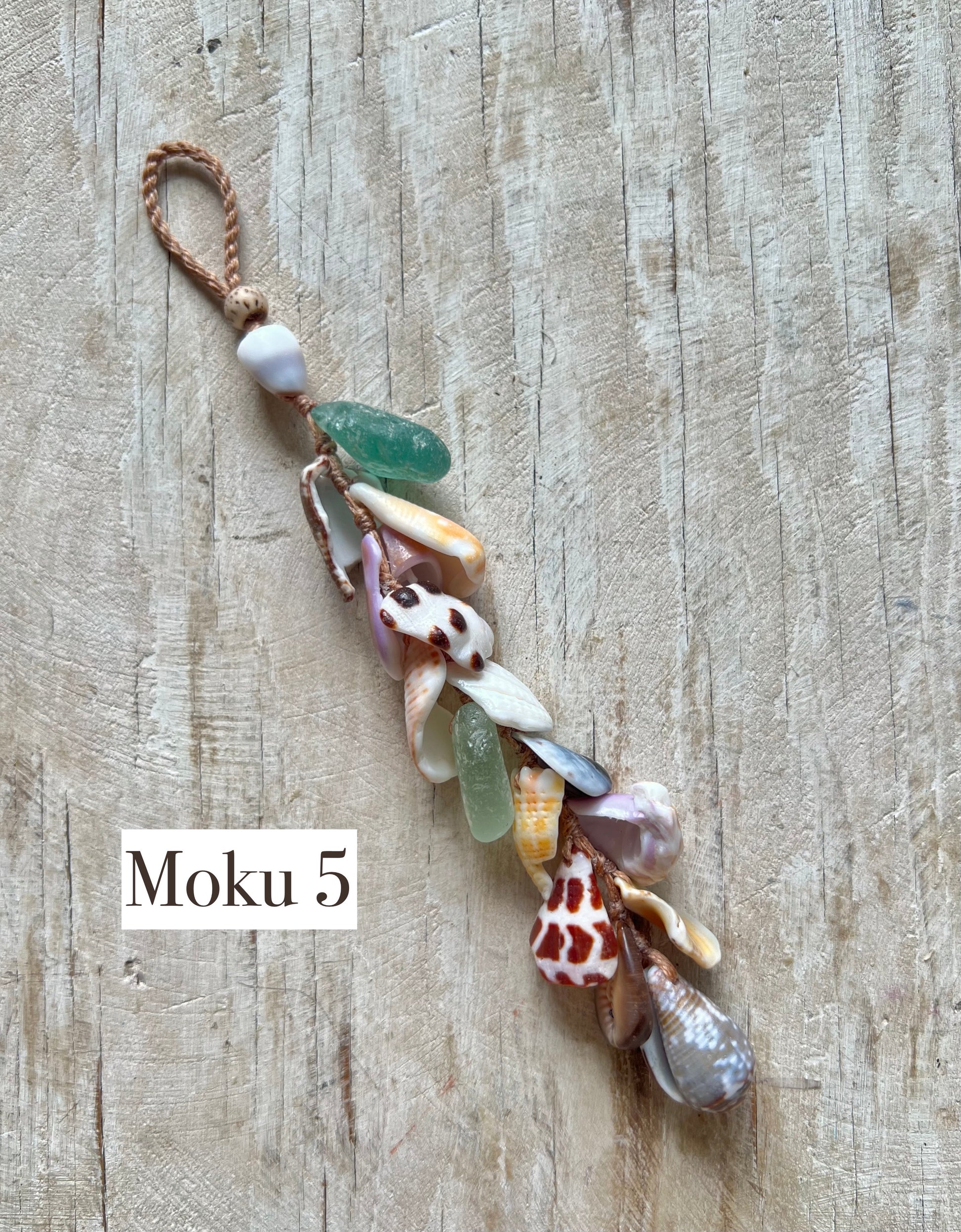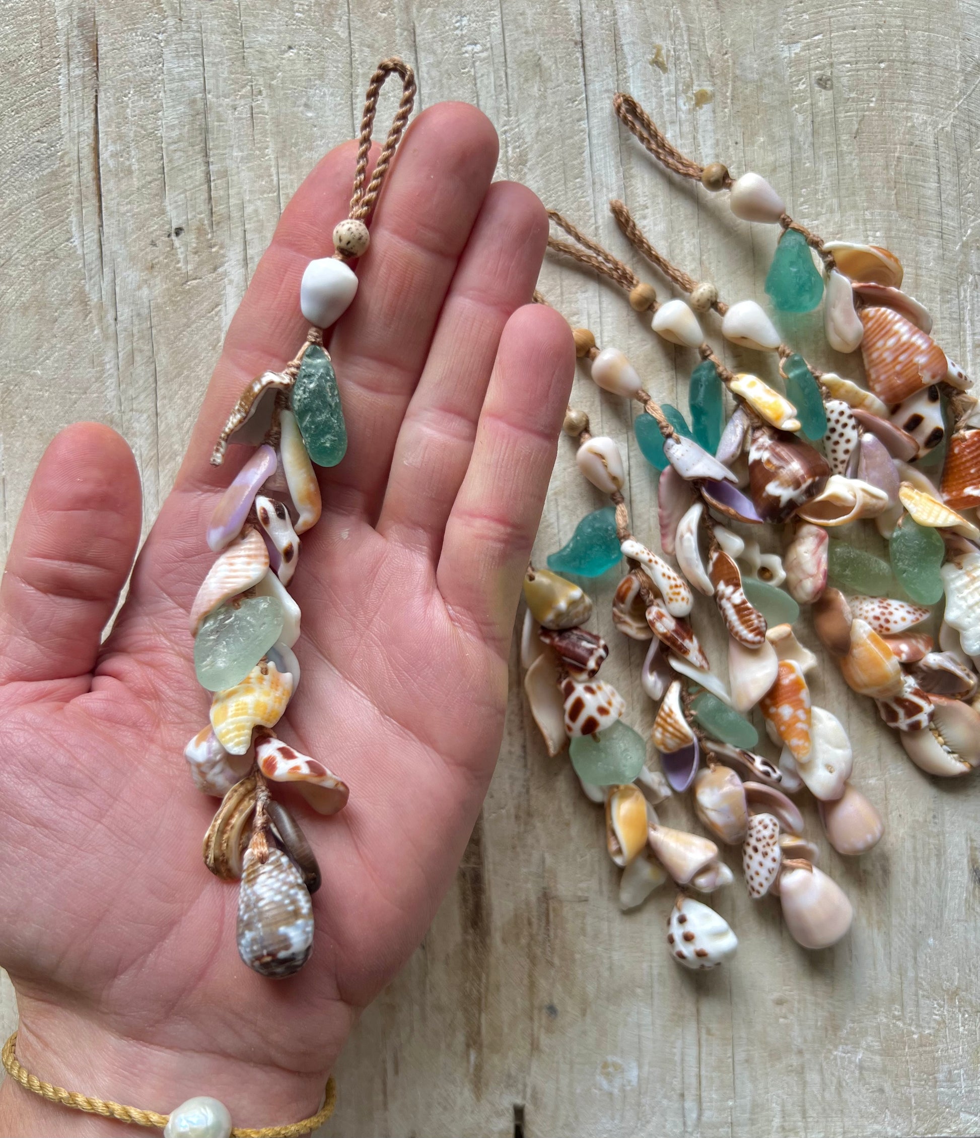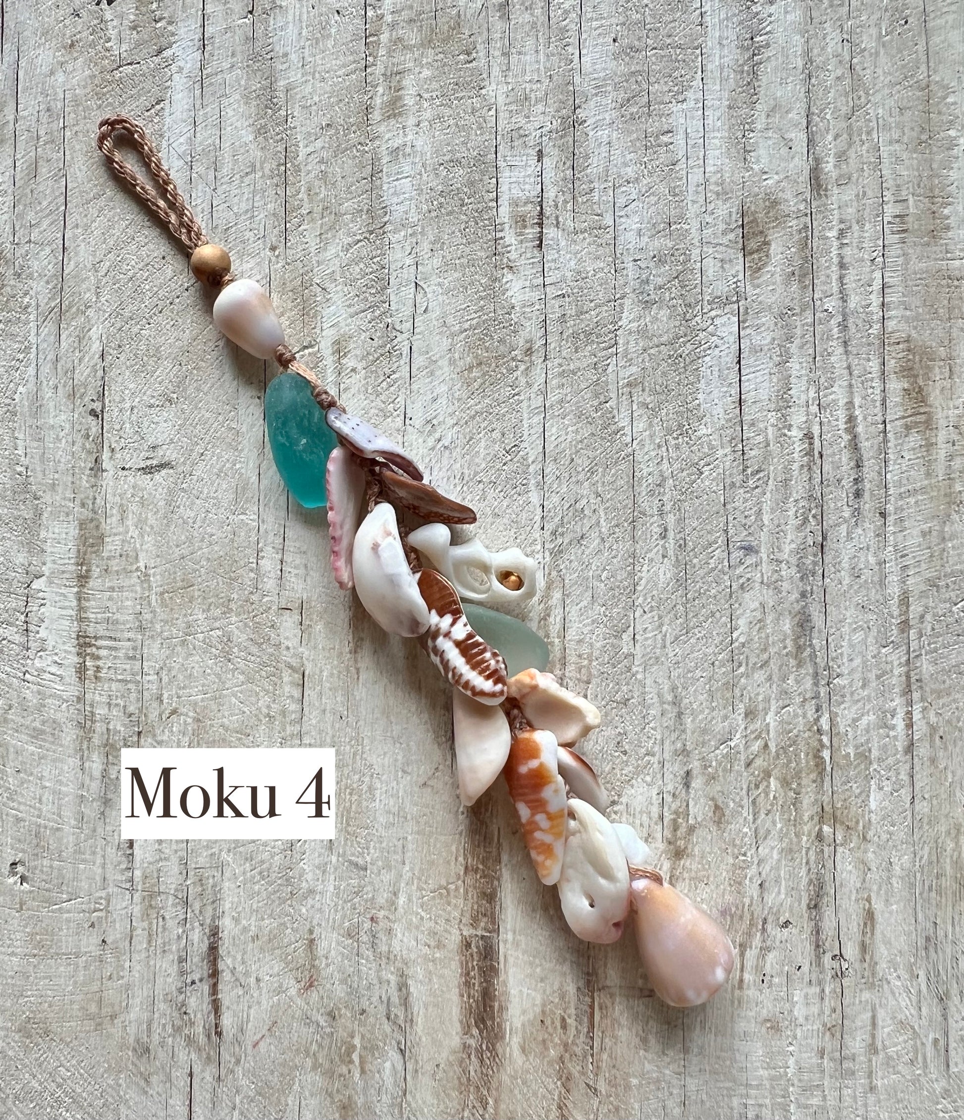 The Moku Sun Cather is hand tied on waxed polyester thread with 15 ocean treasures on each strand and a perfect chunky shell at the bottom.