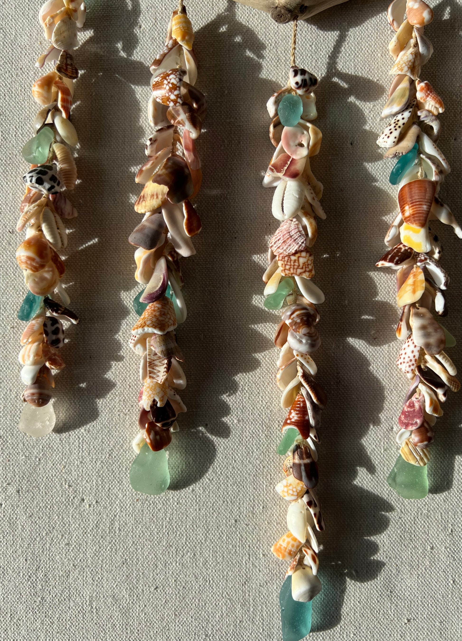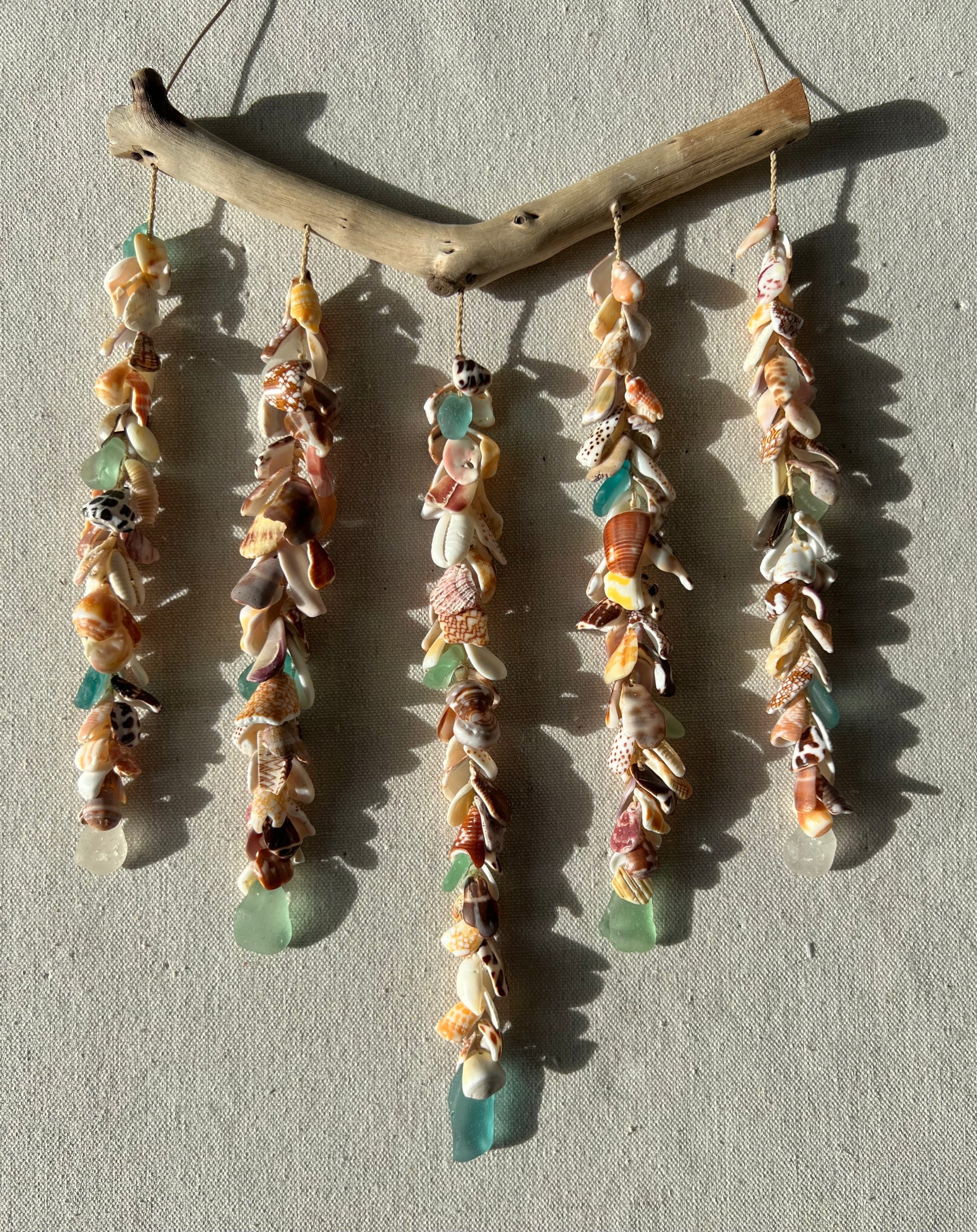 Each strand is hand tied on waxed polyester thread with over 40 (approximately 227 total) ocean treasures on each strand and a chunky sea glass nugget at the bottom.
