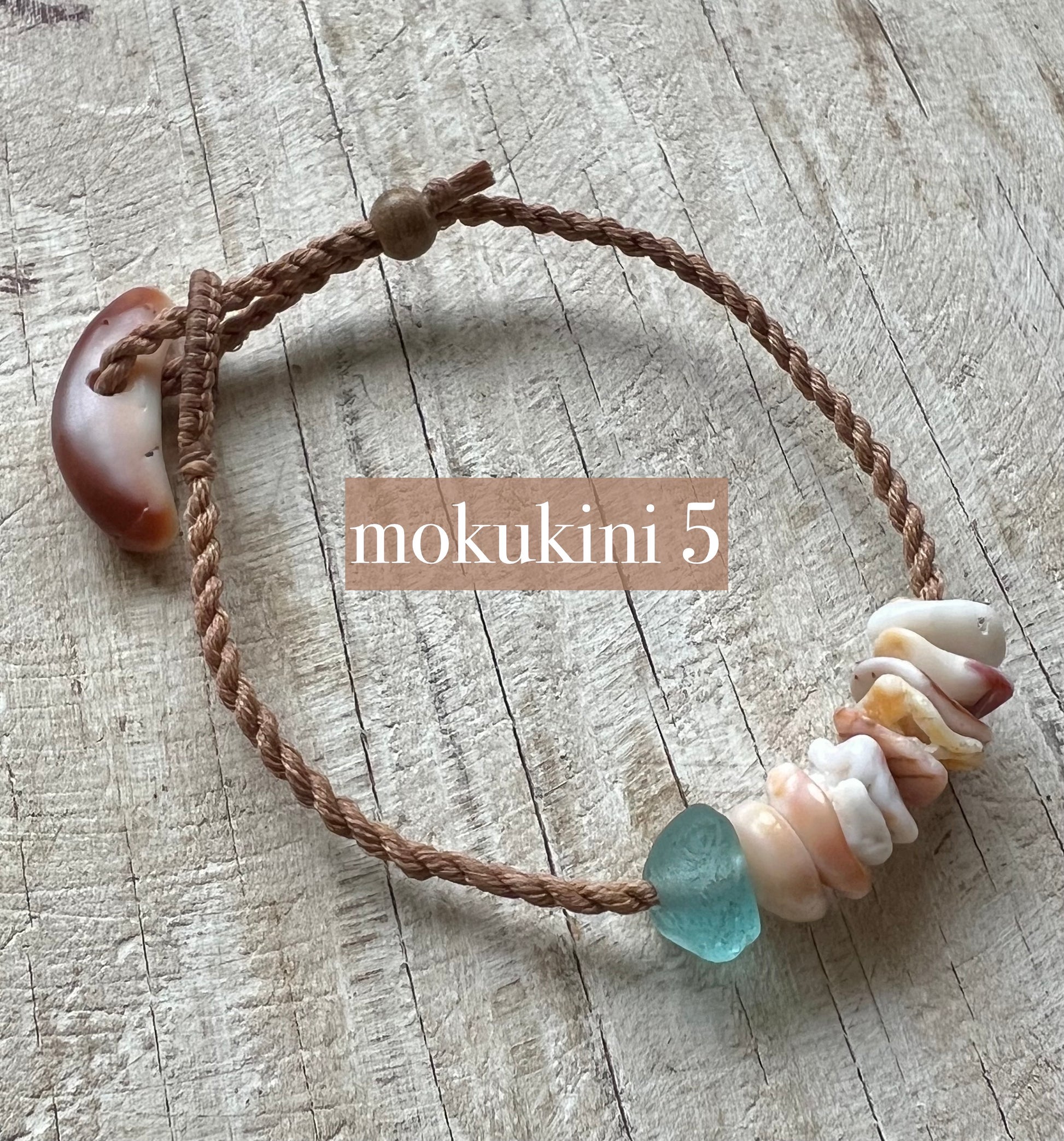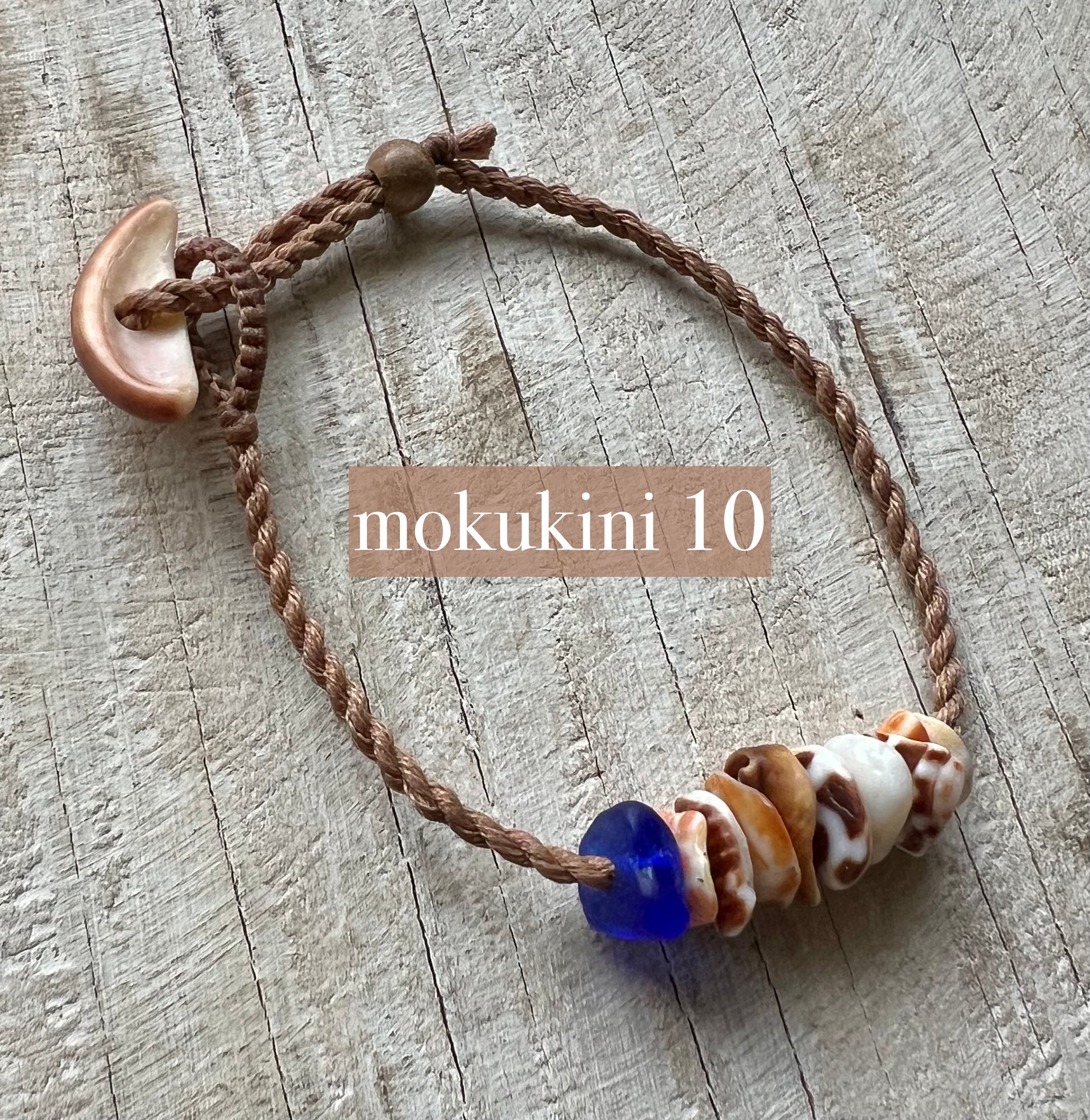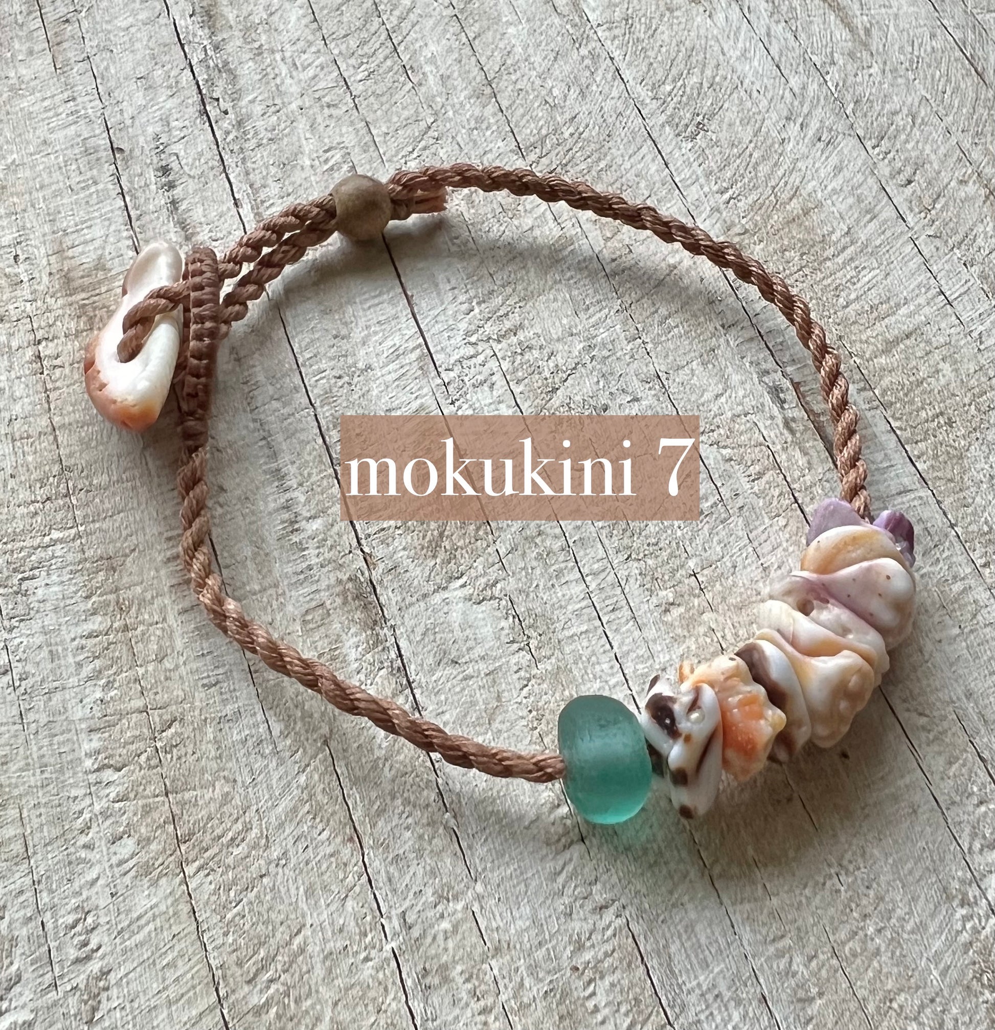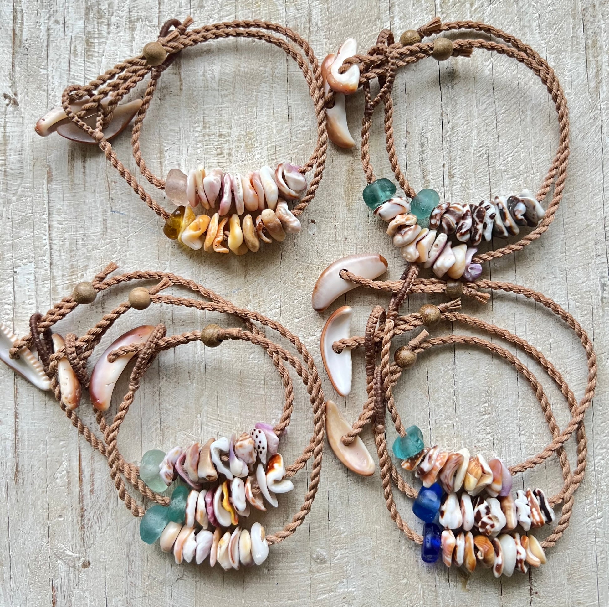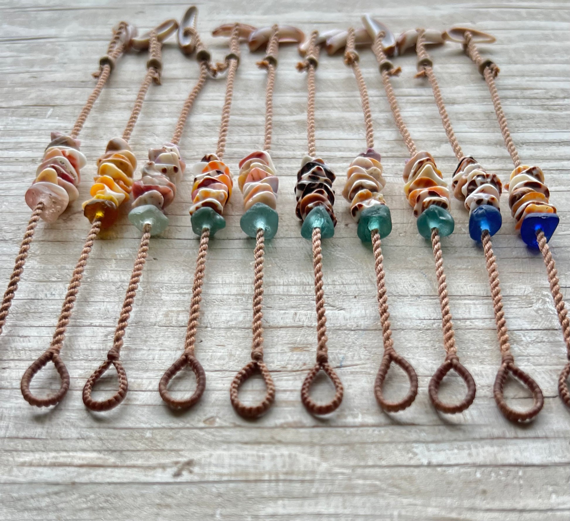 The Mokukini bracelet is a whimsical take on my signature Moku design. These sweet bracelets, made of 8-10 colorful, patterned, surf tumbled shell fragments and one sea glass nugget, couldn't be cuter.
