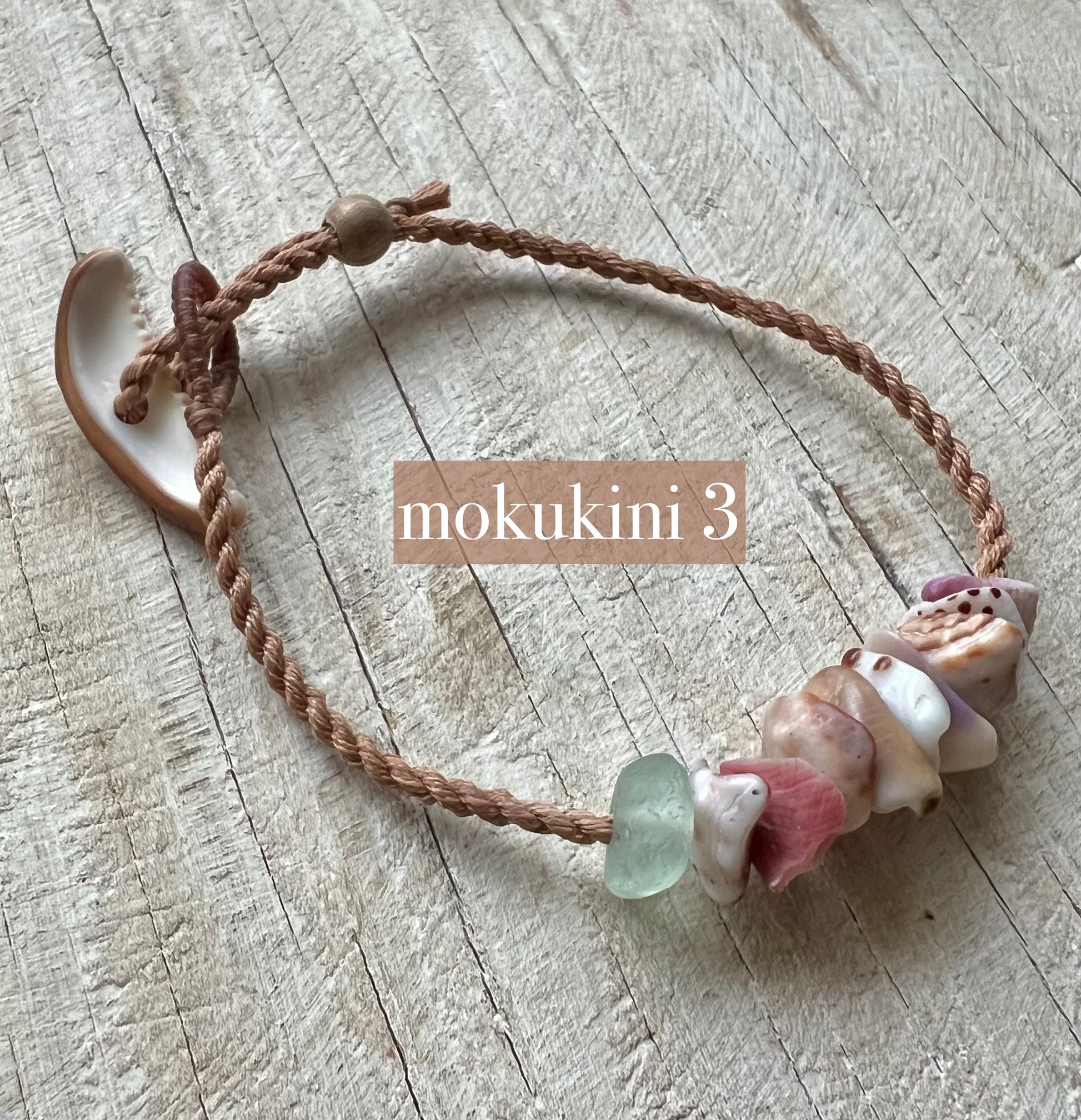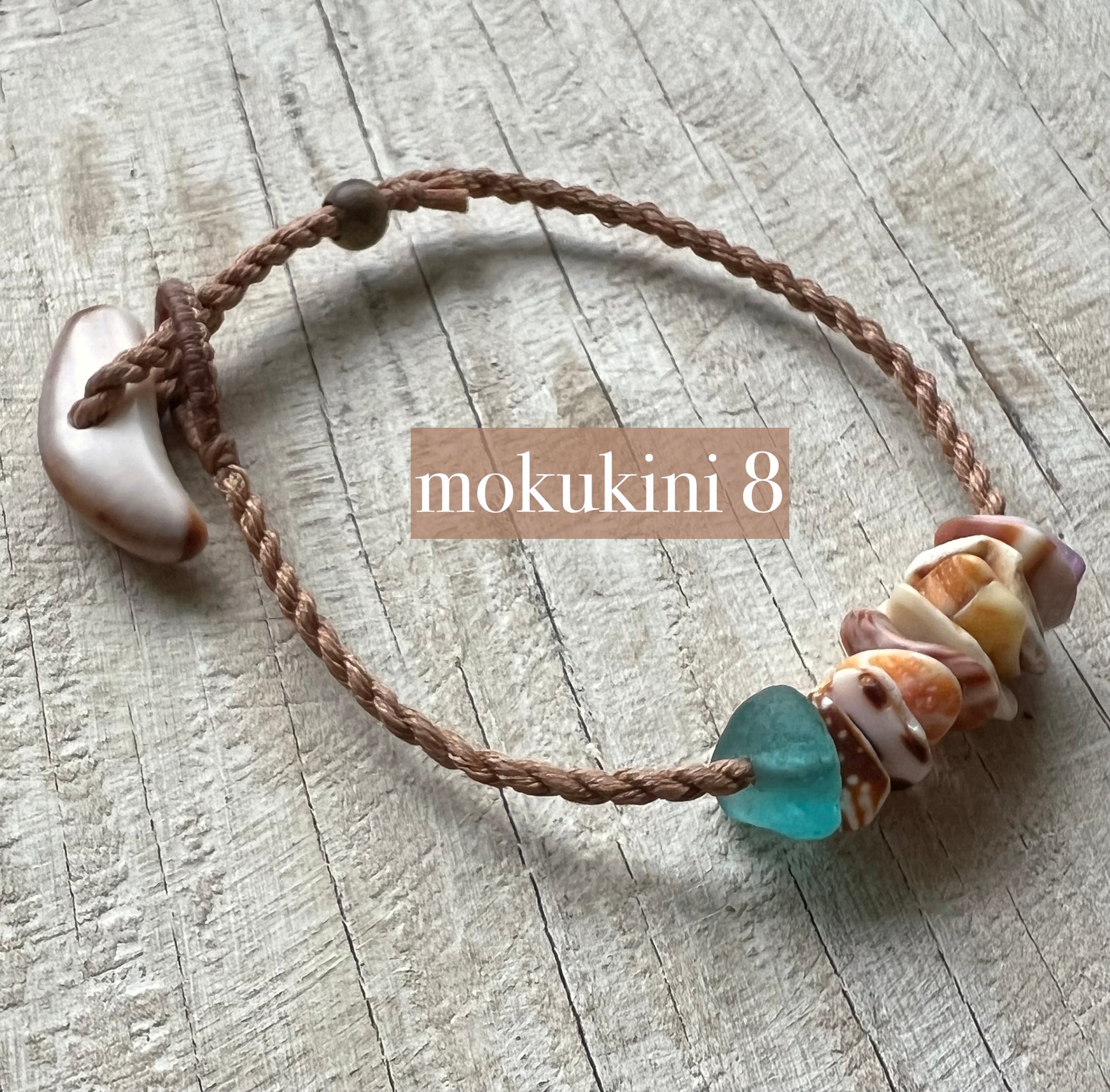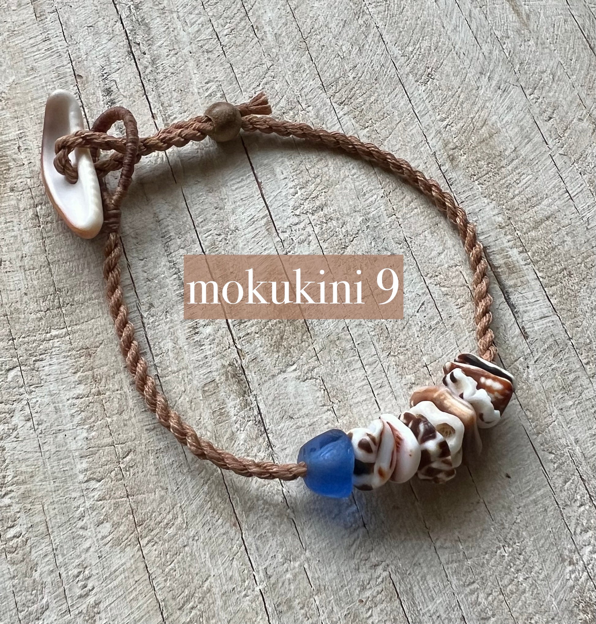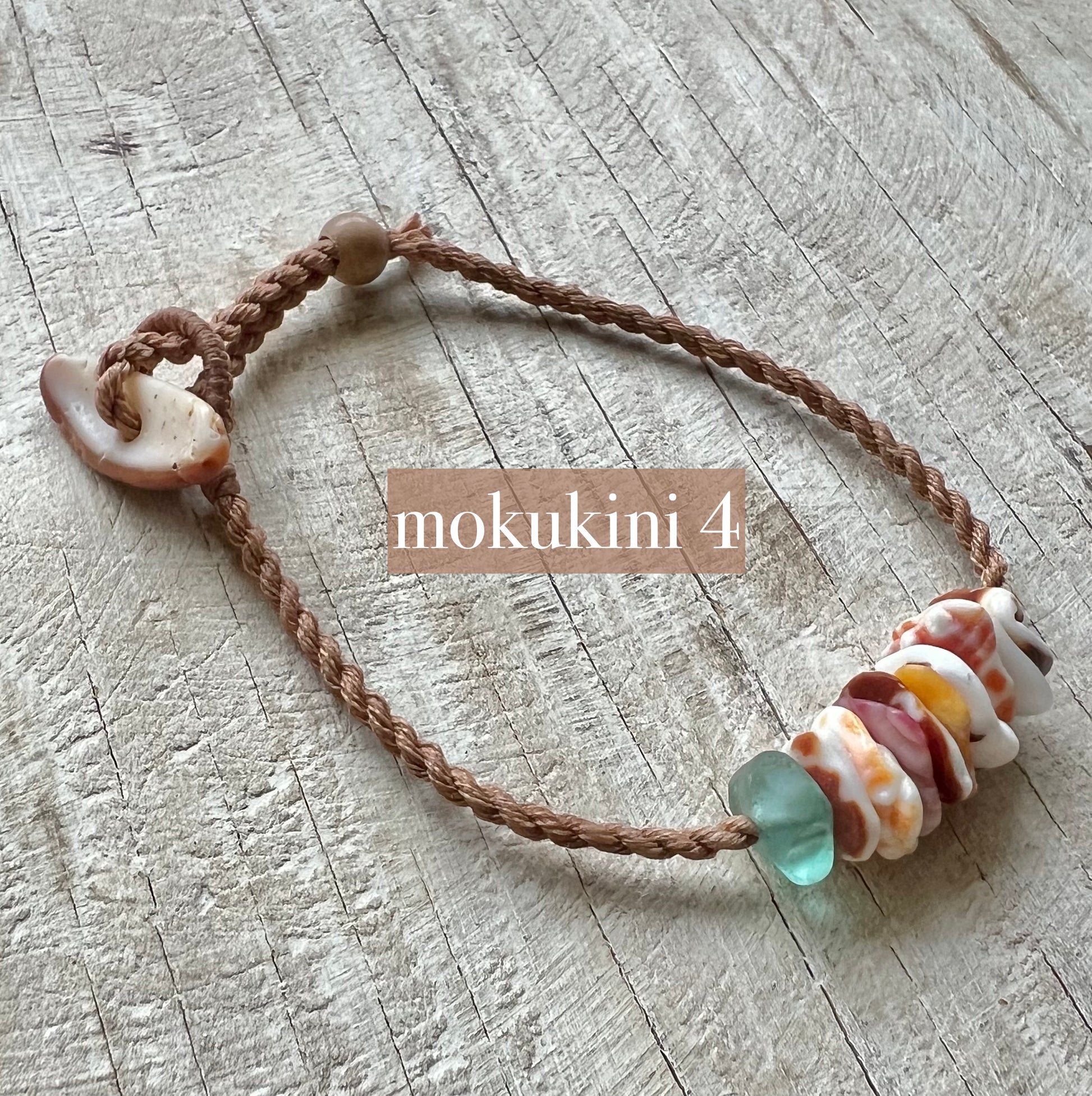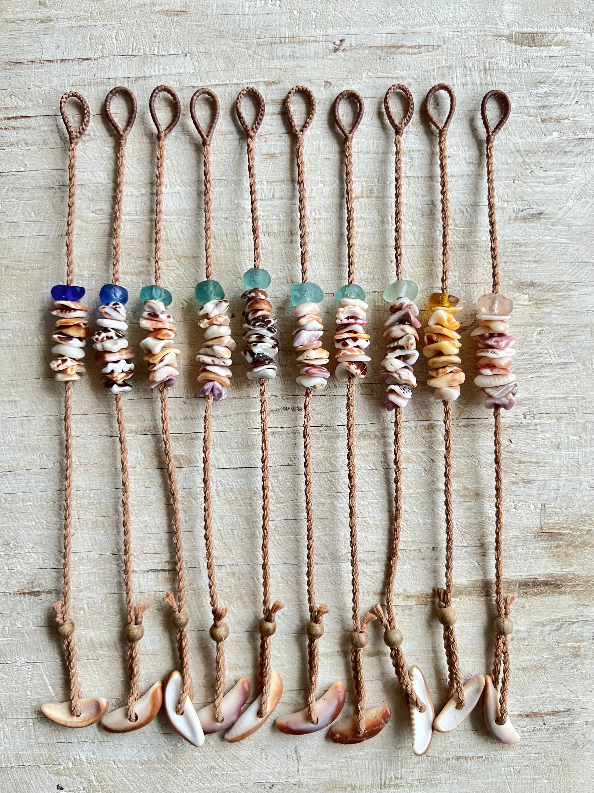 The Mokukini bracelet is a whimsical take on my signature Moku design. These sweet bracelets, made of 8-10 colorful, patterned, surf tumbled shell fragments and one sea glass nugget, couldn't be cuter.