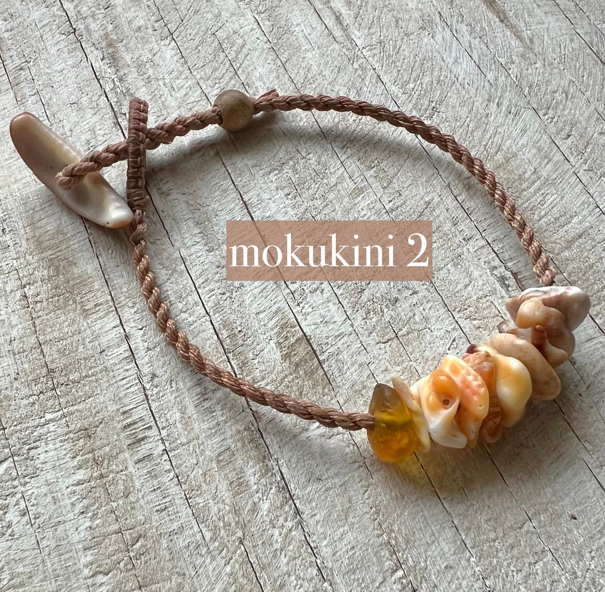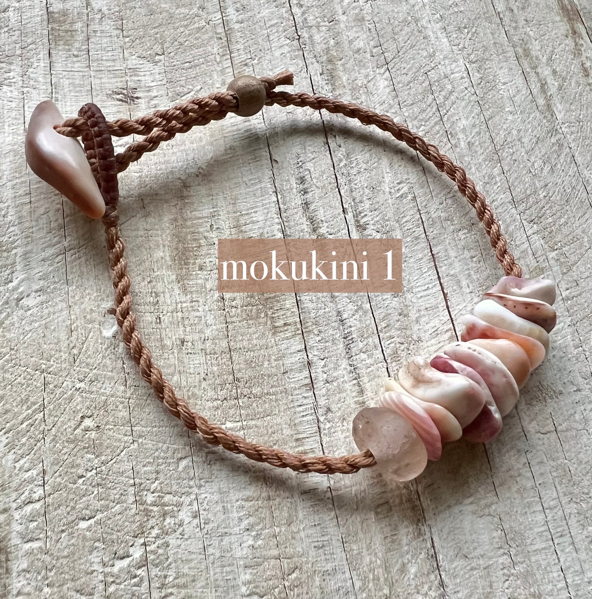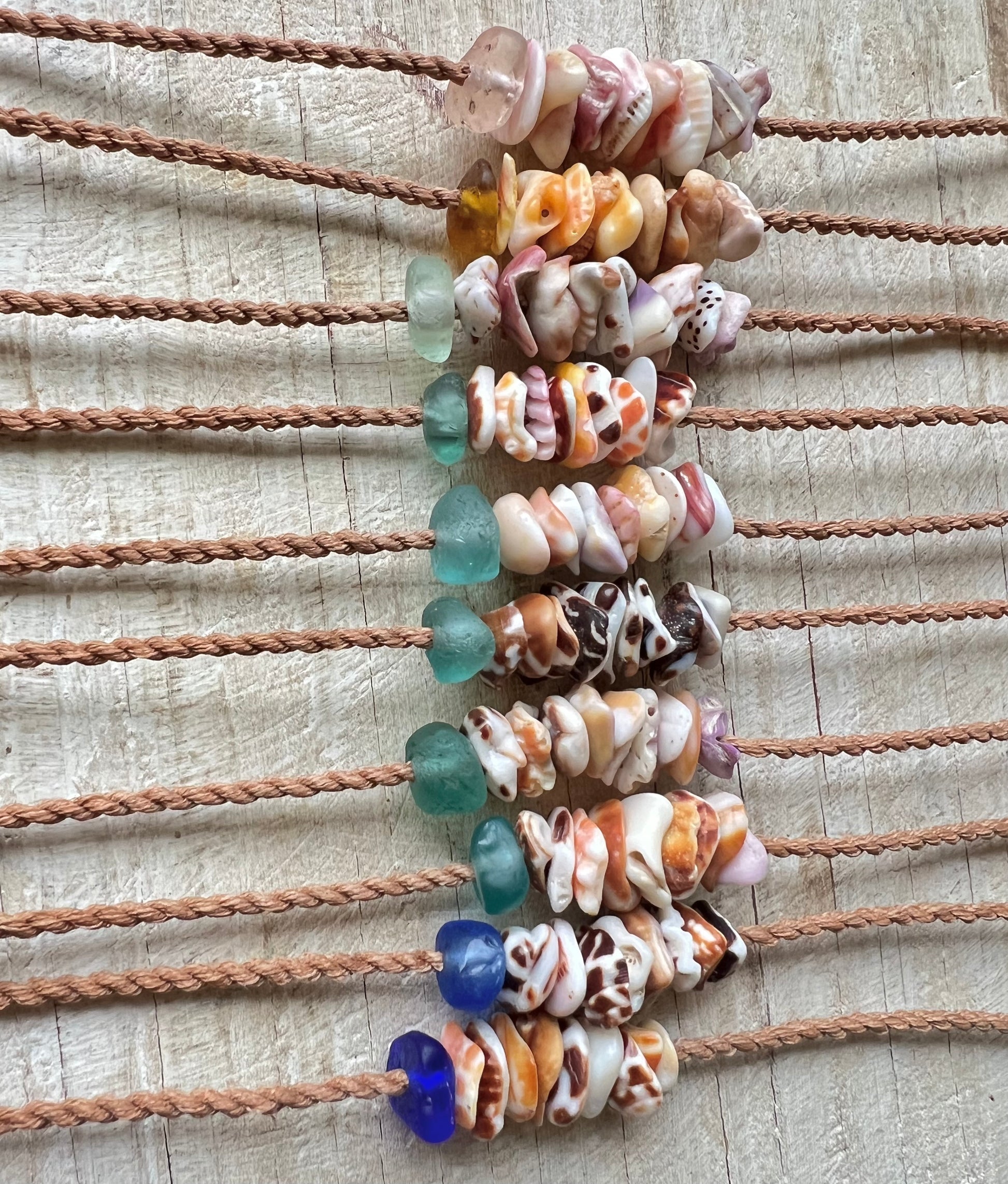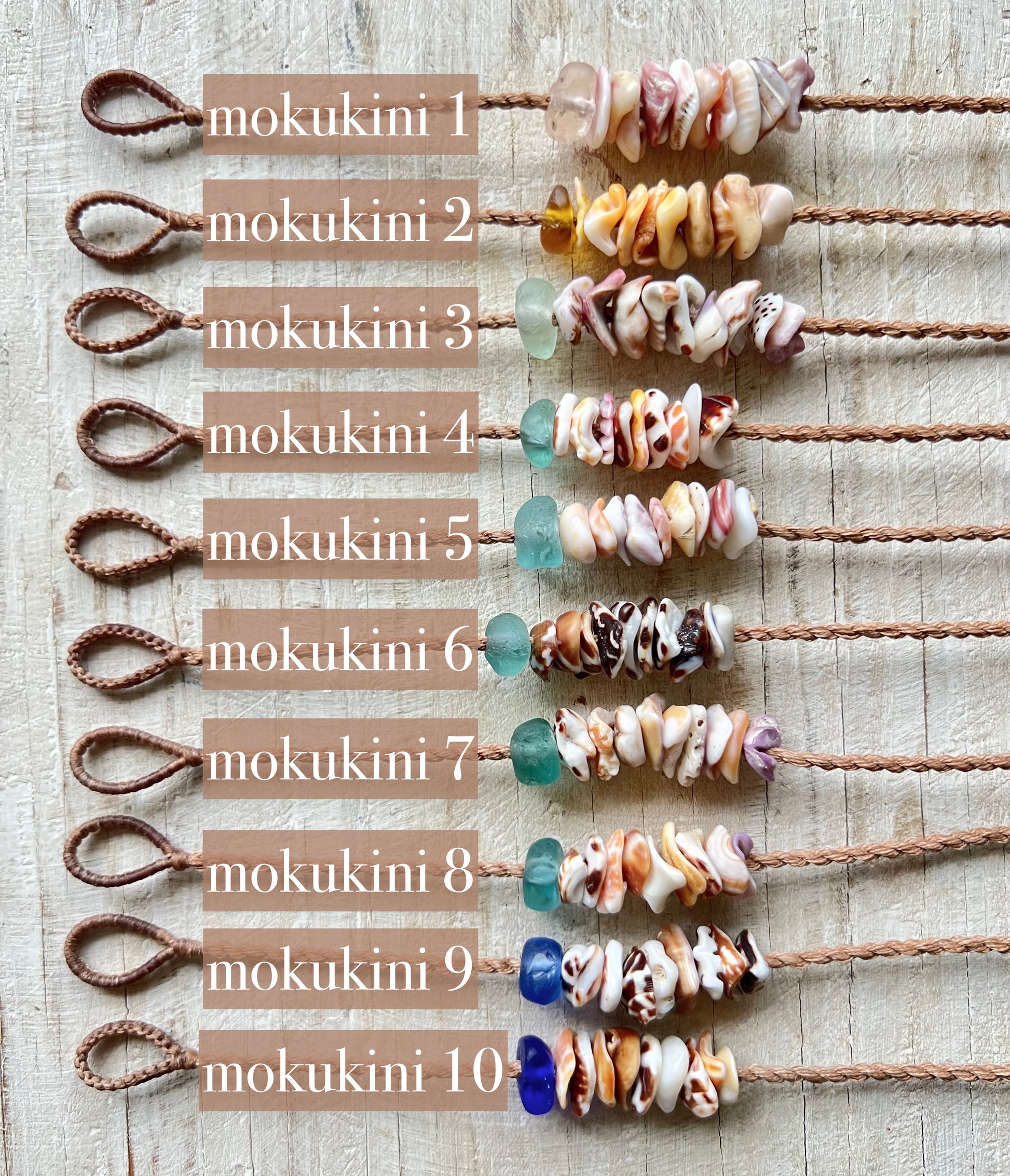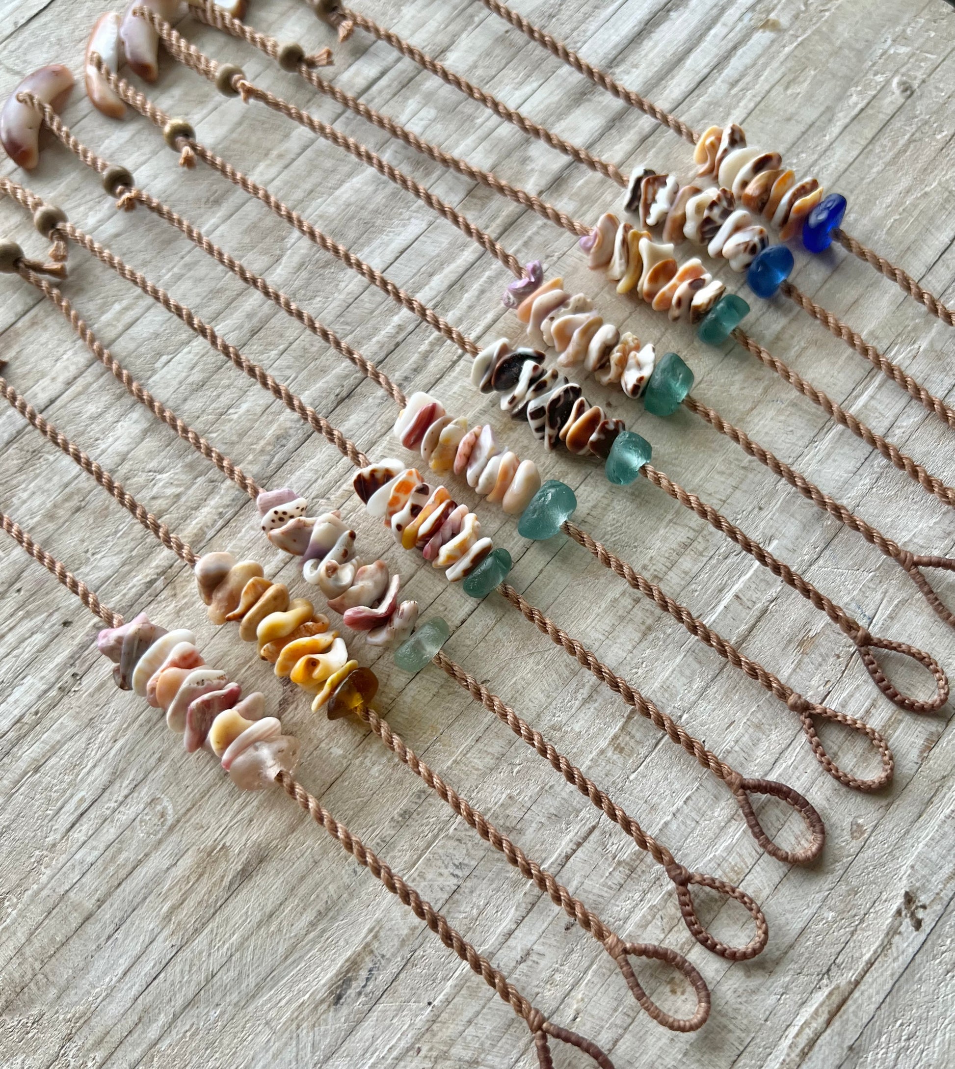 The Mokukini bracelet is a whimsical take on my signature Moku design. These sweet bracelets, made of 8-10 colorful, patterned, surf tumbled shell fragments and one sea glass nugget, couldn't be cuter.