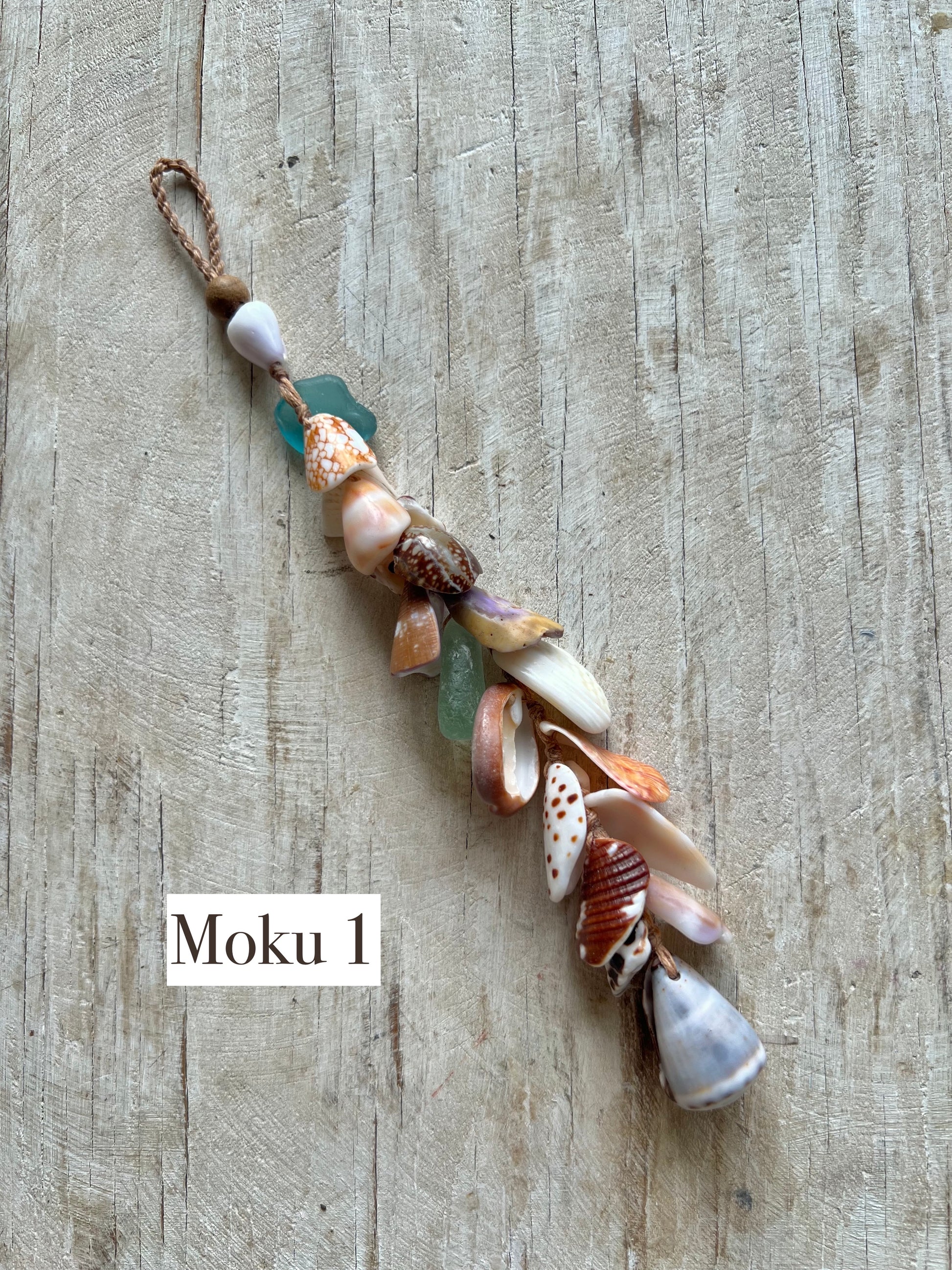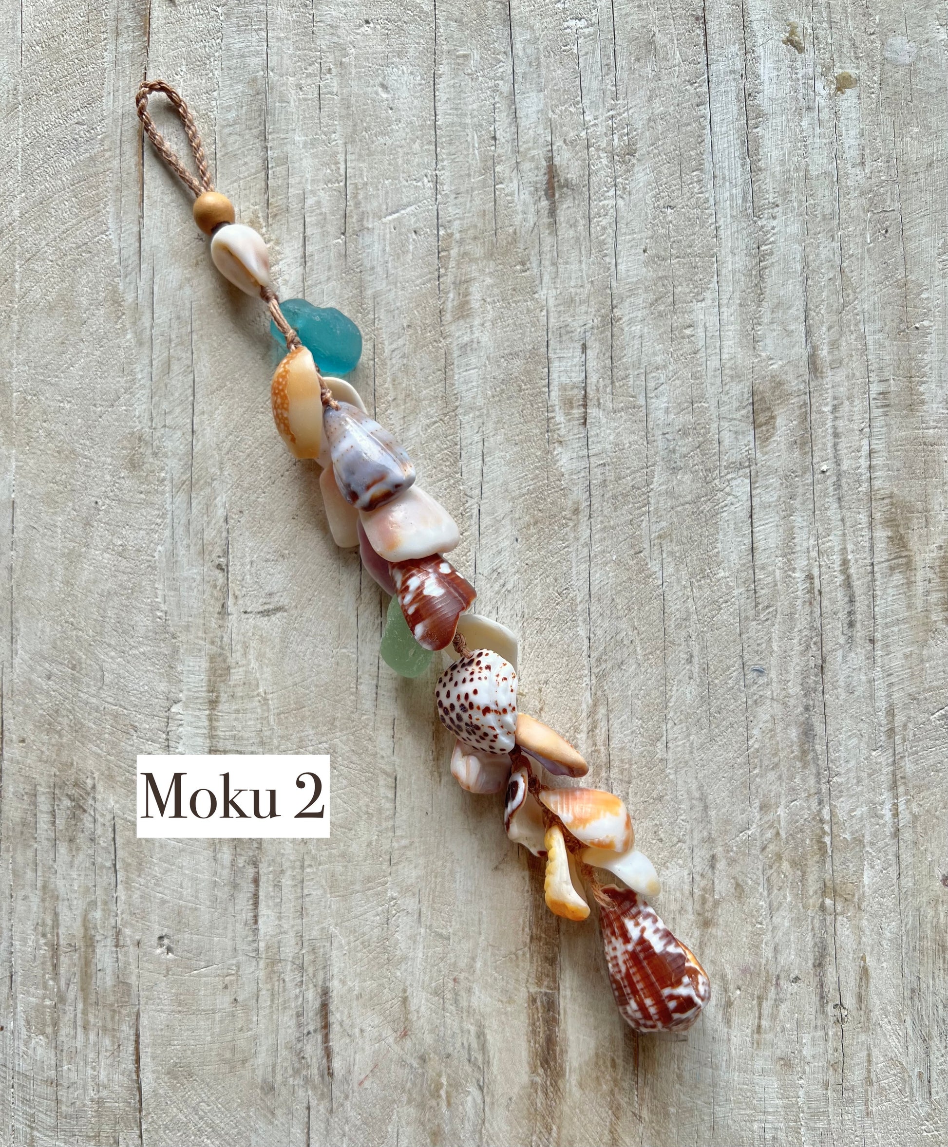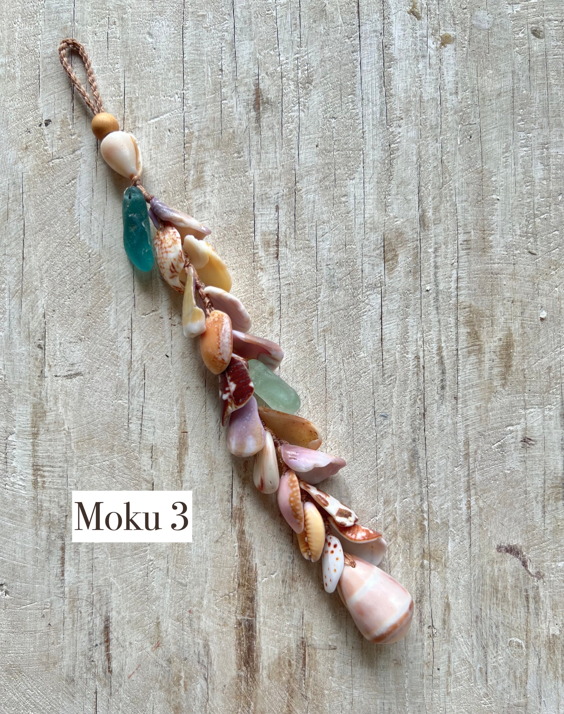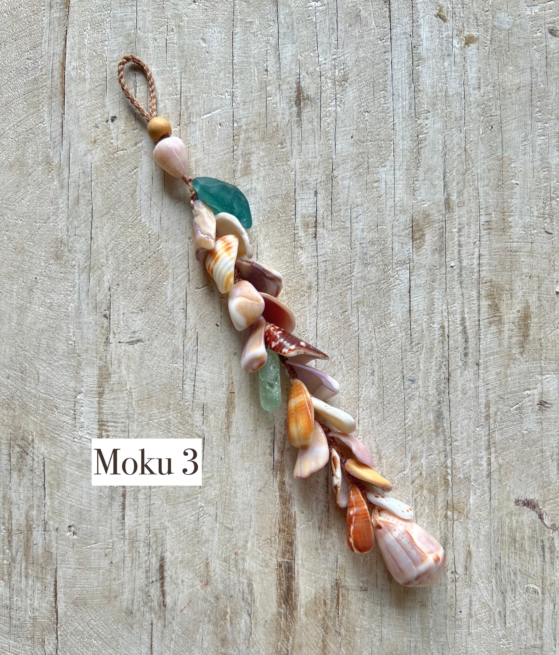 The Moku Sun Catcher is hand tied on waxed polyester thread with 20 ocean treasures on each strand and a perfect chunky shell at the bottom.