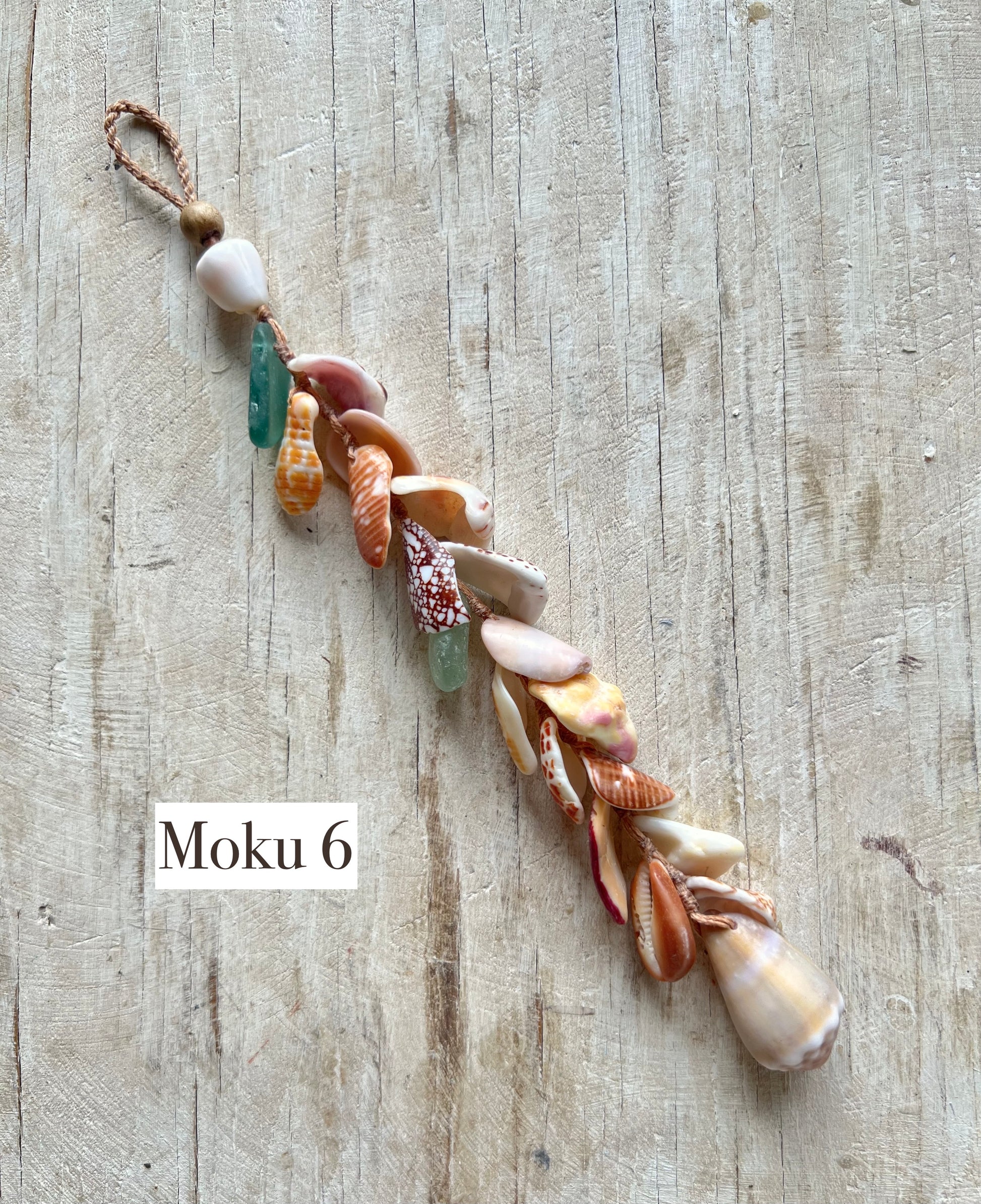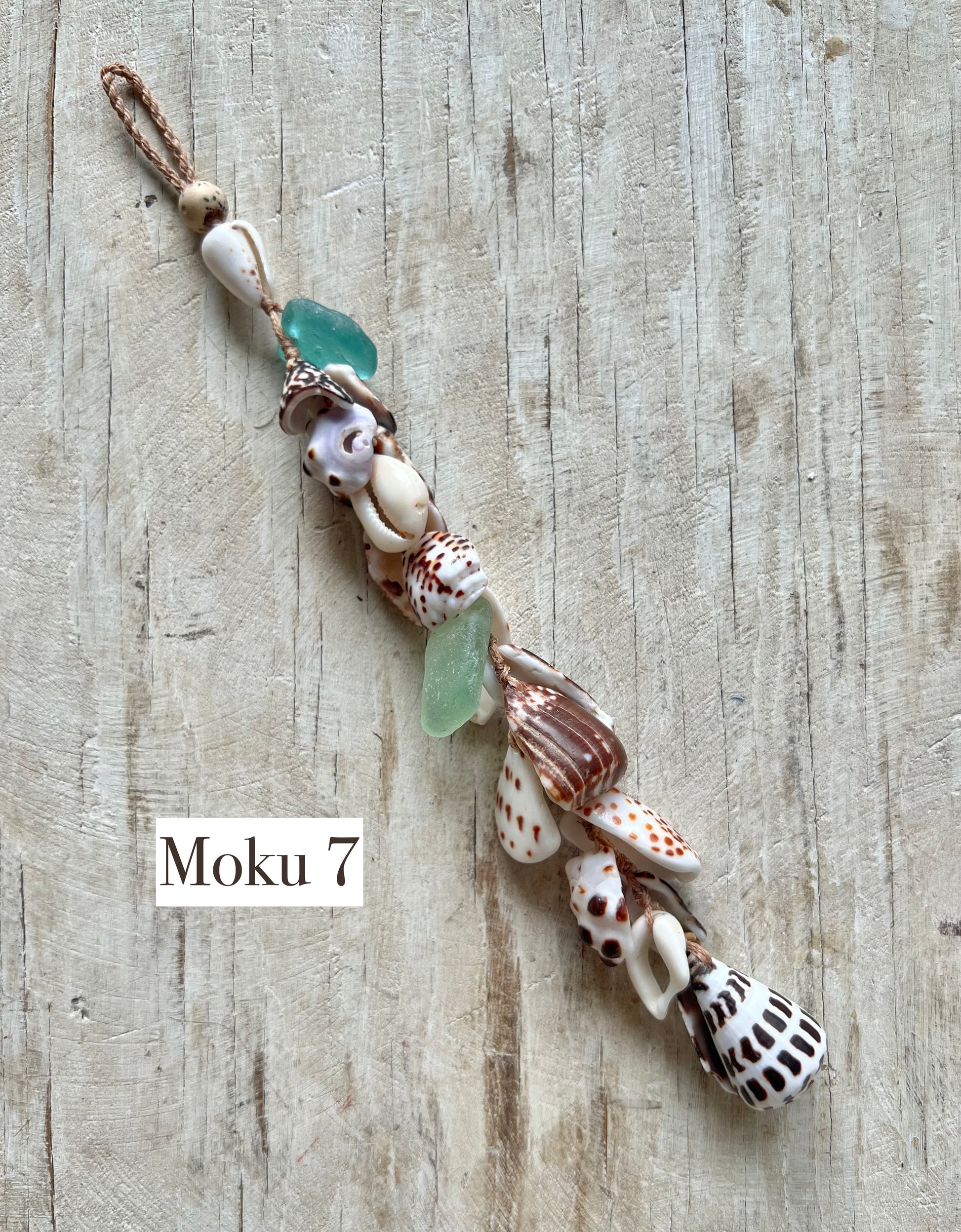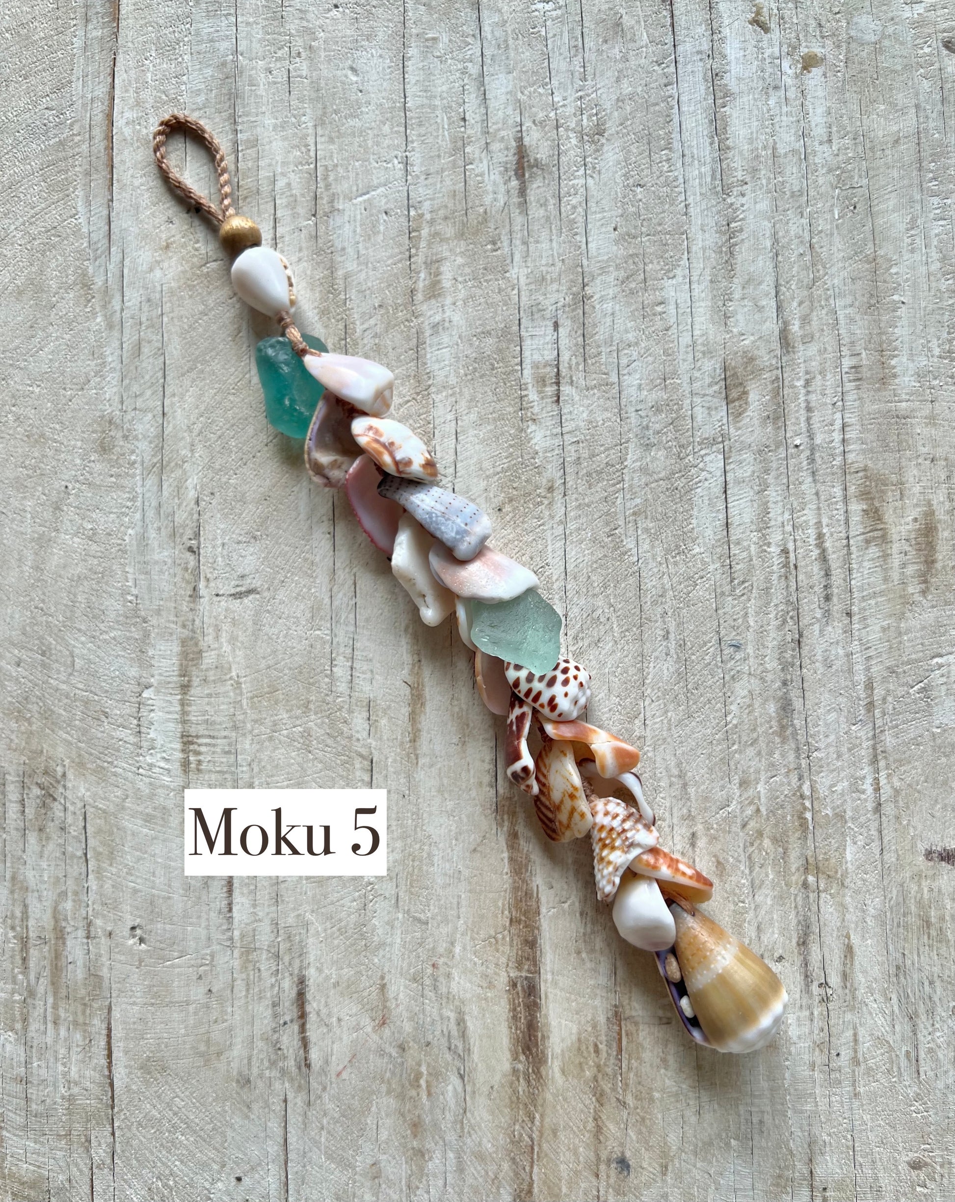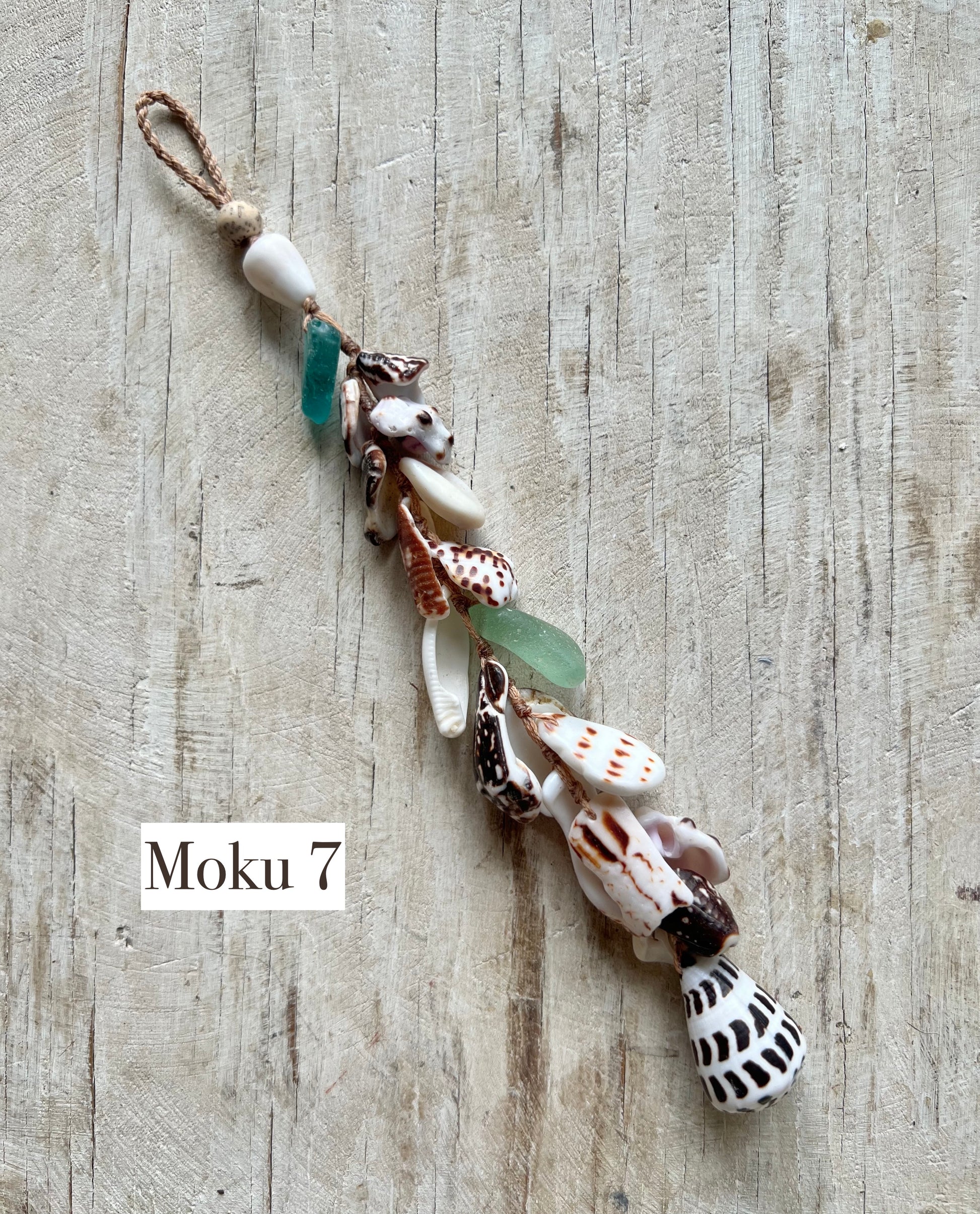 The Moku Sun Catcher is hand tied on waxed polyester thread with 20 ocean treasures on each strand and a perfect chunky shell at the bottom.