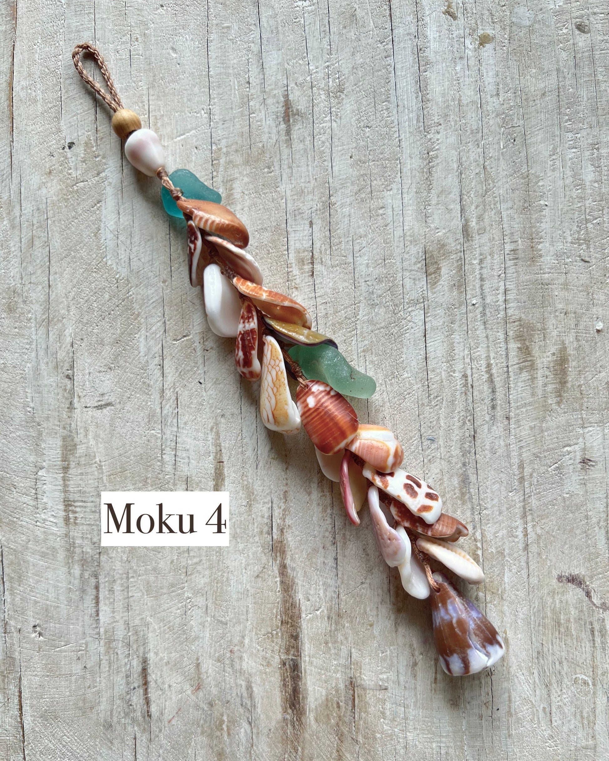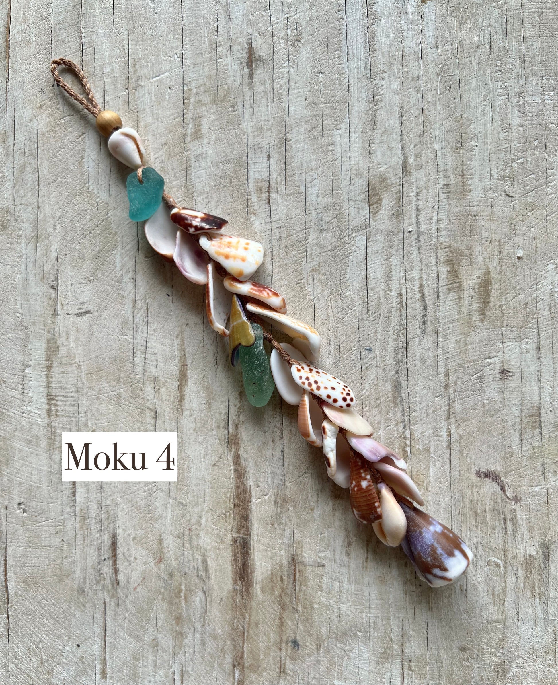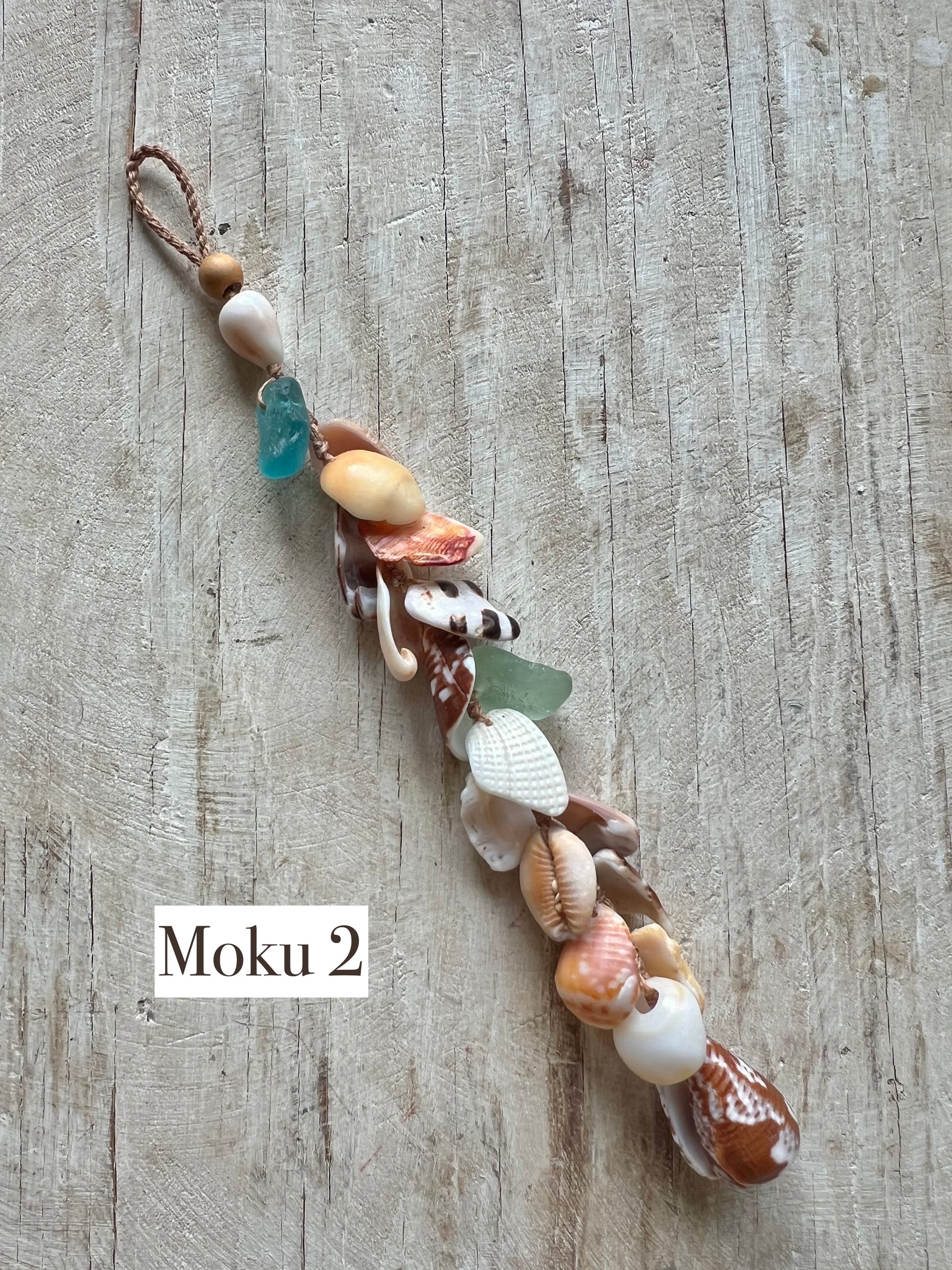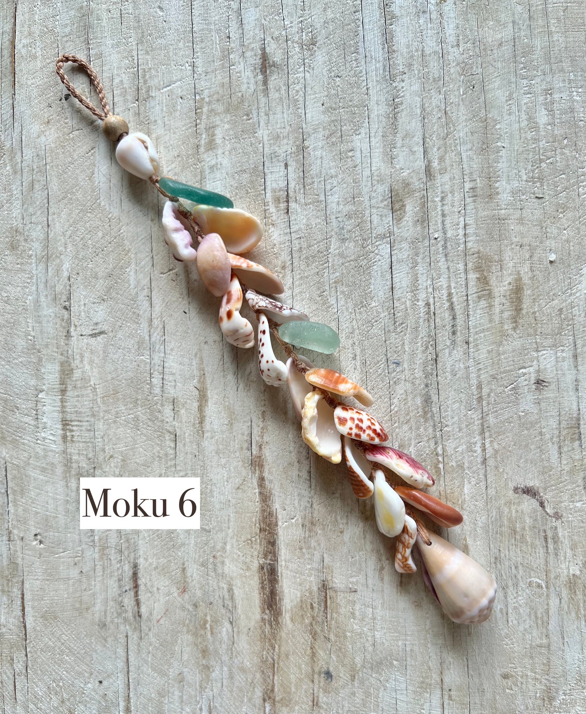 The Moku Sun Catcher is hand tied on waxed polyester thread with 20 ocean treasures on each strand and a perfect chunky shell at the bottom.