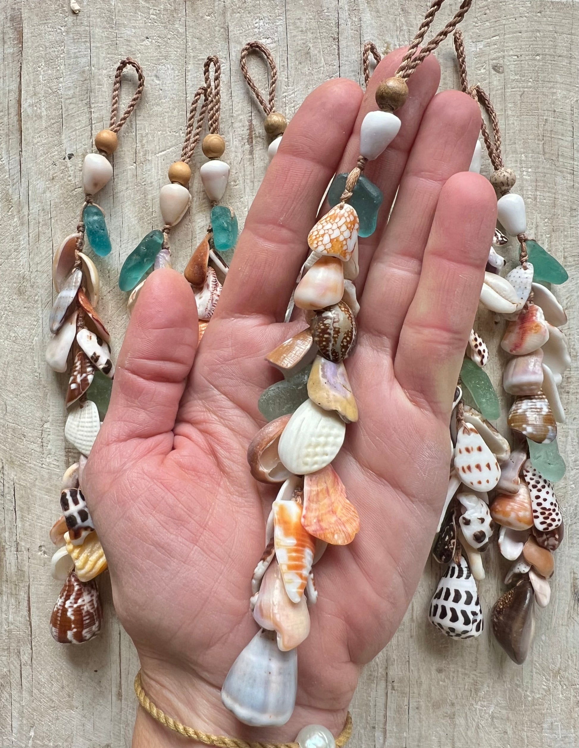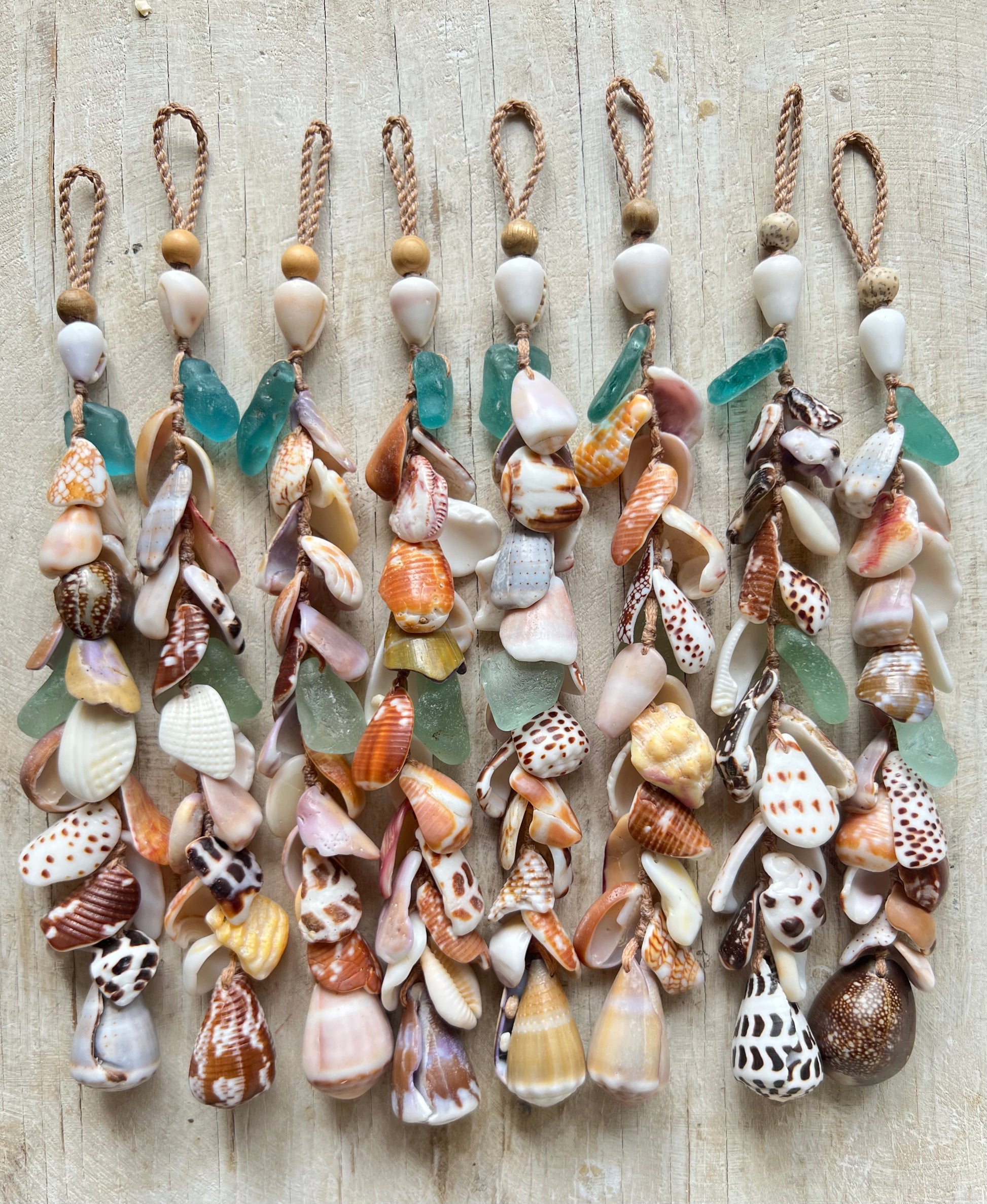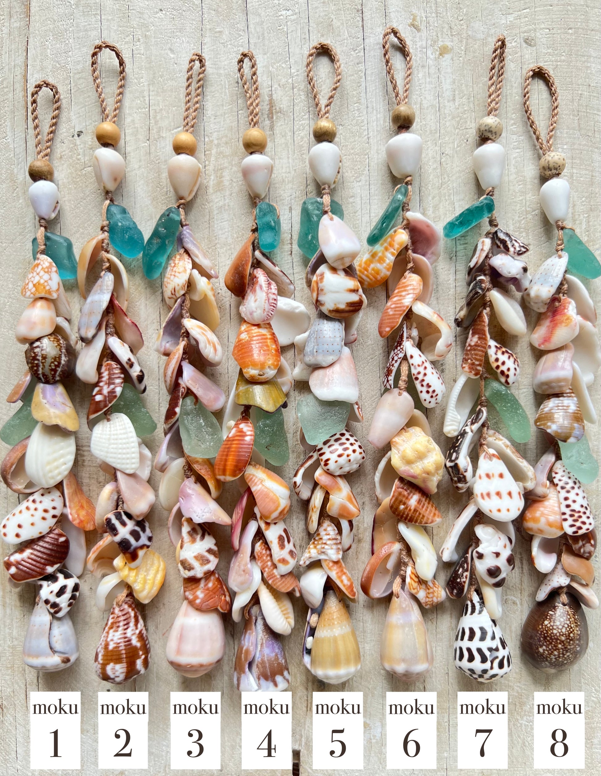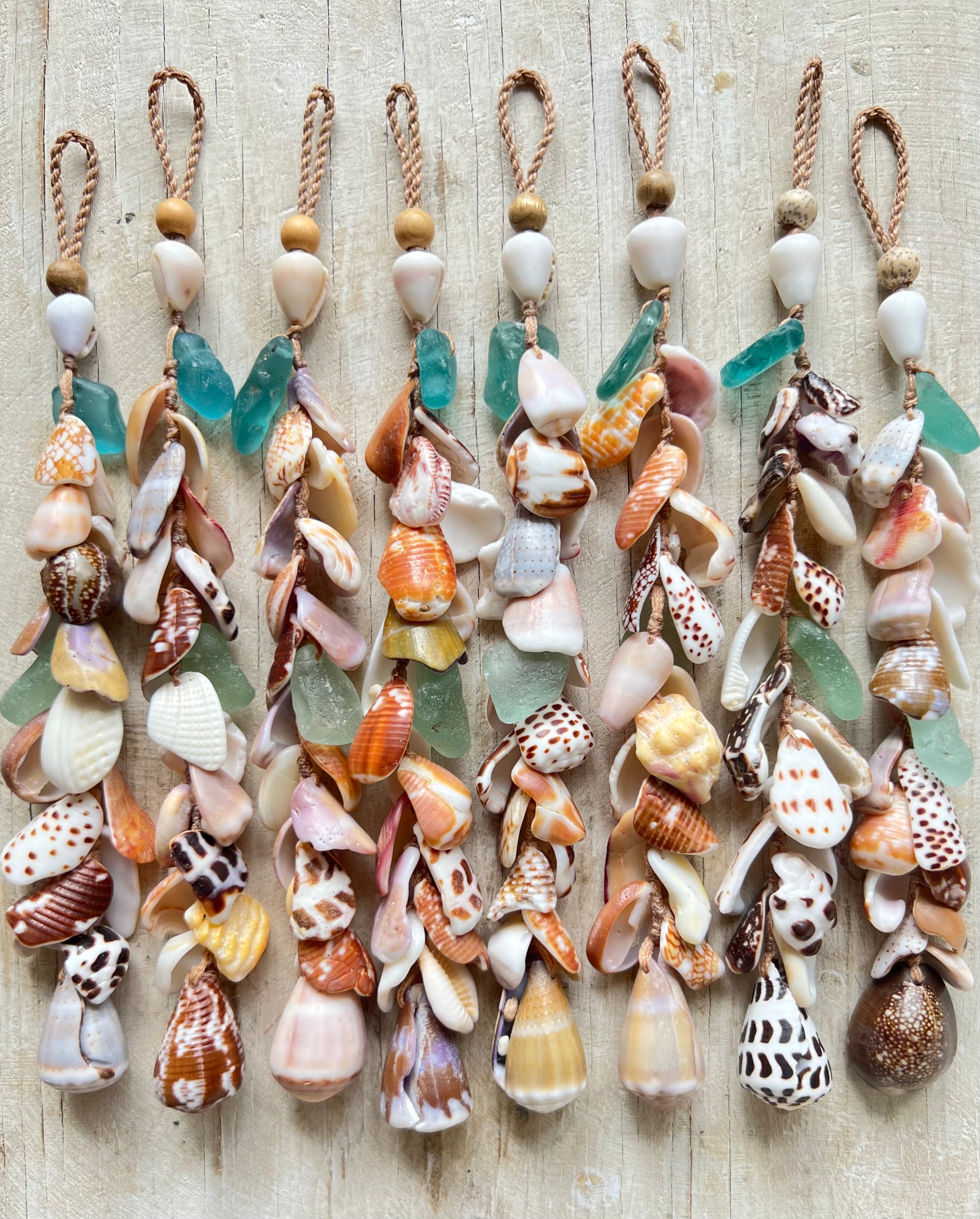 The Moku Sun Catcher is hand tied on waxed polyester thread with 20 ocean treasures on each strand and a perfect chunky shell at the bottom.