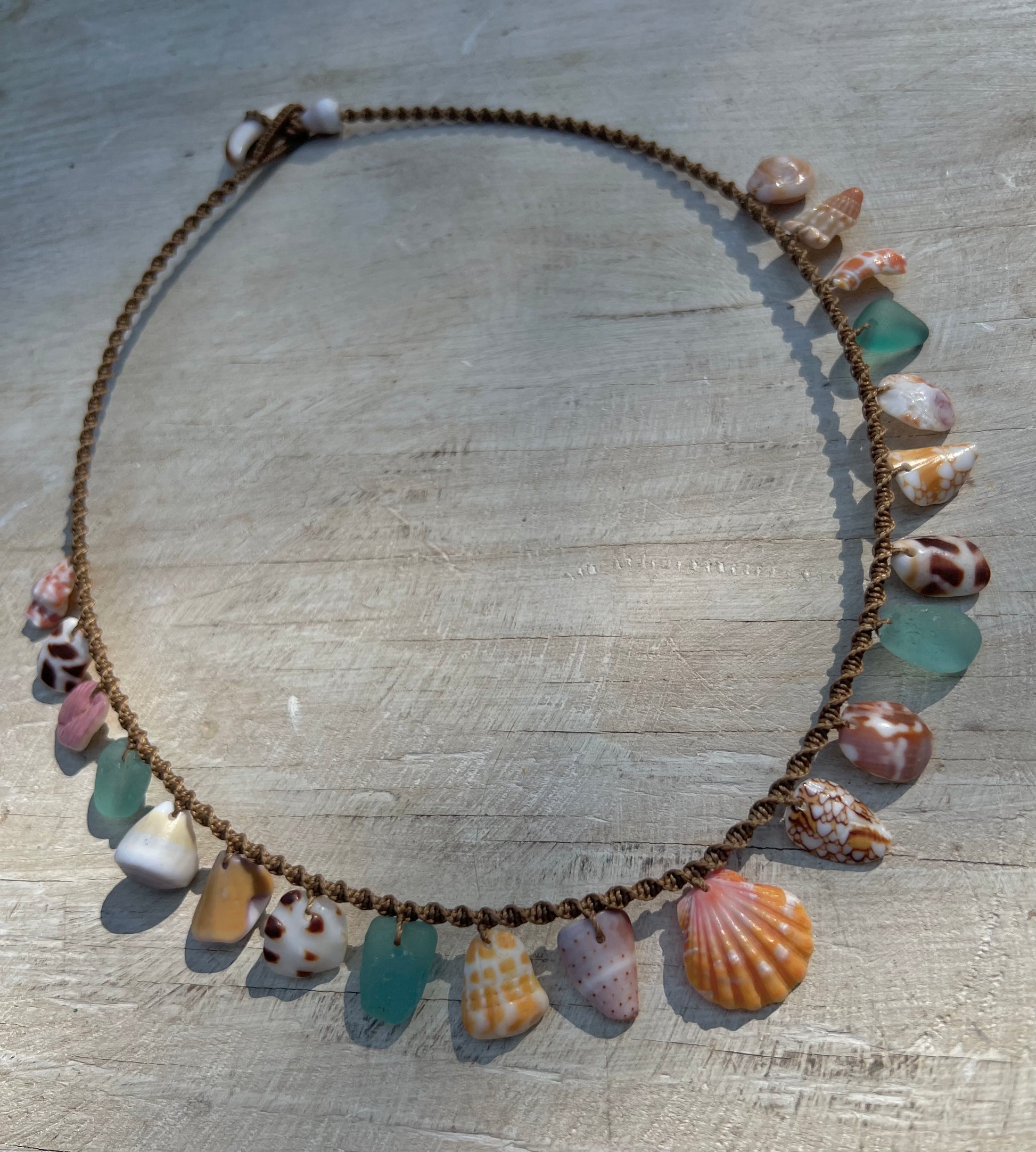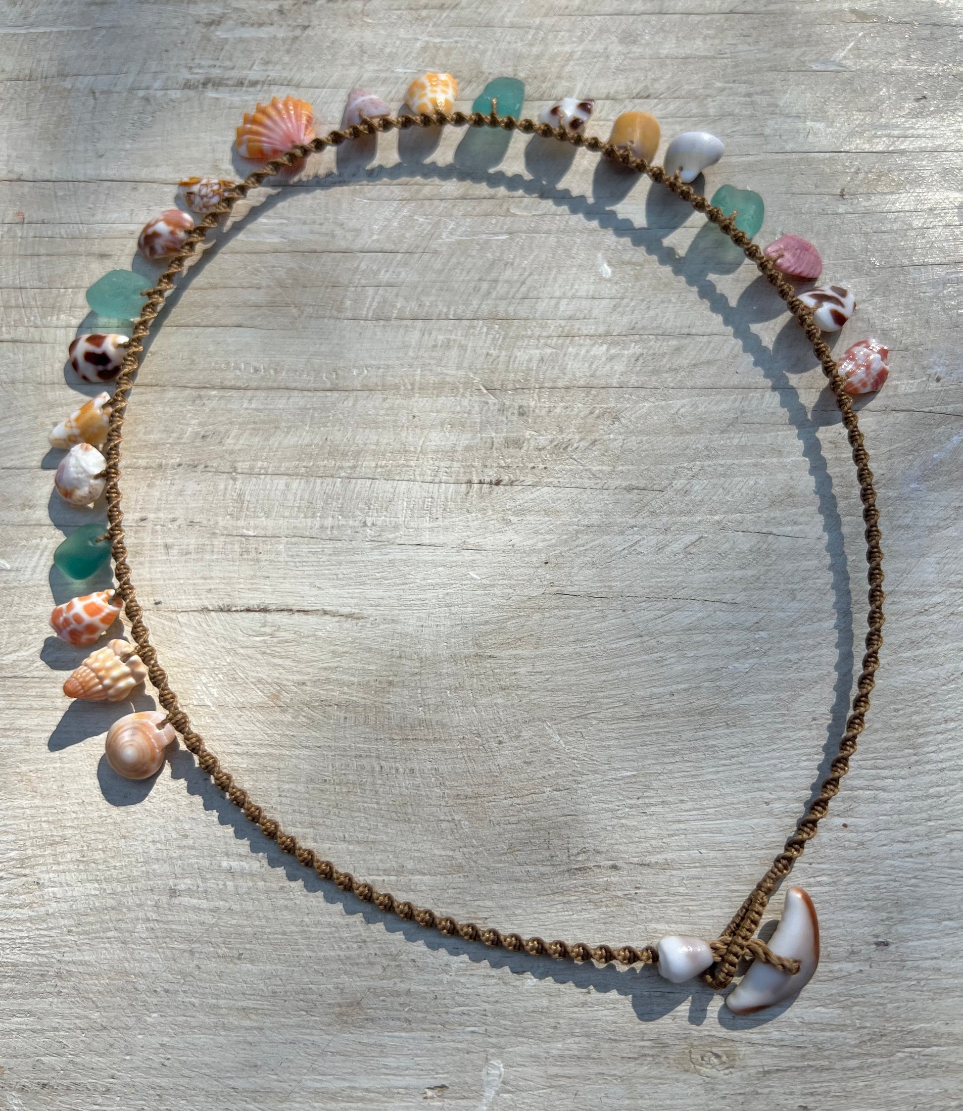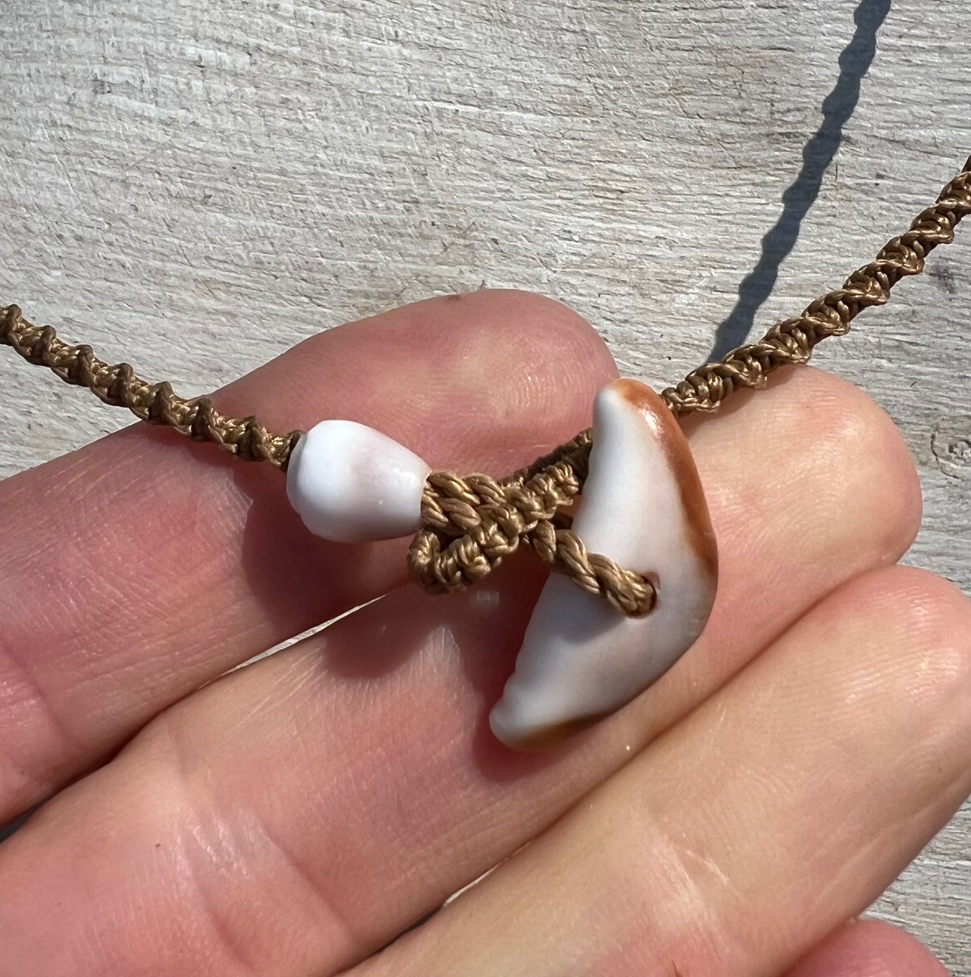 A tweak to the classic Moku style, with shell fragments strung in the center two-thirds of the necklace and a perfect sunrise shell as the star. Twenty inches from end to end with a cowrie lip toggle closure. Hand knotted macrame using 6 ply bonded nylon thread in a warm medium brown shade. The strung shell portion of the necklace measures 11 inches, leaving 4.5 inches of plain macrame cord on each side. A beautifully unique statement piece for a special mermaid :)