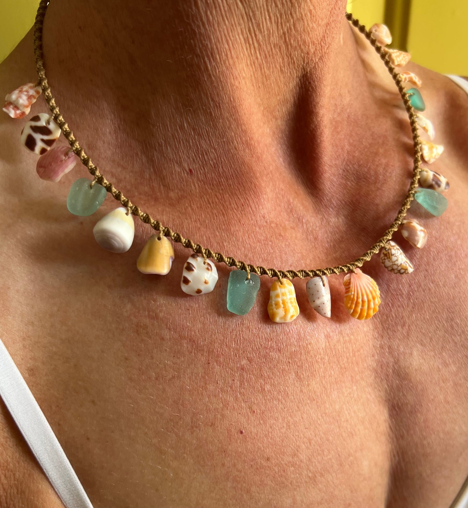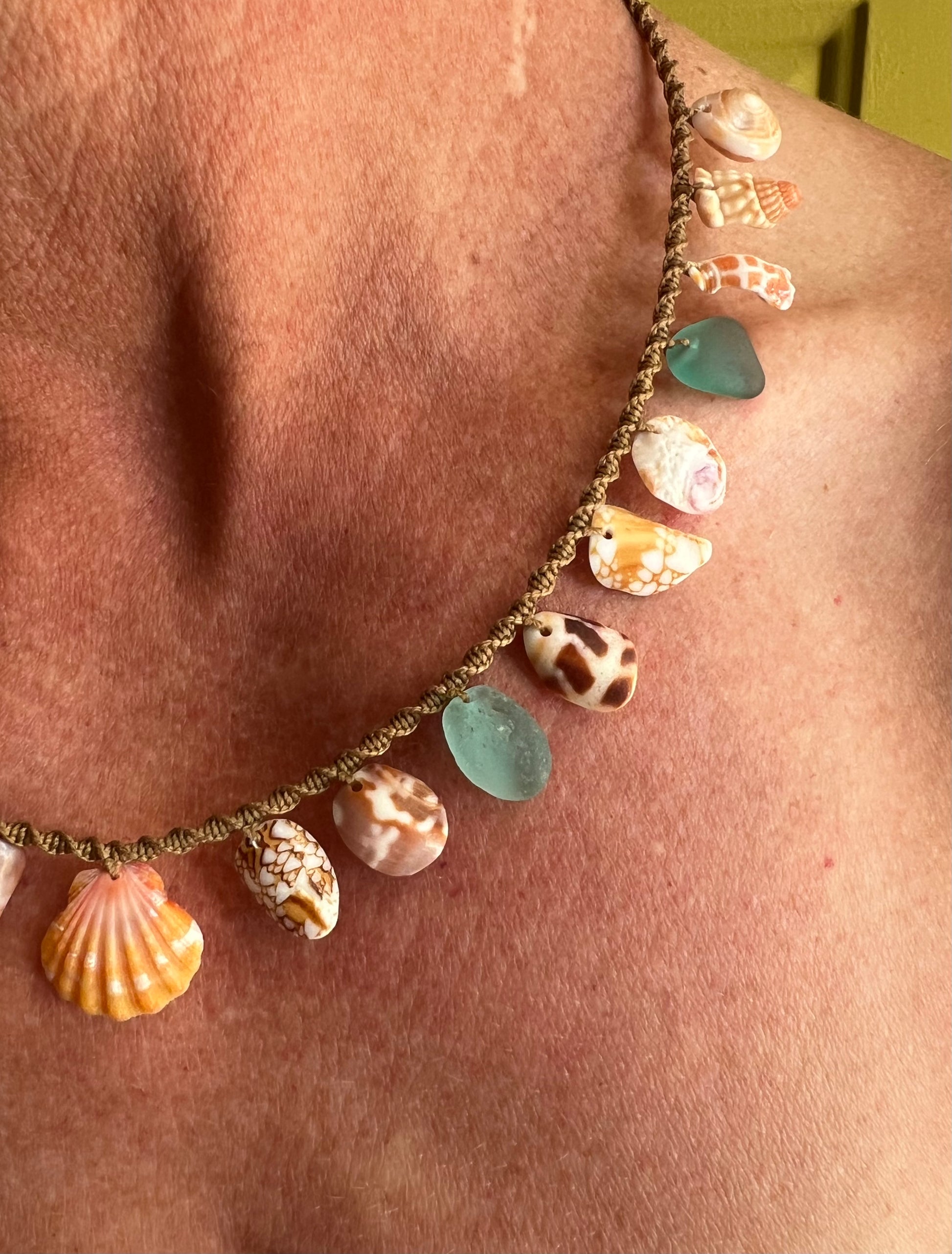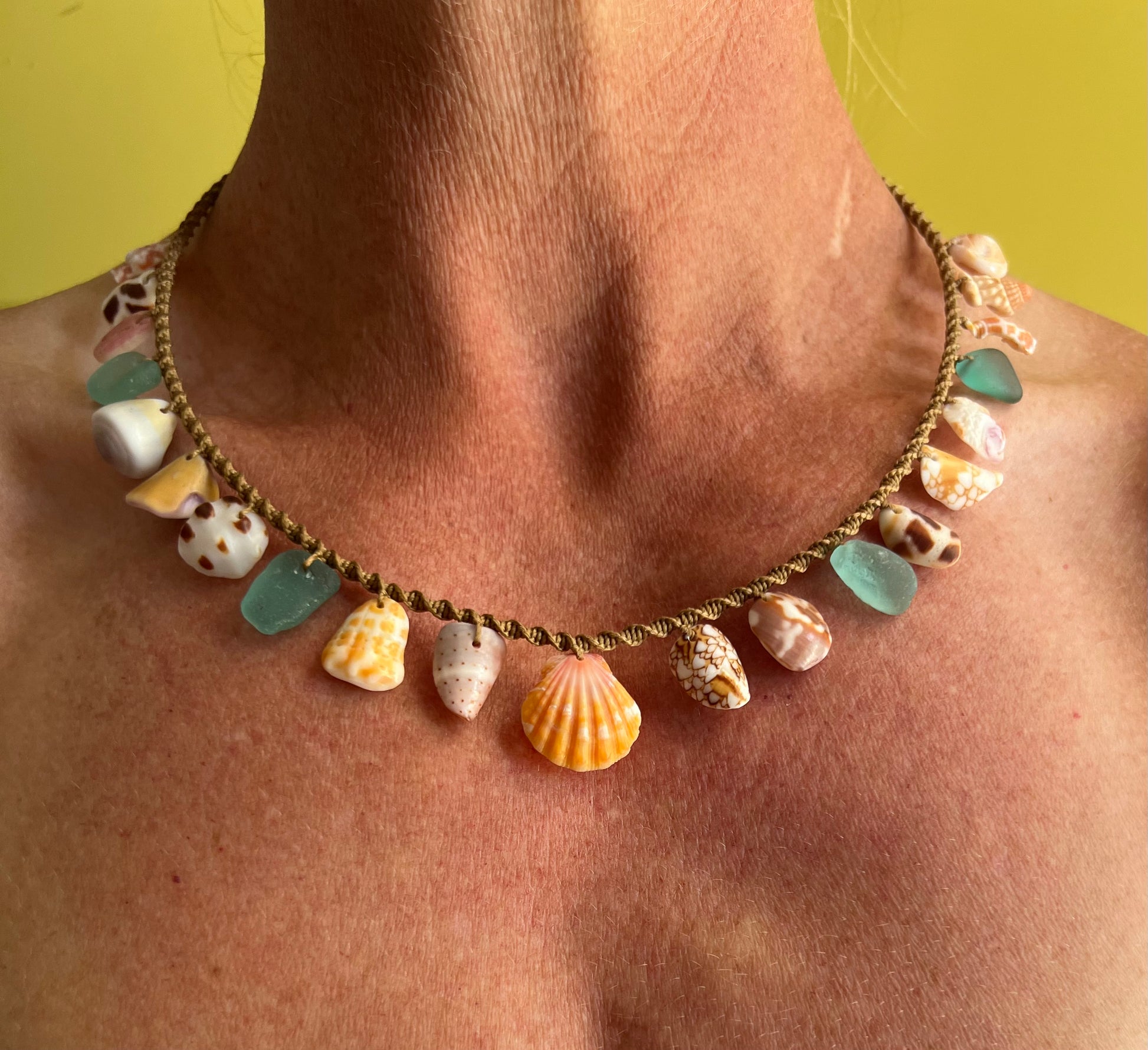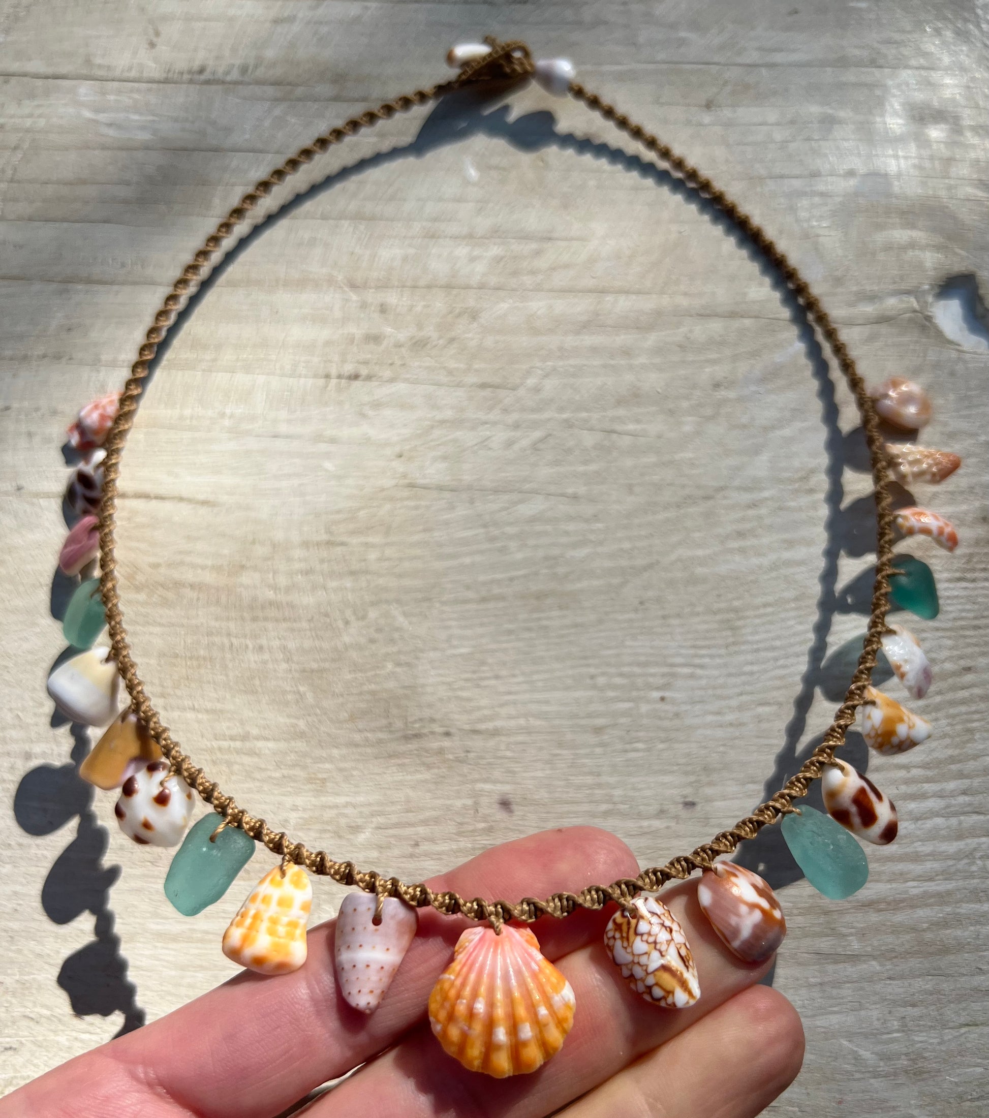 A tweak to the classic Moku style, with shell fragments strung in the center two-thirds of the necklace and a perfect sunrise shell as the star. Twenty inches from end to end with a cowrie lip toggle closure. Hand knotted macrame using 6 ply bonded nylon thread in a warm medium brown shade. The strung shell portion of the necklace measures 11 inches, leaving 4.5 inches of plain macrame cord on each side. A beautifully unique statement piece for a special mermaid :)