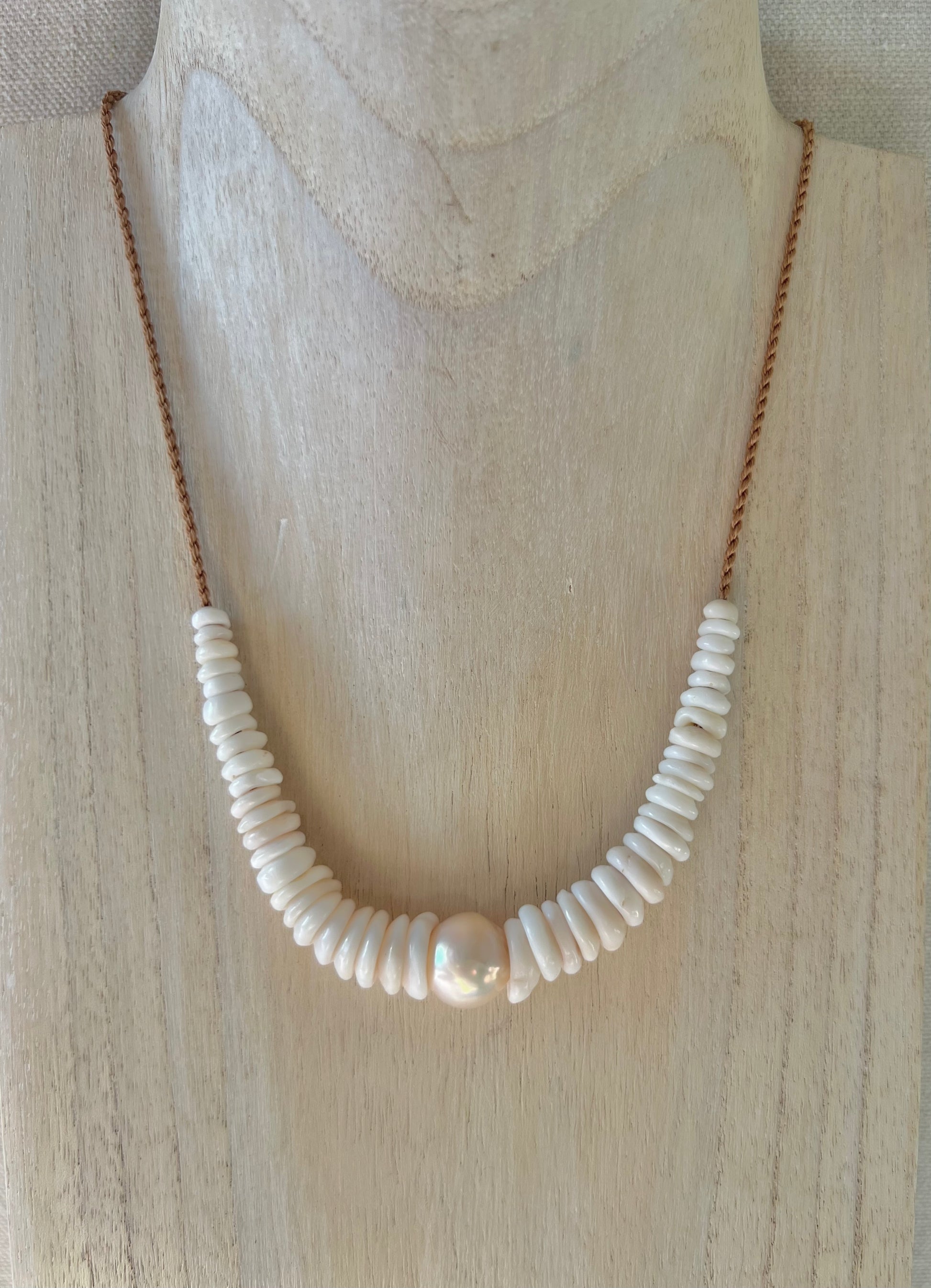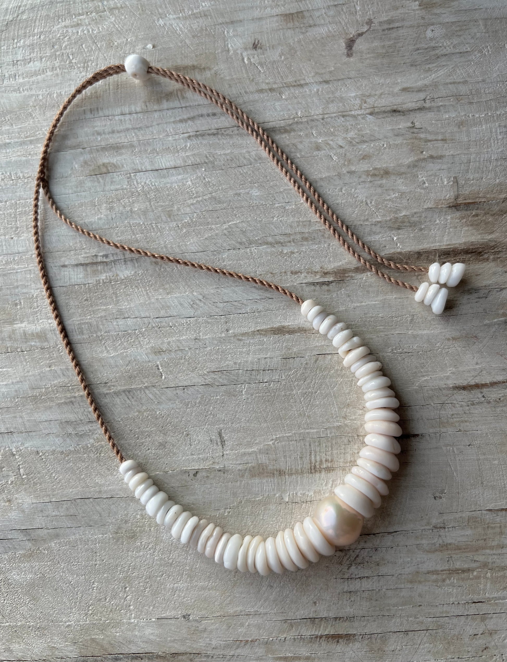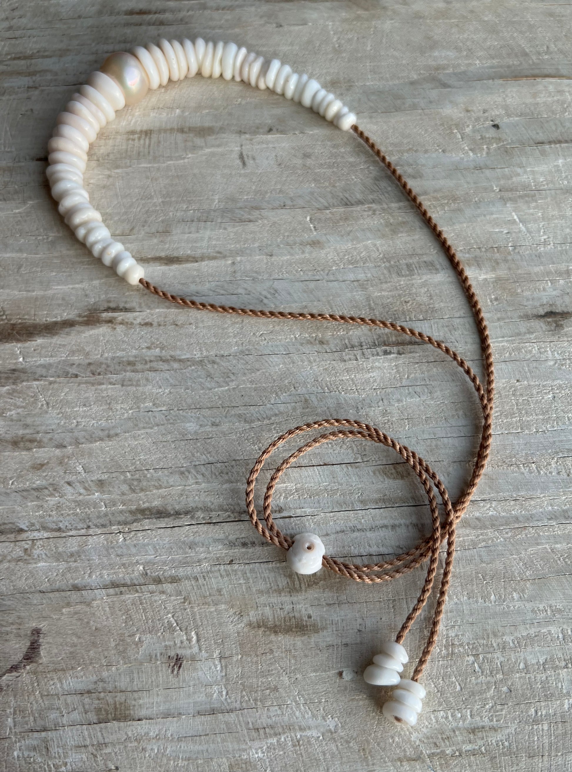 The secure adjustable closure is created using a cone top that has been drilled vertically. Each cord end is finished with 3 miniature pukas. The details and of this necklace are sweetly feminine as well as durable and functional.