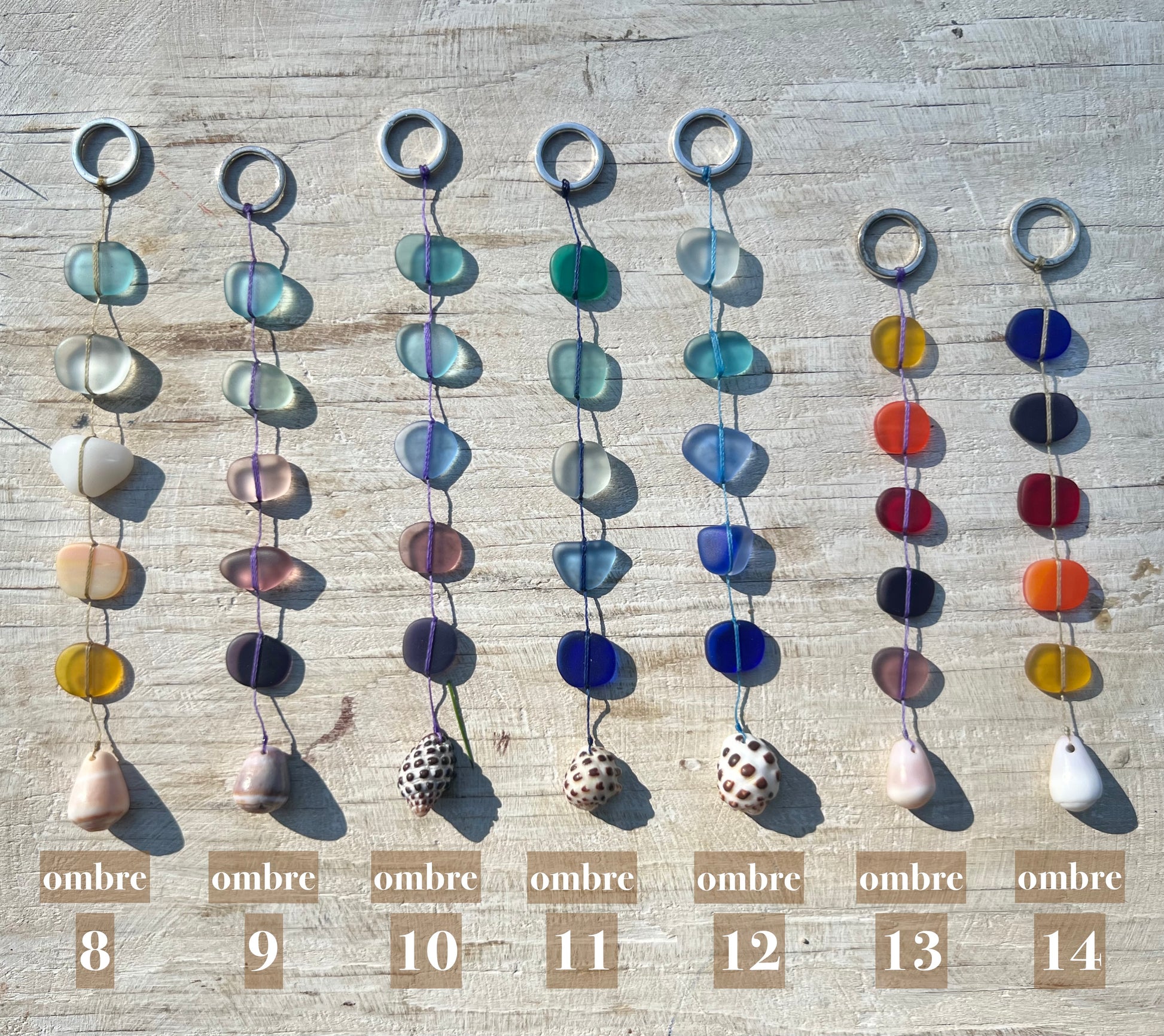 'Ōpala Ombre Car Charms (approximately 5 inches long) are 5 pieces of machine tumbled recycled glass ('Ōpala means "trash" in Hawaiian) hand strung on either colorful nylon cord, and weighted at the end with a surf tumbled shell or Swarovski crystal. At the top, a silver ring allows for easy hanging with the included 2 inch ball chain connector. These sun catchers will sparky brilliantly in bright natural light and are perfect for hanging from your rearview mirror.