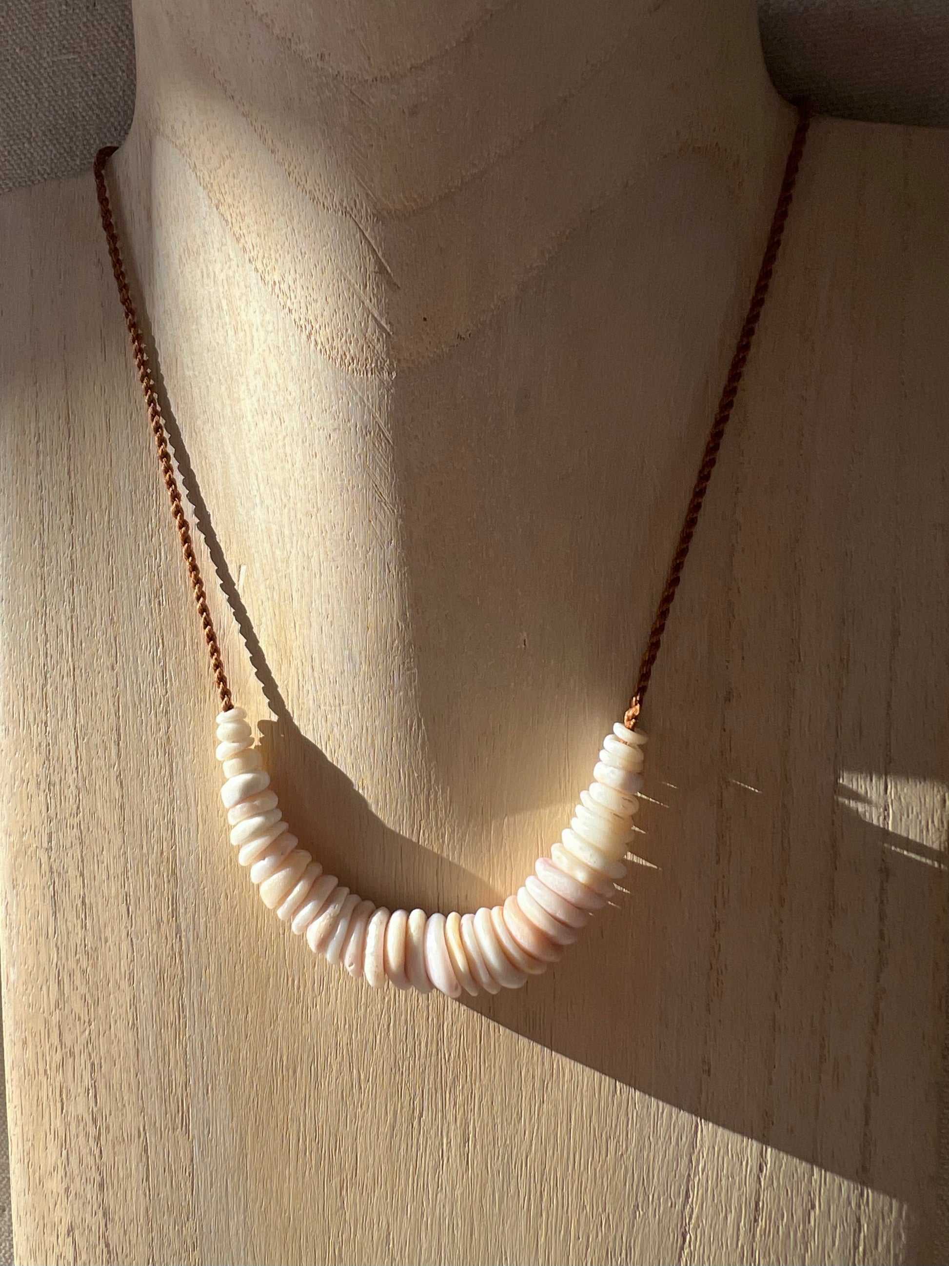 This authentic collection of natural pukas is strung, small to large and back again, on hand twisted 4 ply rope (made from flat waxed polyester thread) in an almond shade of medium brown.