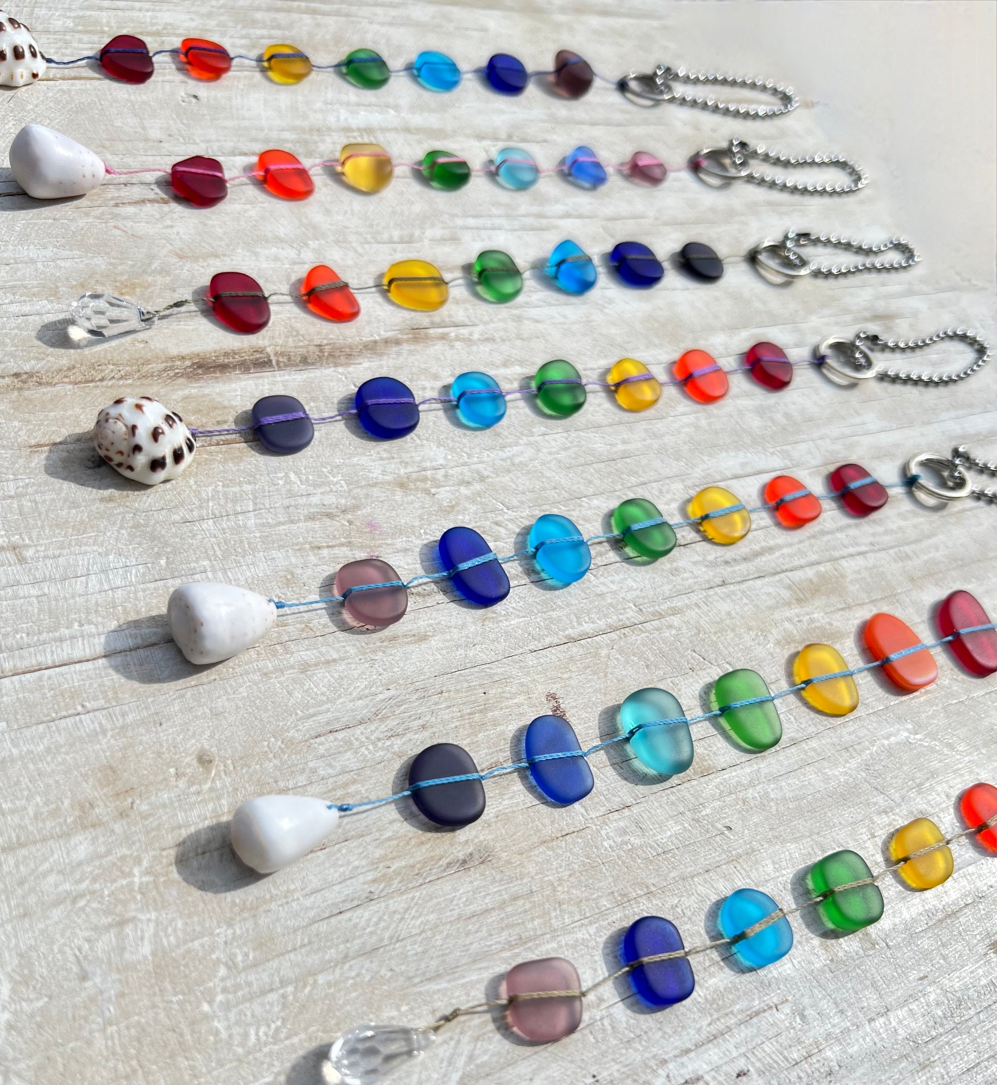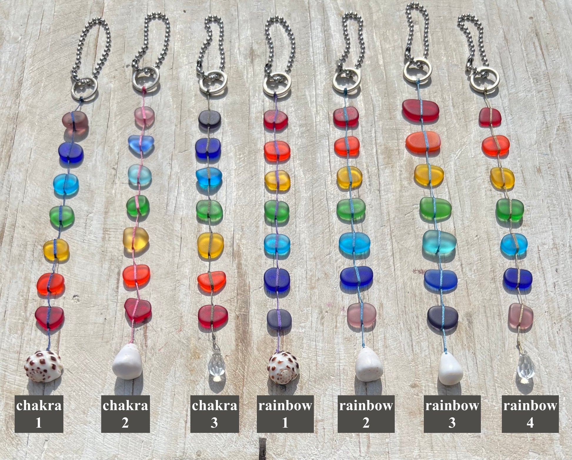Recycled Rainbow car charms (approximately 7.5-8 inches long) are 7 pieces of machine tumbled "dump glass" or "'opala glass" (both are names I have given to this material) hand strung on durable nylon cord, weighted at the end with a surf tumbled shell or light catching Swarovski crystal. At the top, a silver ring allows for easy hanging with the included 2 inch ball chain connector. These sun catchers will sparky brilliantly in bright natural light and are perfect for hanging from your rearview mirror.