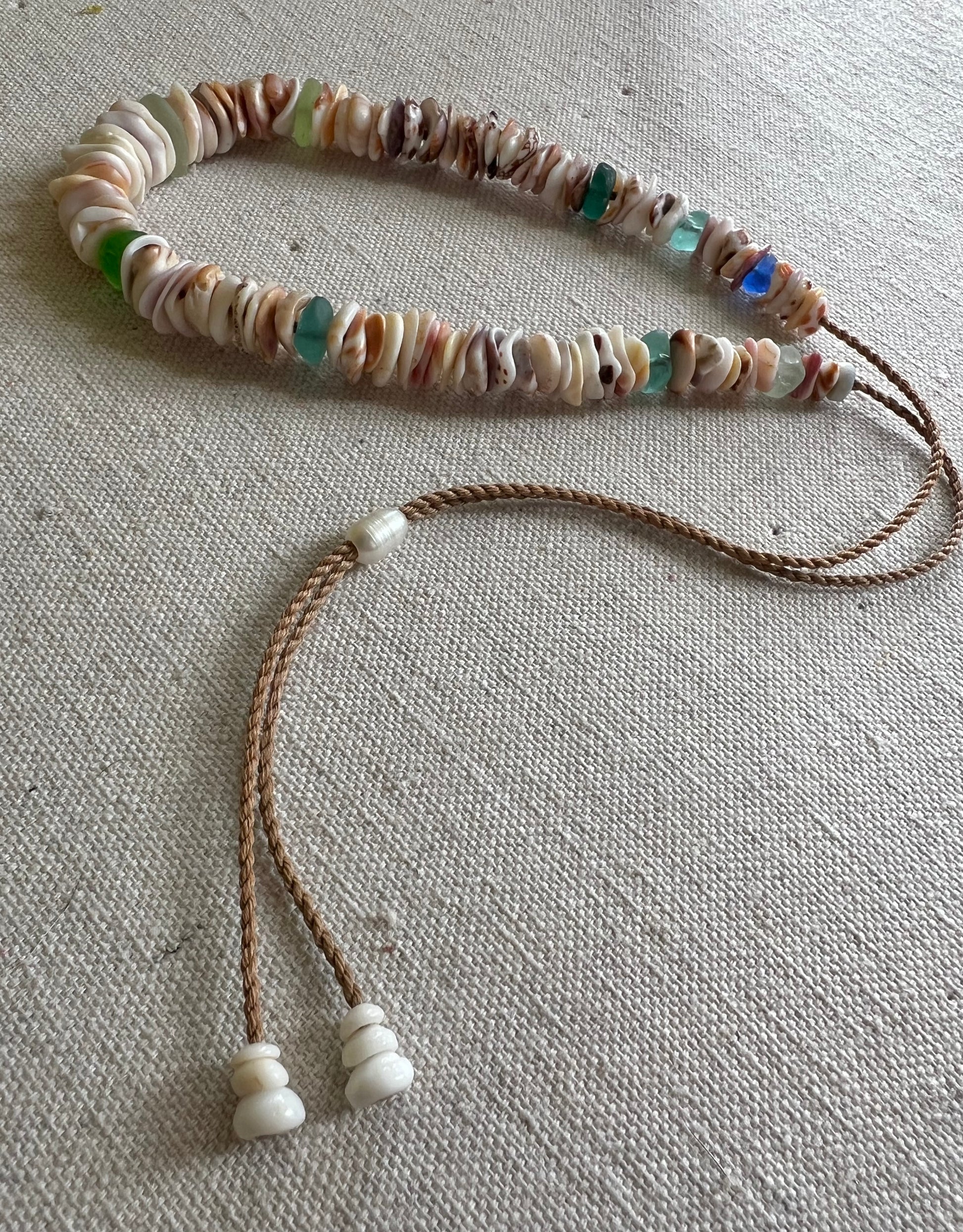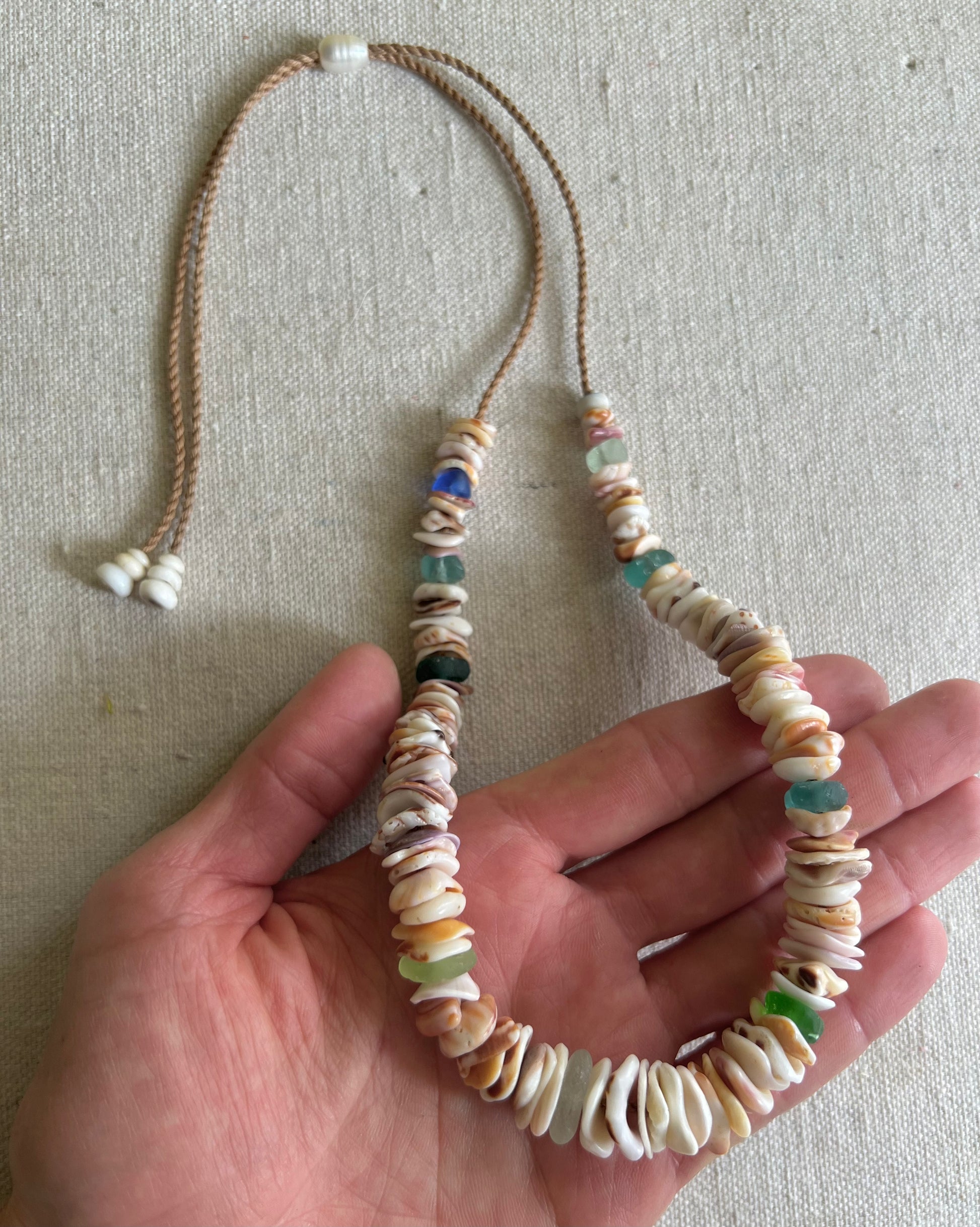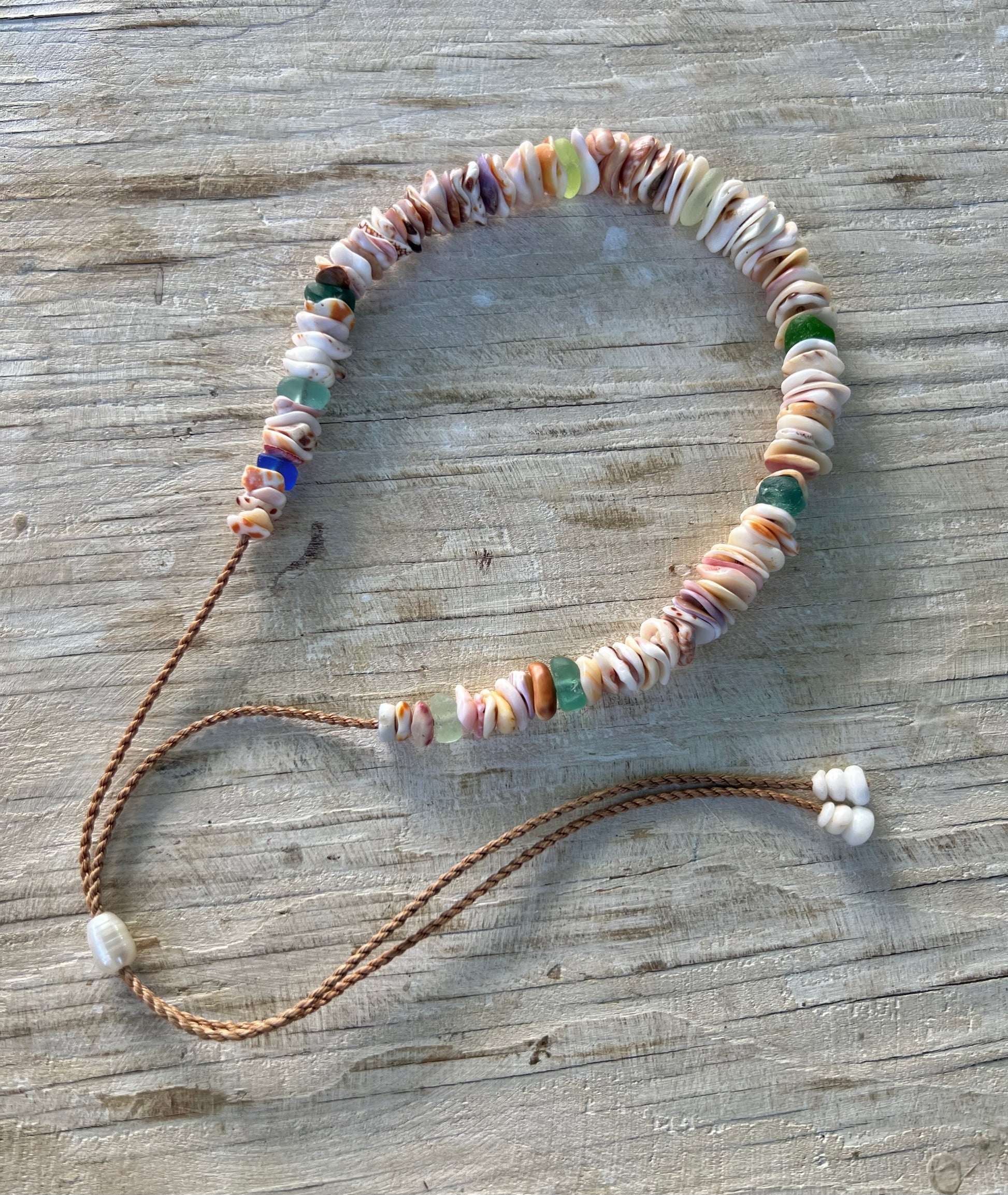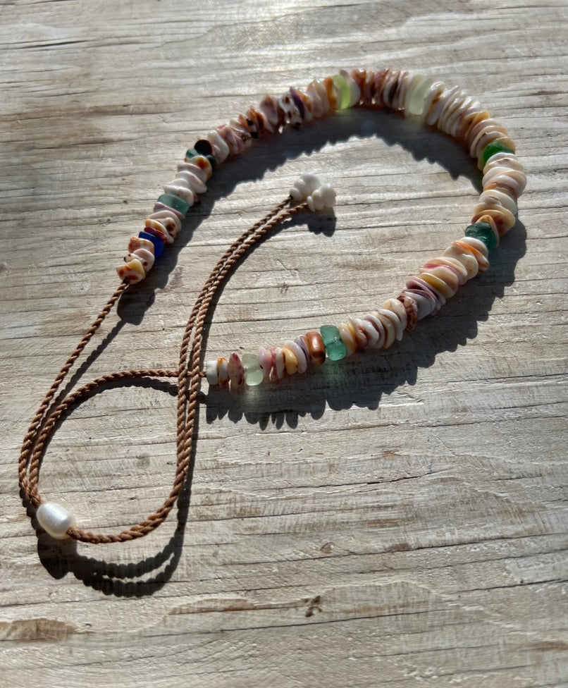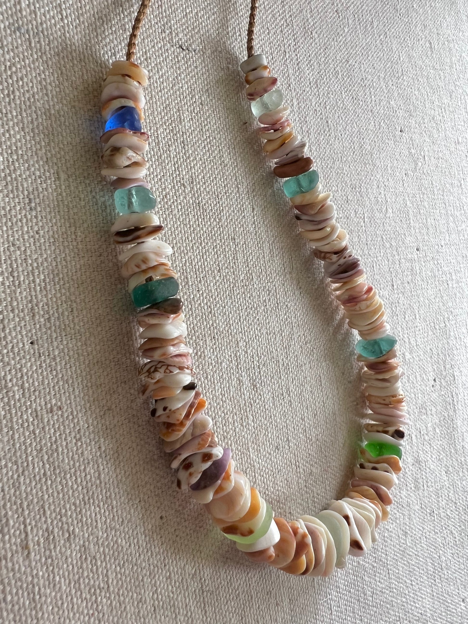 Fifteen and a half inches of surf tumbled shell fragments (all chosen for their deep colors and dynamic patterns) and nine chunky pieces of vintage sea glass float on hand twisted rope cord in a random but stunningly organic pattern,.