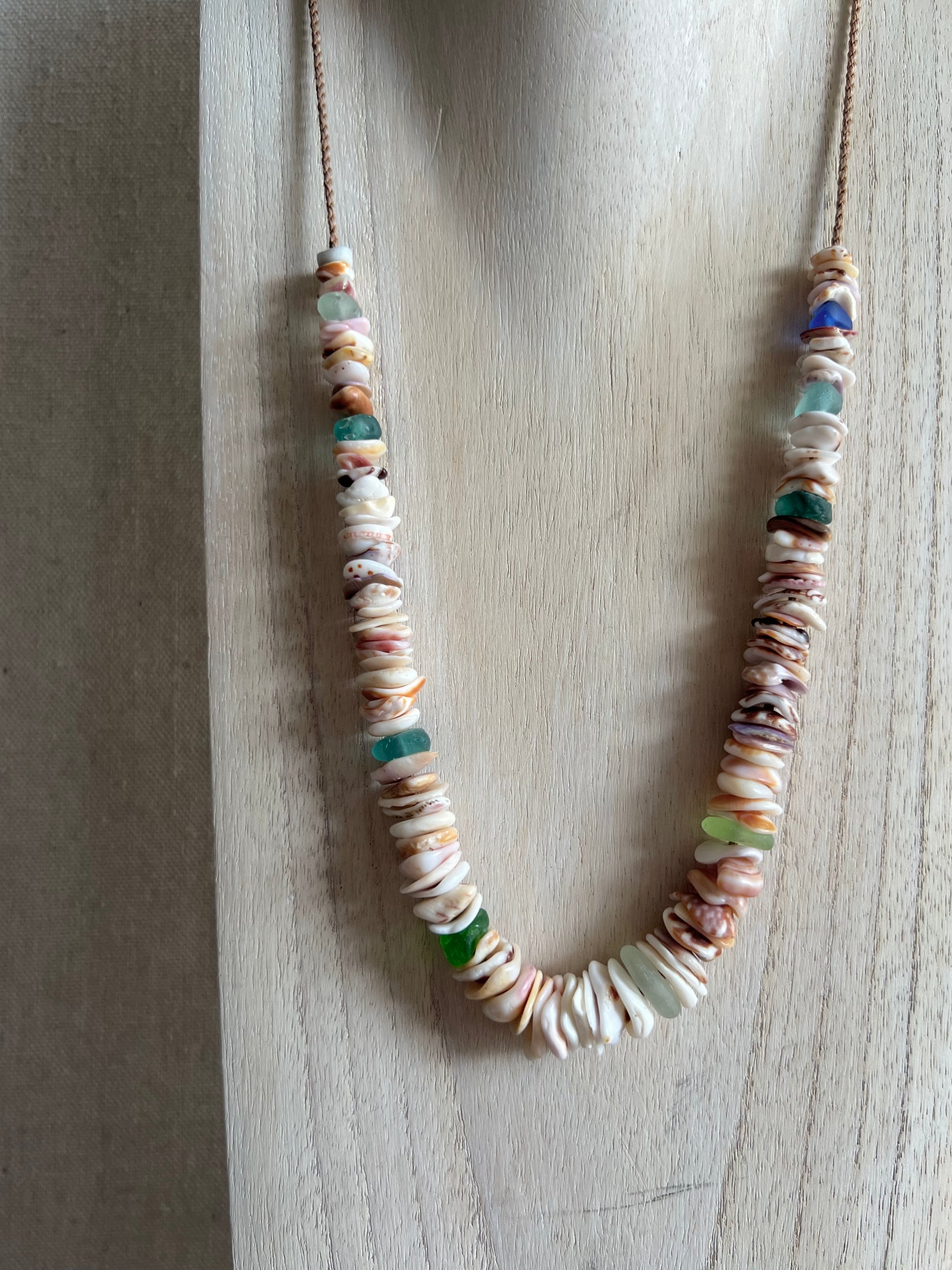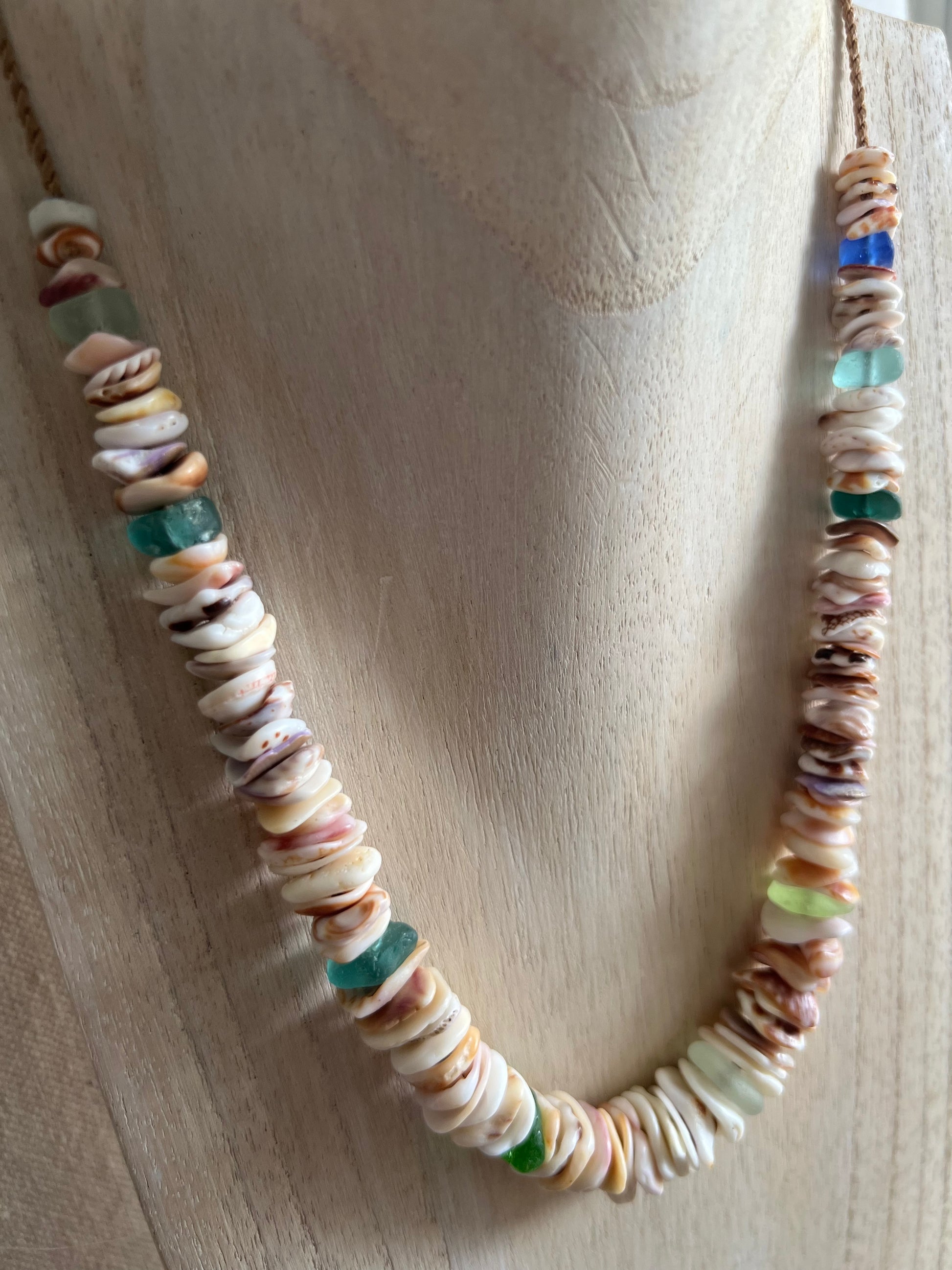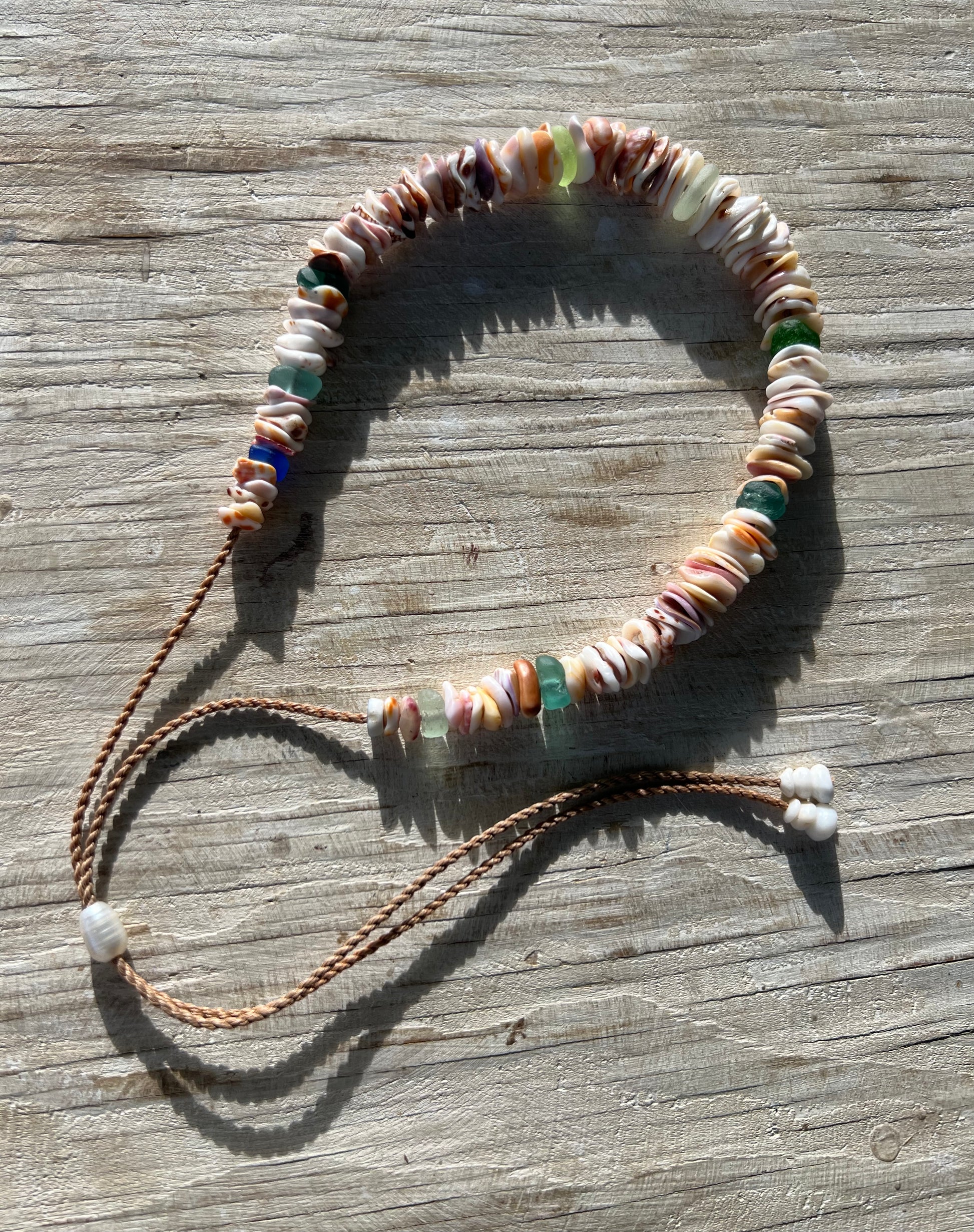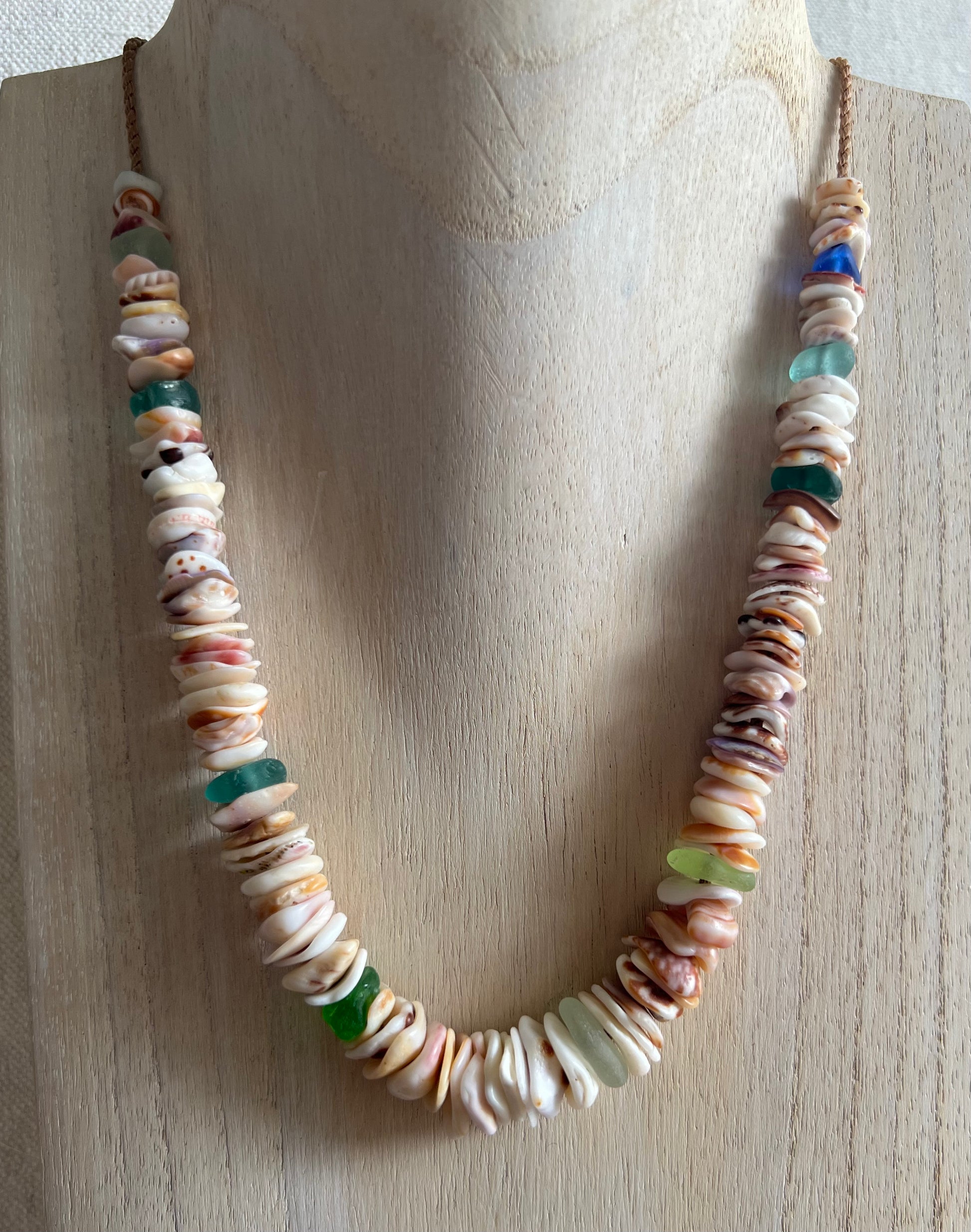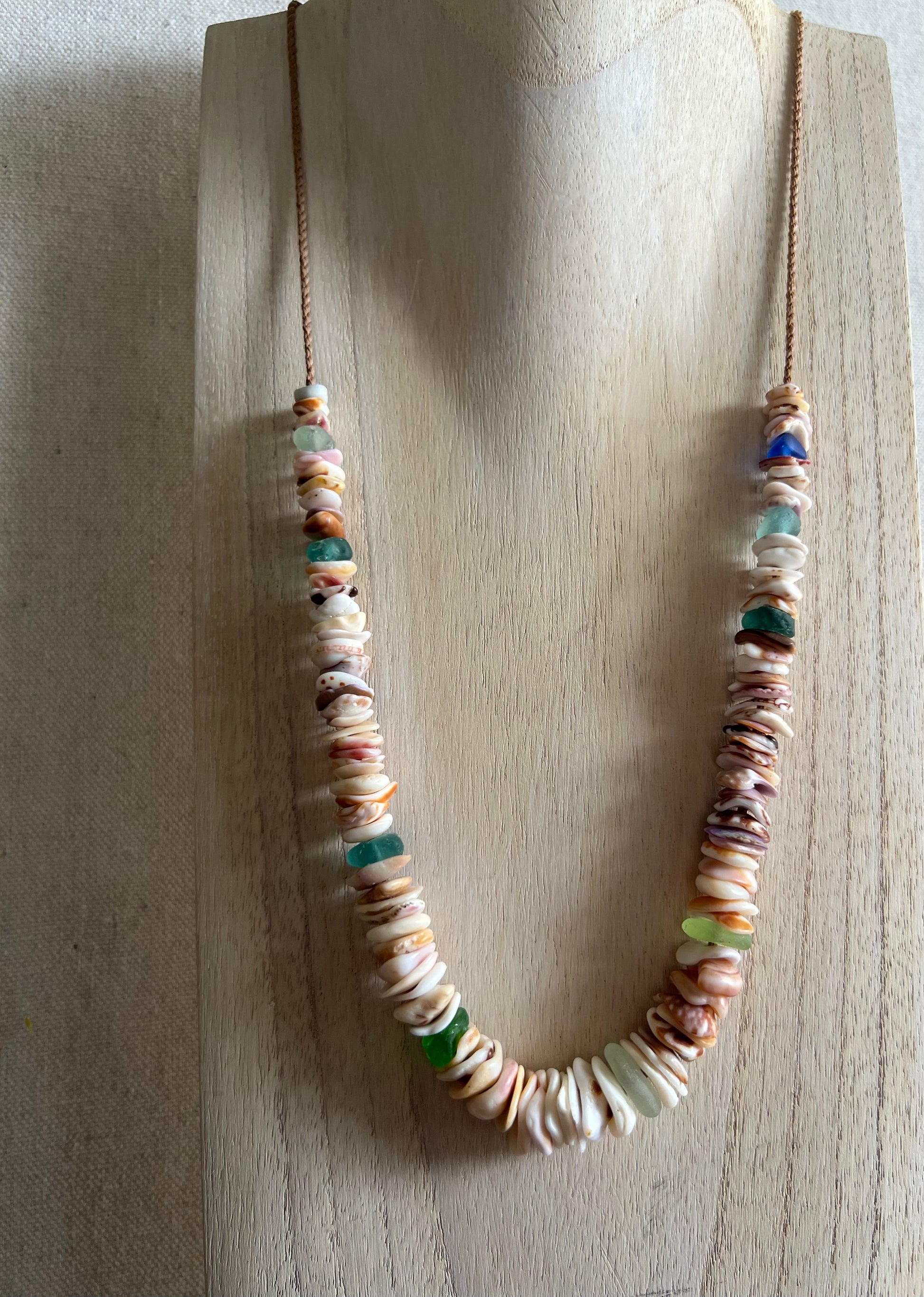 Fifteen and a half inches of surf tumbled shell fragments (all chosen for their deep colors and dynamic patterns) and nine chunky pieces of vintage sea glass float on hand twisted rope cord in a random but stunningly organic pattern,.