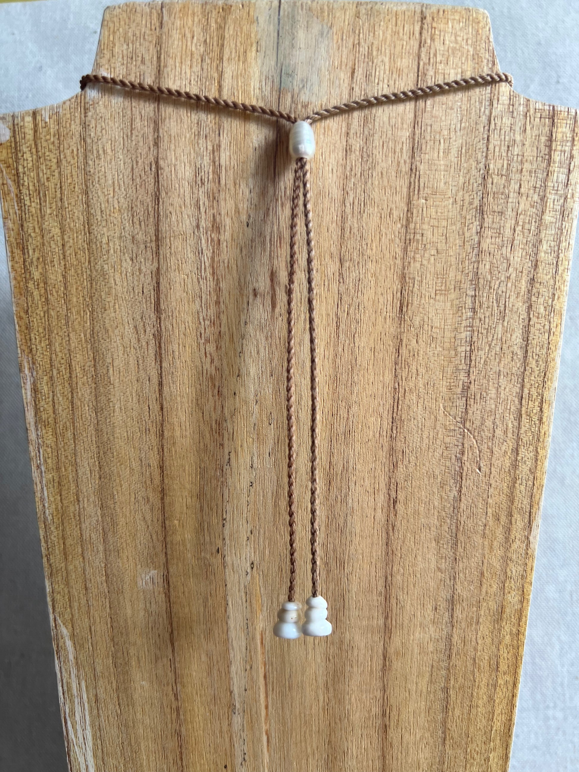 The secure adjustable closure is created using a sliding freshwater pearl, and each cord end is finished with three miniature pukas. The details and of this necklace are sweetly feminine as well as durable and functional.