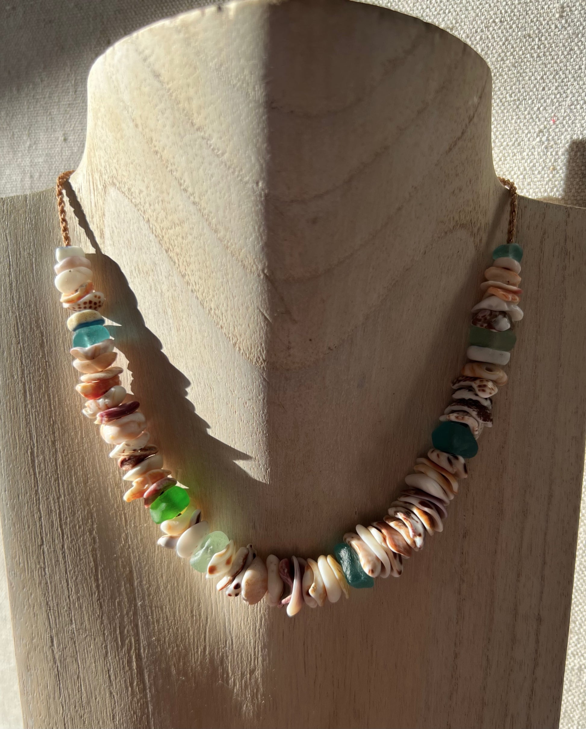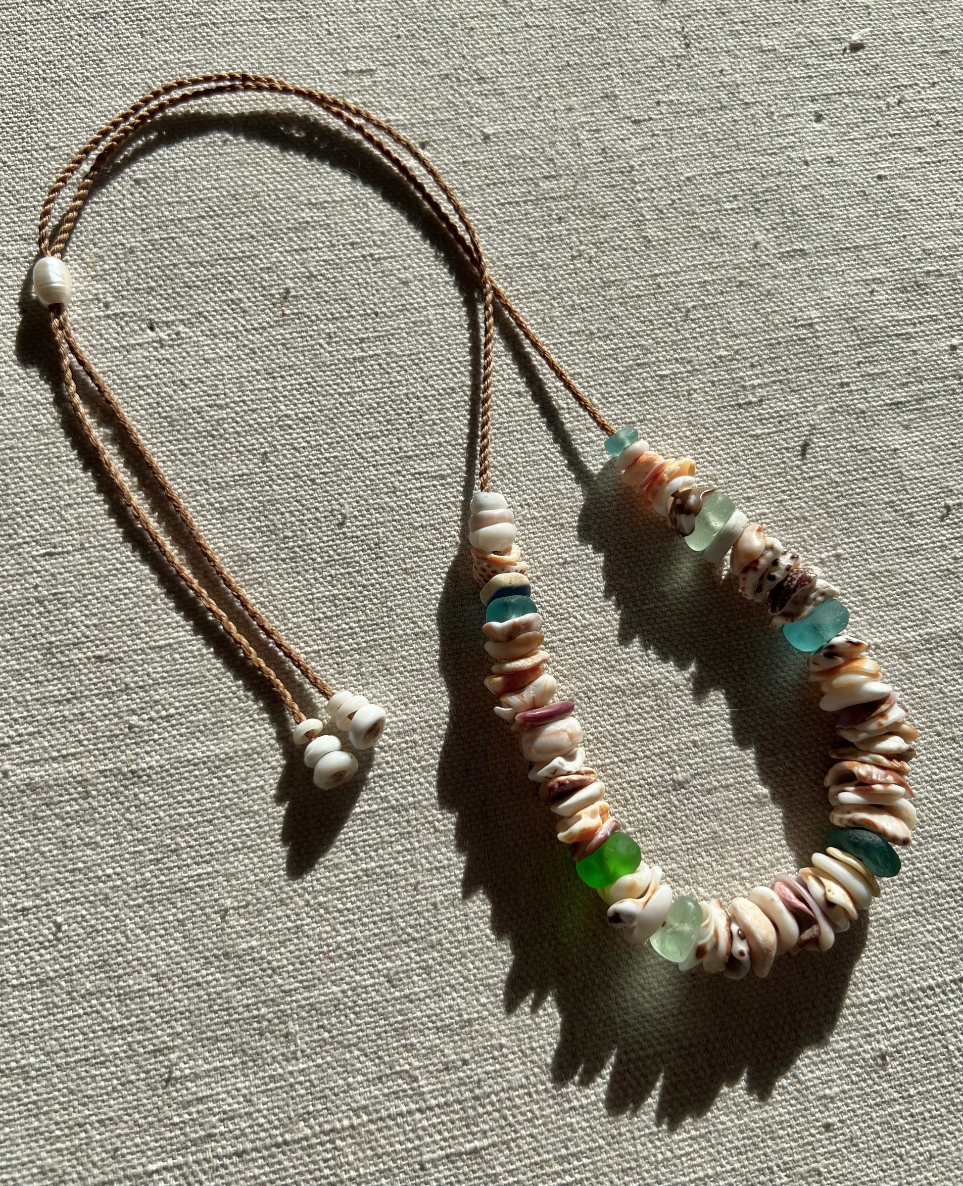Nine inches of surf tumbled shell fragments (all chosen for their deep colors and dynamic patterns) and seven chunky pieces of vintage sea glass float on hand twisted rope cord in a random but stunningly organic pattern. Because of its adjustable design, this necklace can be worn long (30 inches at its longest) or short like a choker.