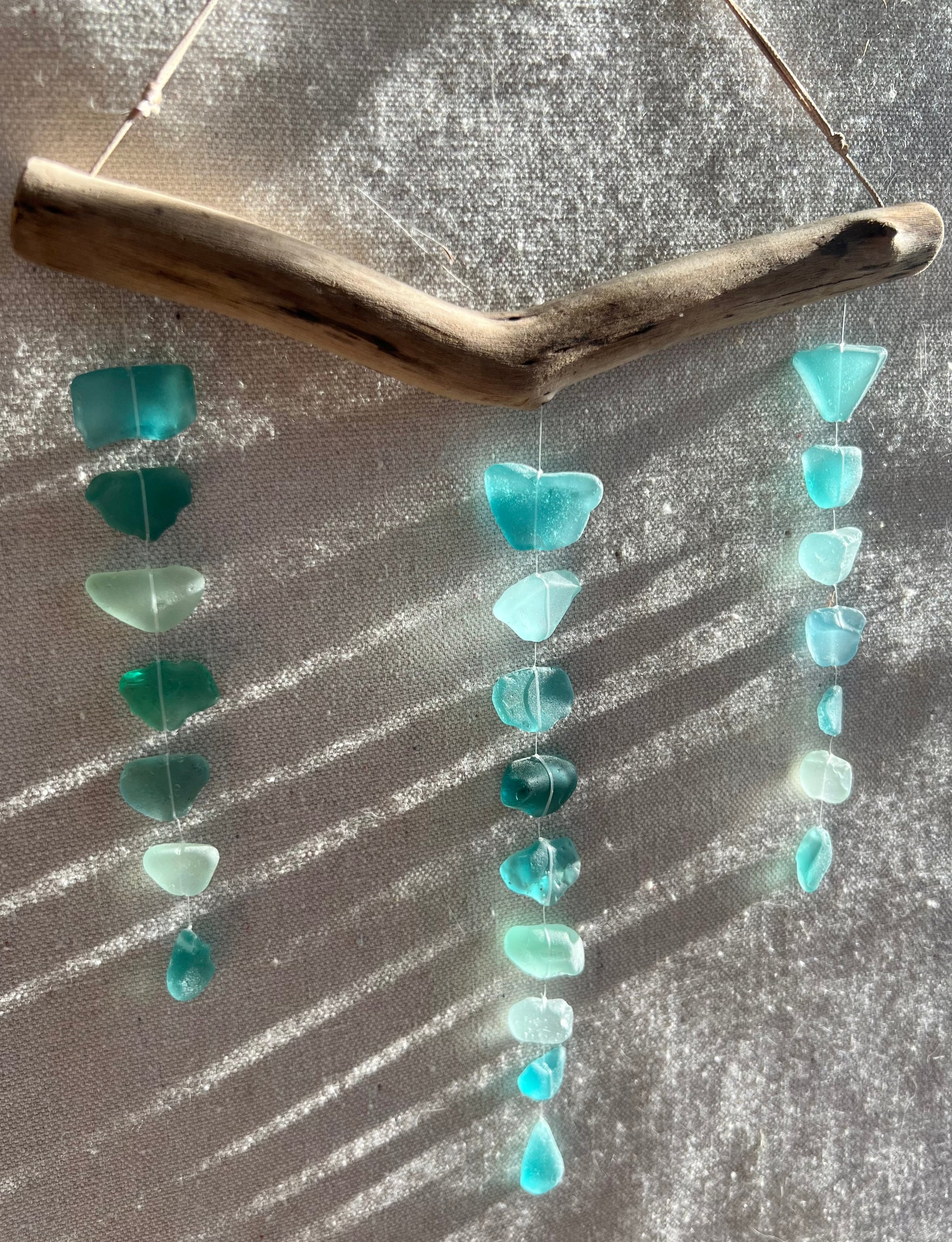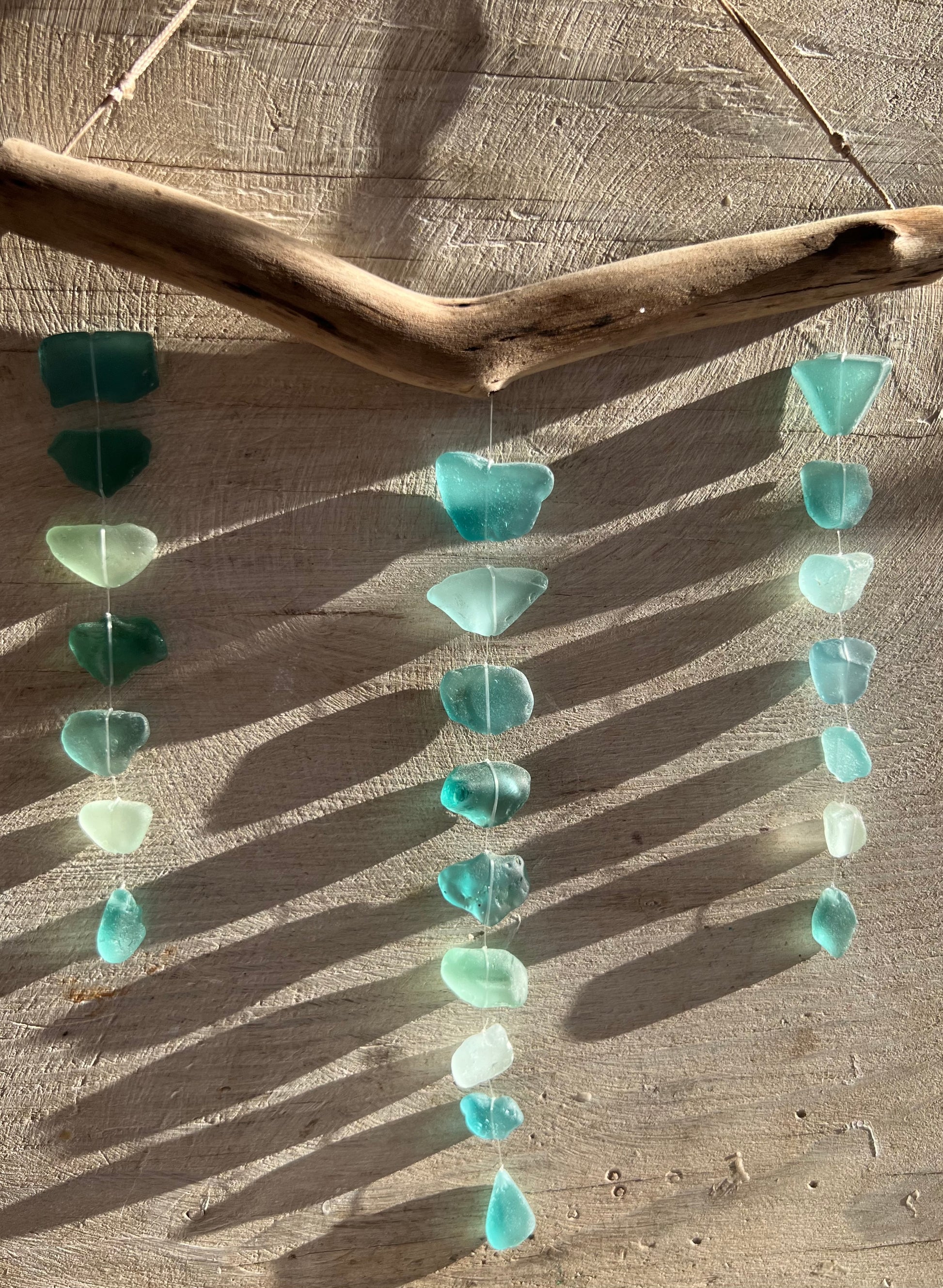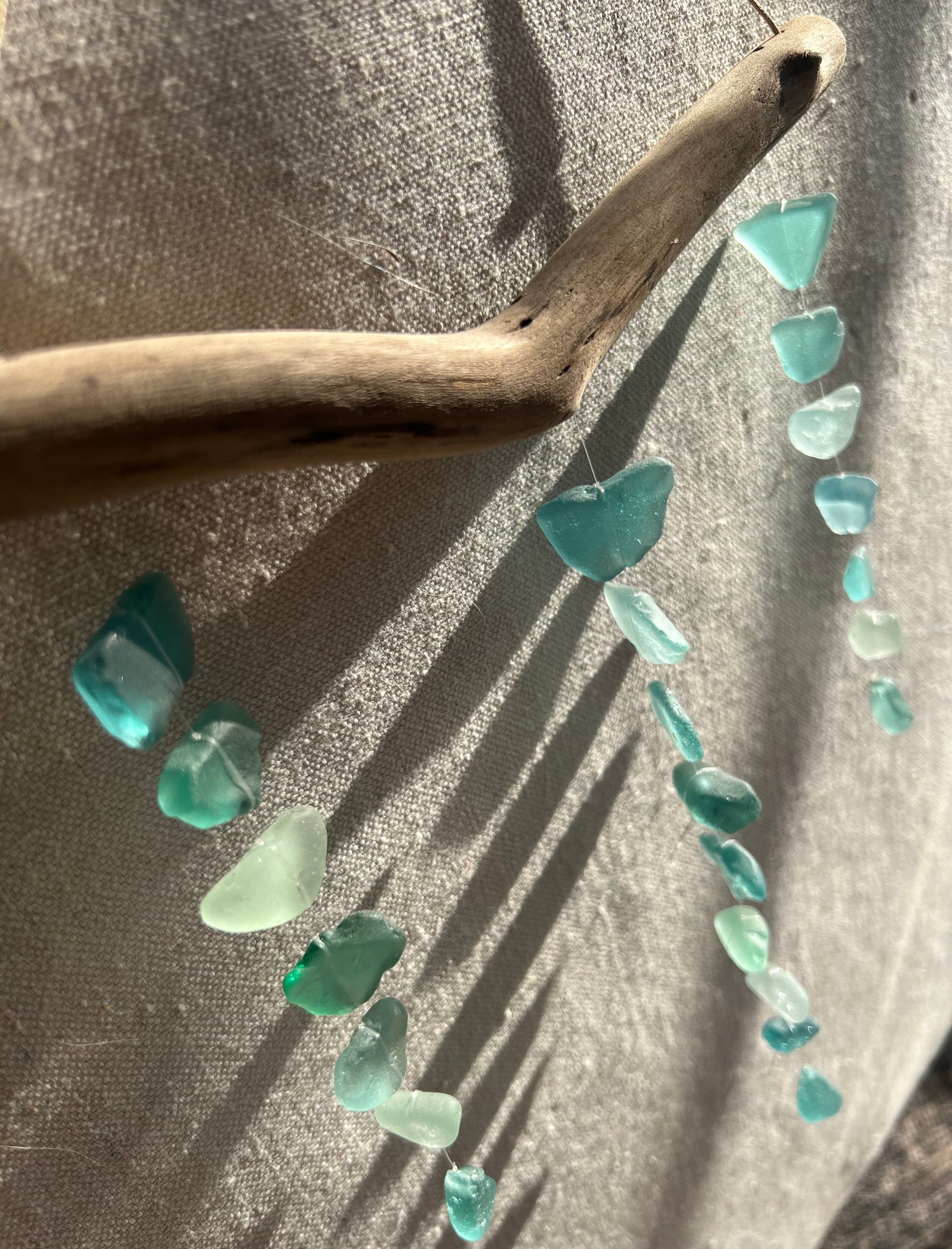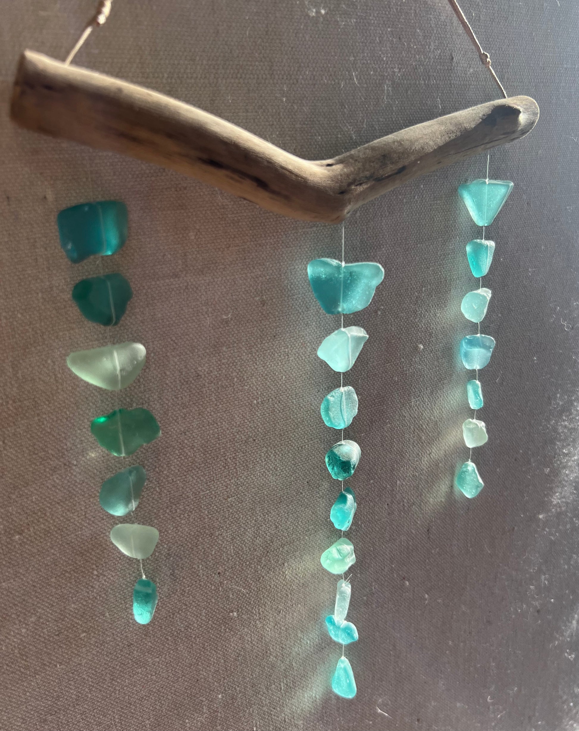 This stunning Sea Glass Mobile is made with 23 pieces of thick vintage sea glass in a variety of turquoise blues and greens. Sea Glass is hand strung on nylon monofilament, with each piece securely wrapped 2.5 times and fastened with 3 different knots. The longer (center) strand measures 8.5 inches and the outer strands measure 6.5 inches. The adjustable hanger is made from 1mm waxed polyester thread. At its shortest adjustment, the hanging height (from center of hanging cord to bottom of longest sea glass strand) is 13.5 inches and at its longest, 18.5 inches.