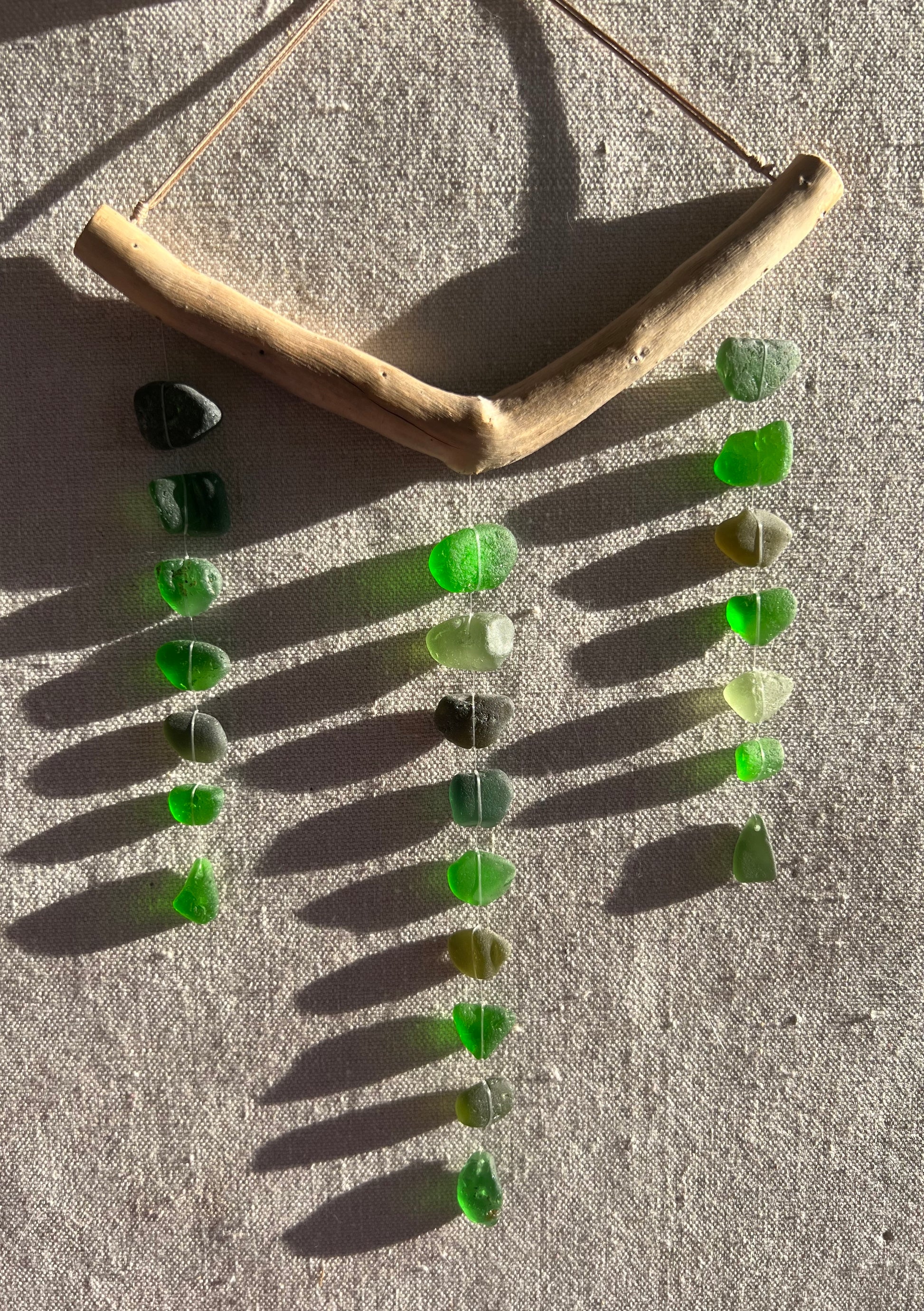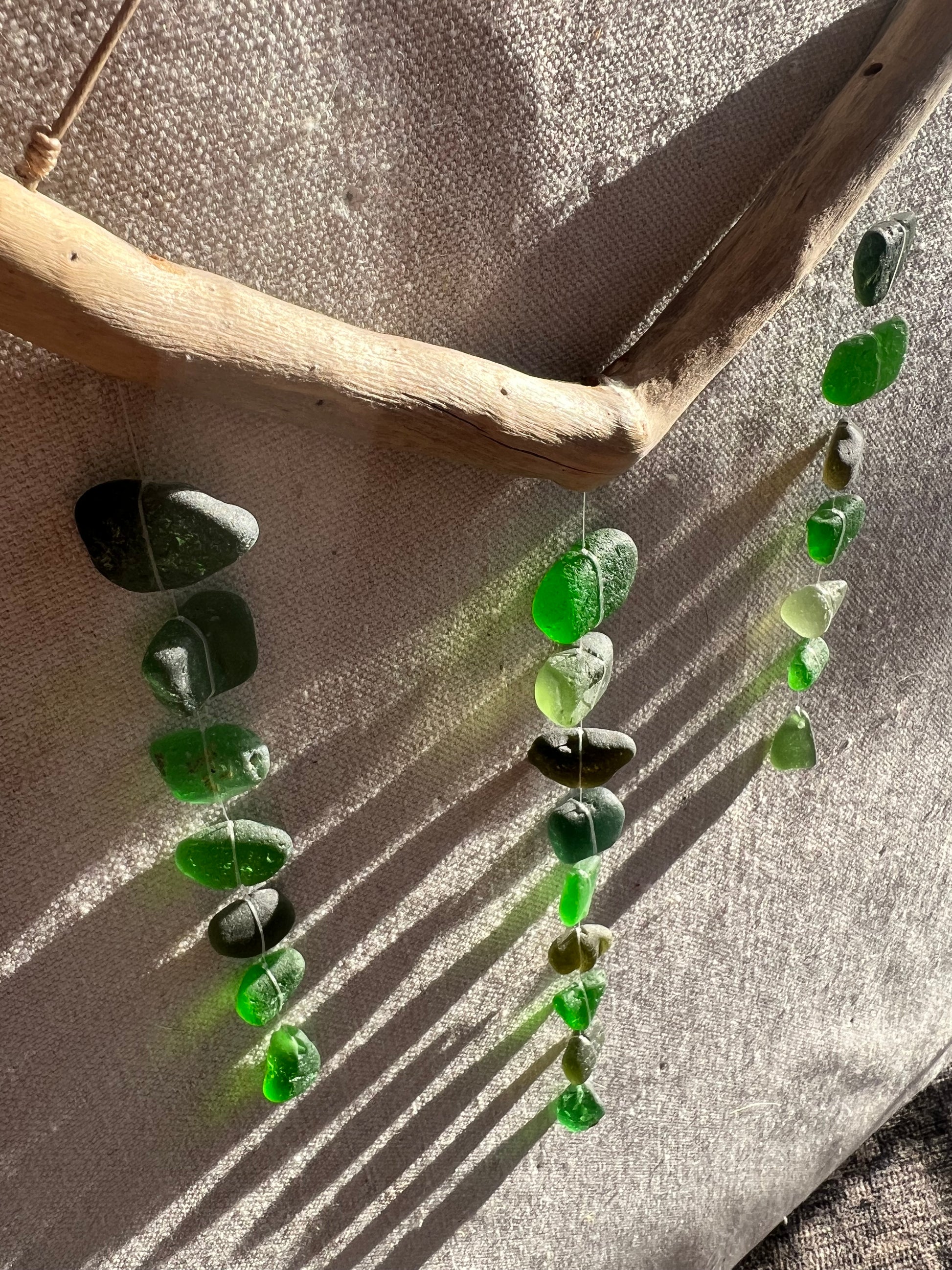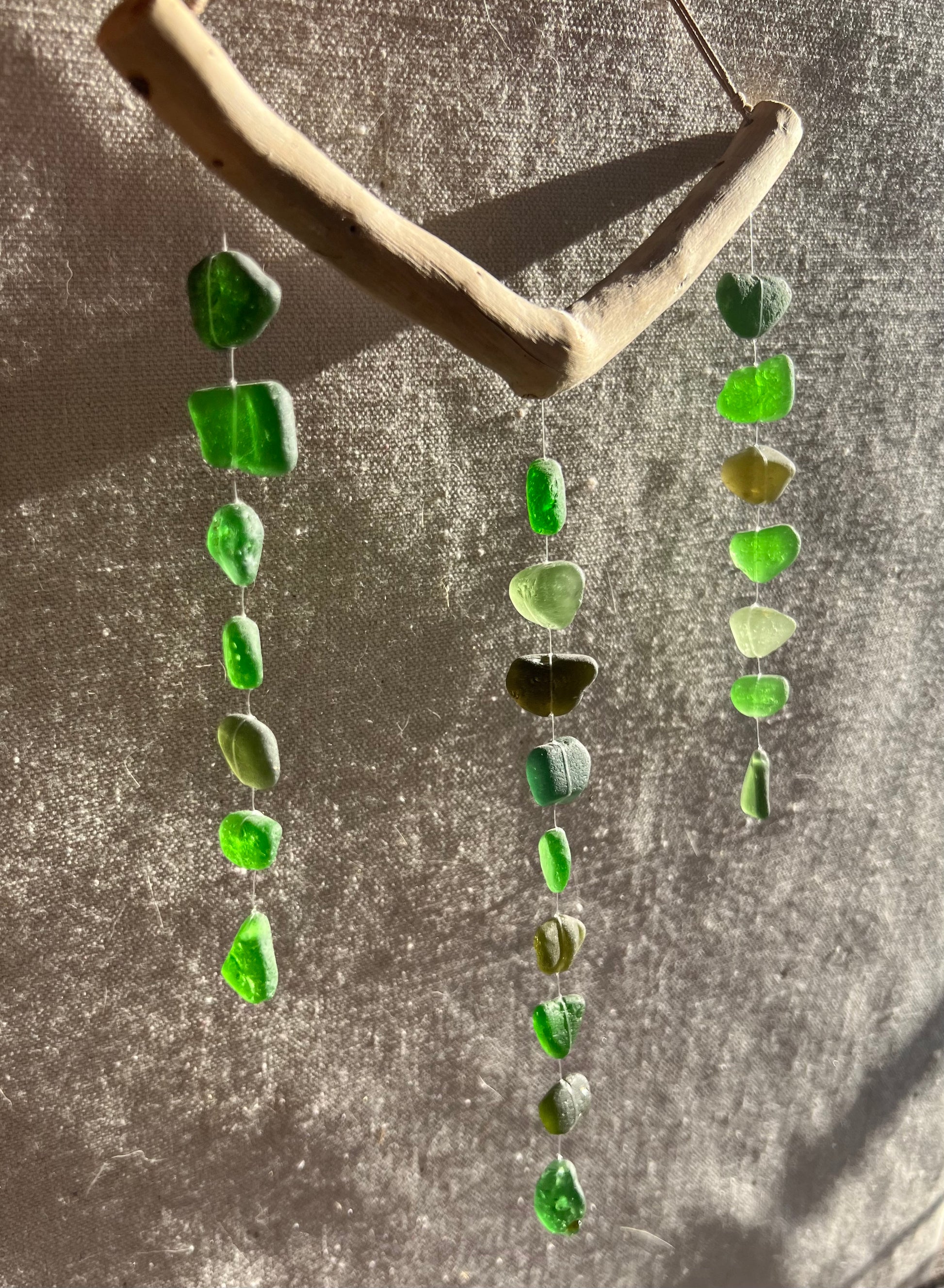 This stunning Sea Glass Mobile is made with 23 pieces of thick vintage sea glass in a variety of jungle greens. Sea Glass is hand strung on nylon monofilament, with each piece securely wrapped 2.5 times and fastened with 3 different knots. The longer (center) strand measures 8.25 inches and the outer strands measure 6.5 inches. The adjustable hanger is made from 1mm waxed polyester thread. At its shortest adjustment, the hanging height (from center of hanging cord to bottom of longest sea glass strand) is 13.5 inches and at its longest, 18 inches.