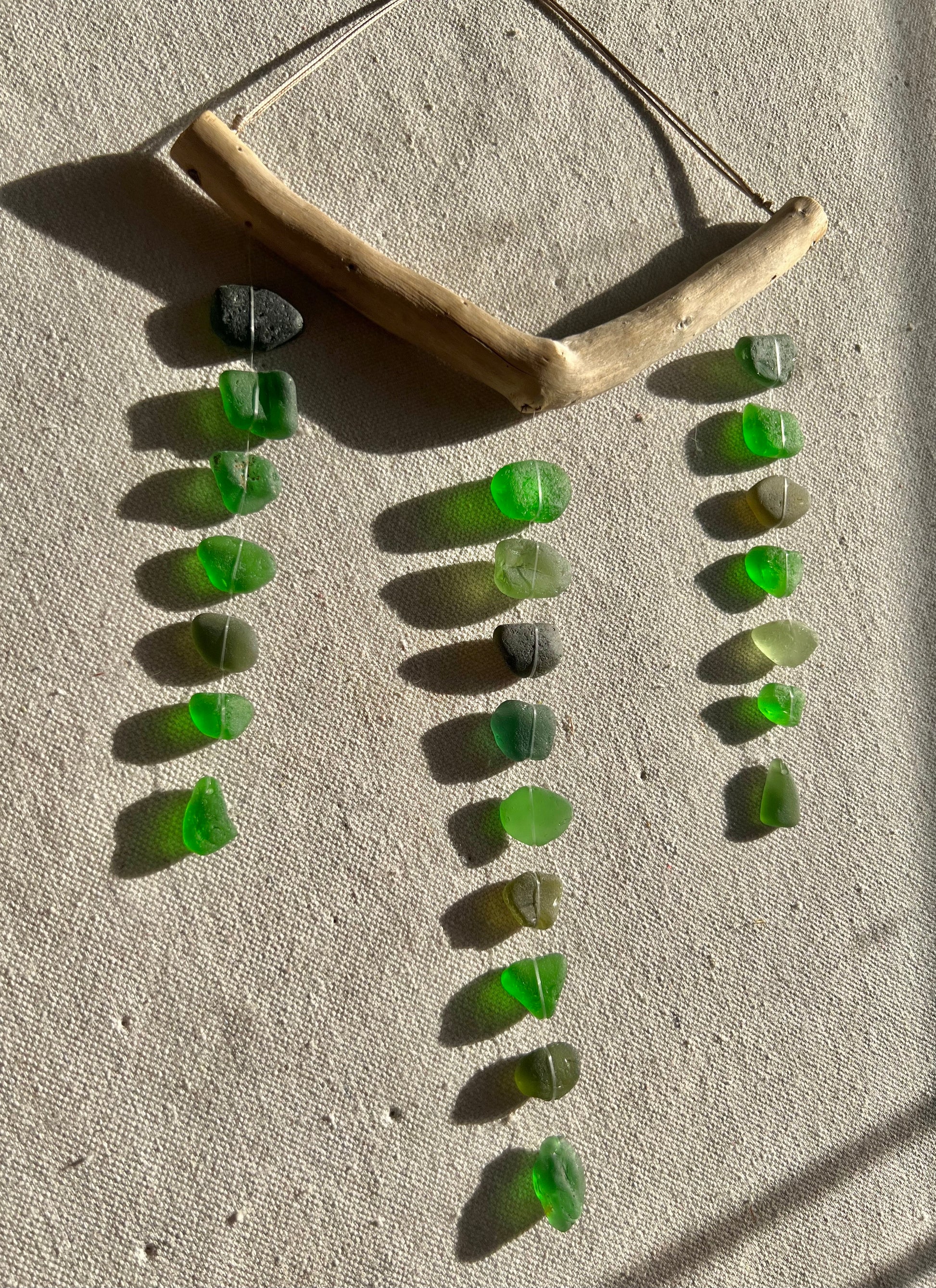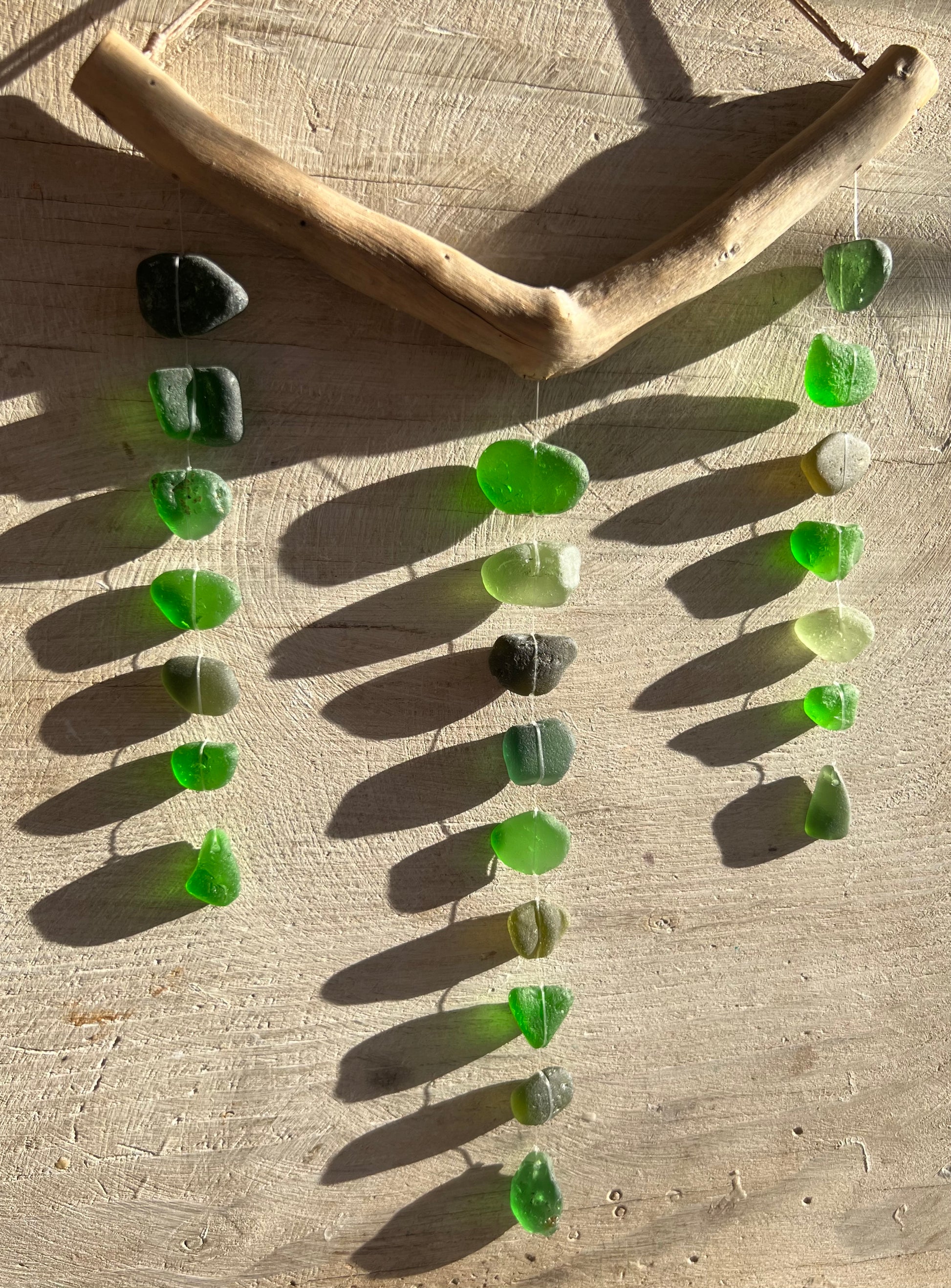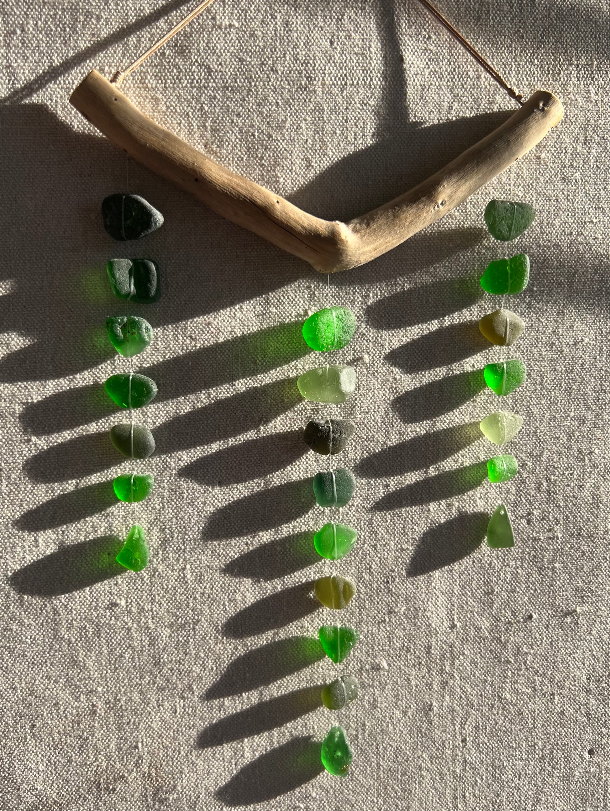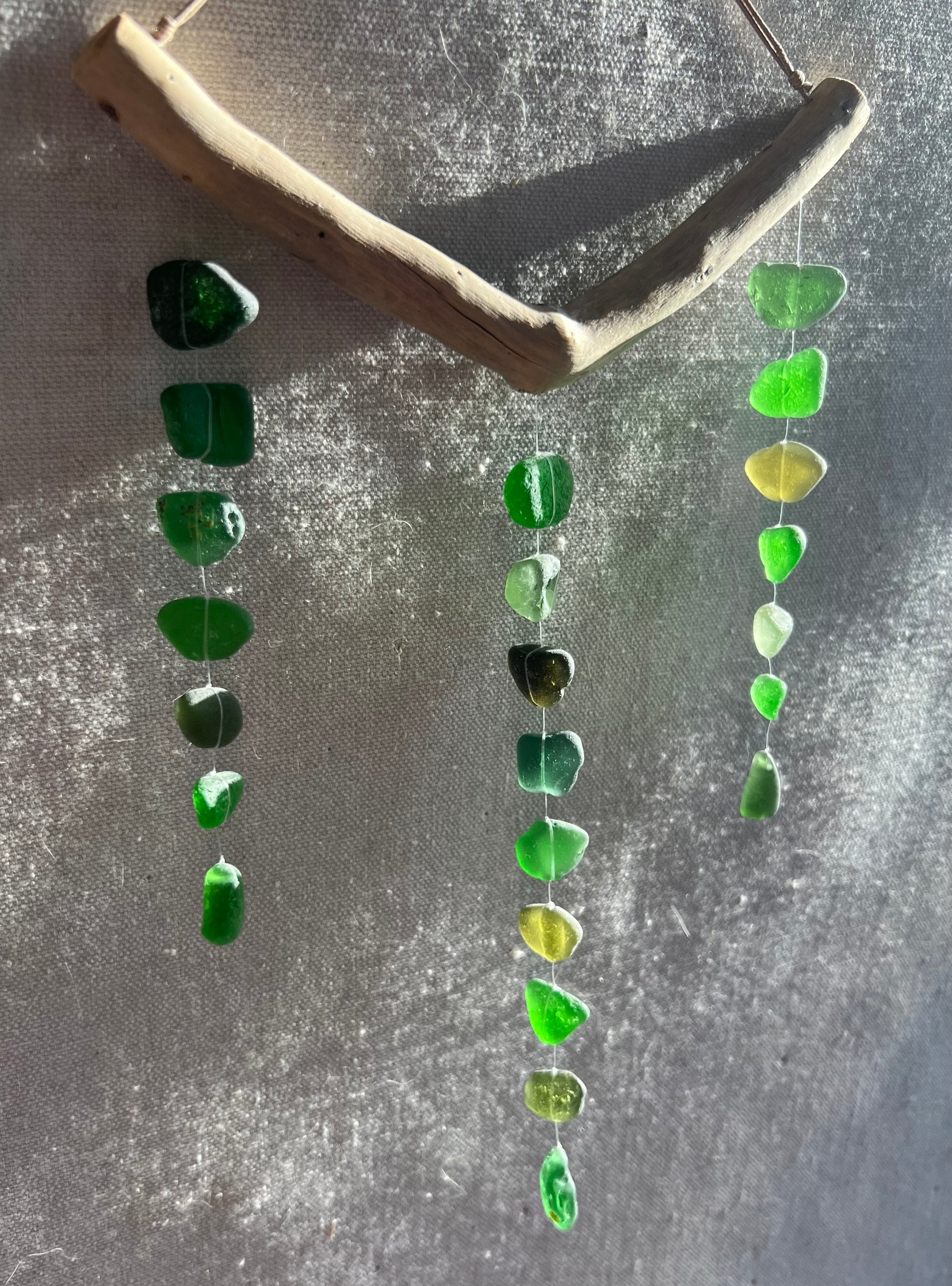 This stunning Sea Glass Mobile is made with 23 pieces of thick vintage sea glass in a variety of jungle greens. Sea Glass is hand strung on nylon monofilament, with each piece securely wrapped 2.5 times and fastened with 3 different knots. The longer (center) strand measures 8.25 inches and the outer strands measure 6.5 inches. The adjustable hanger is made from 1mm waxed polyester thread. At its shortest adjustment, the hanging height (from center of hanging cord to bottom of longest sea glass strand) is 13.5 inches and at its longest, 18 inches.