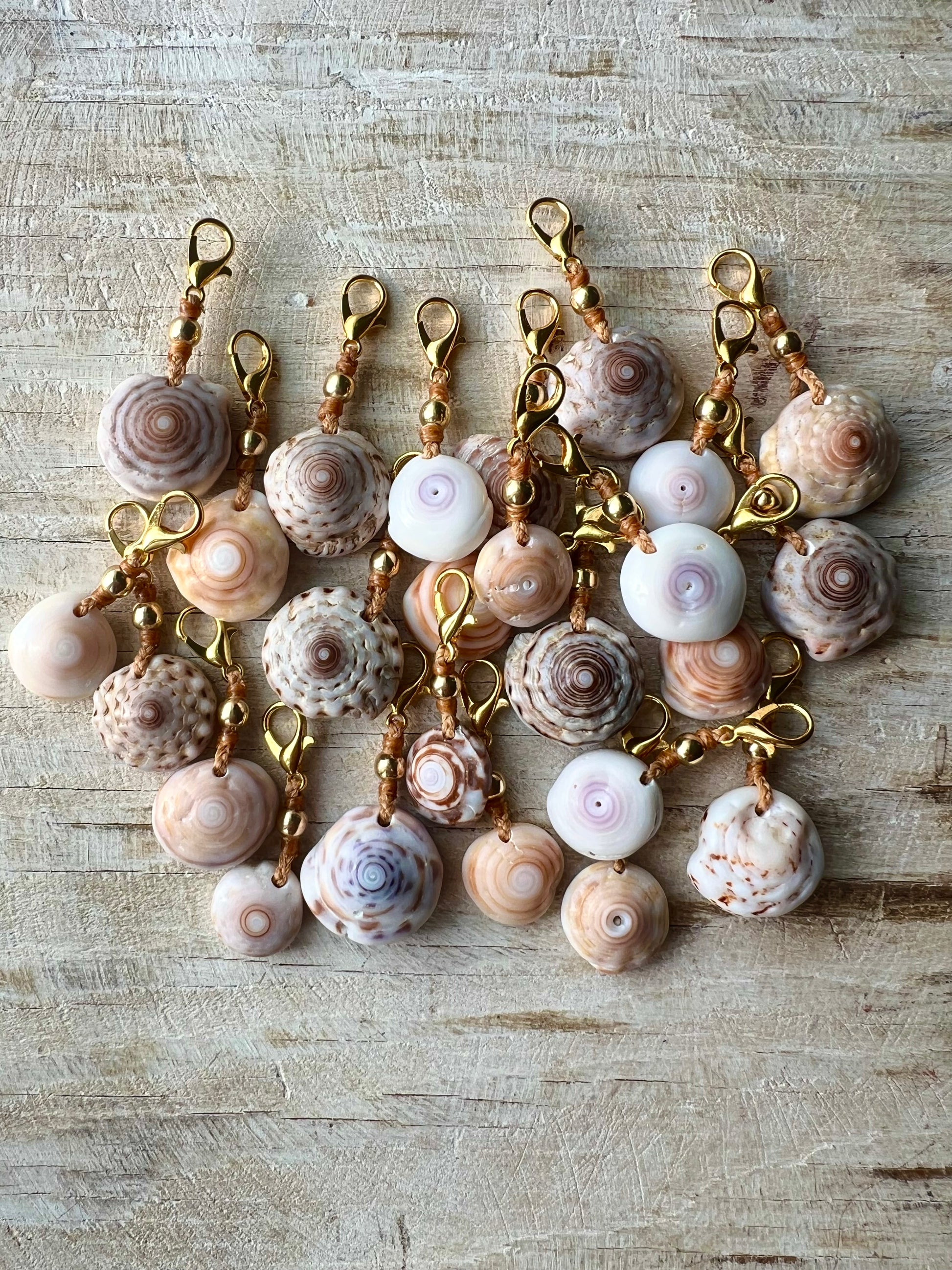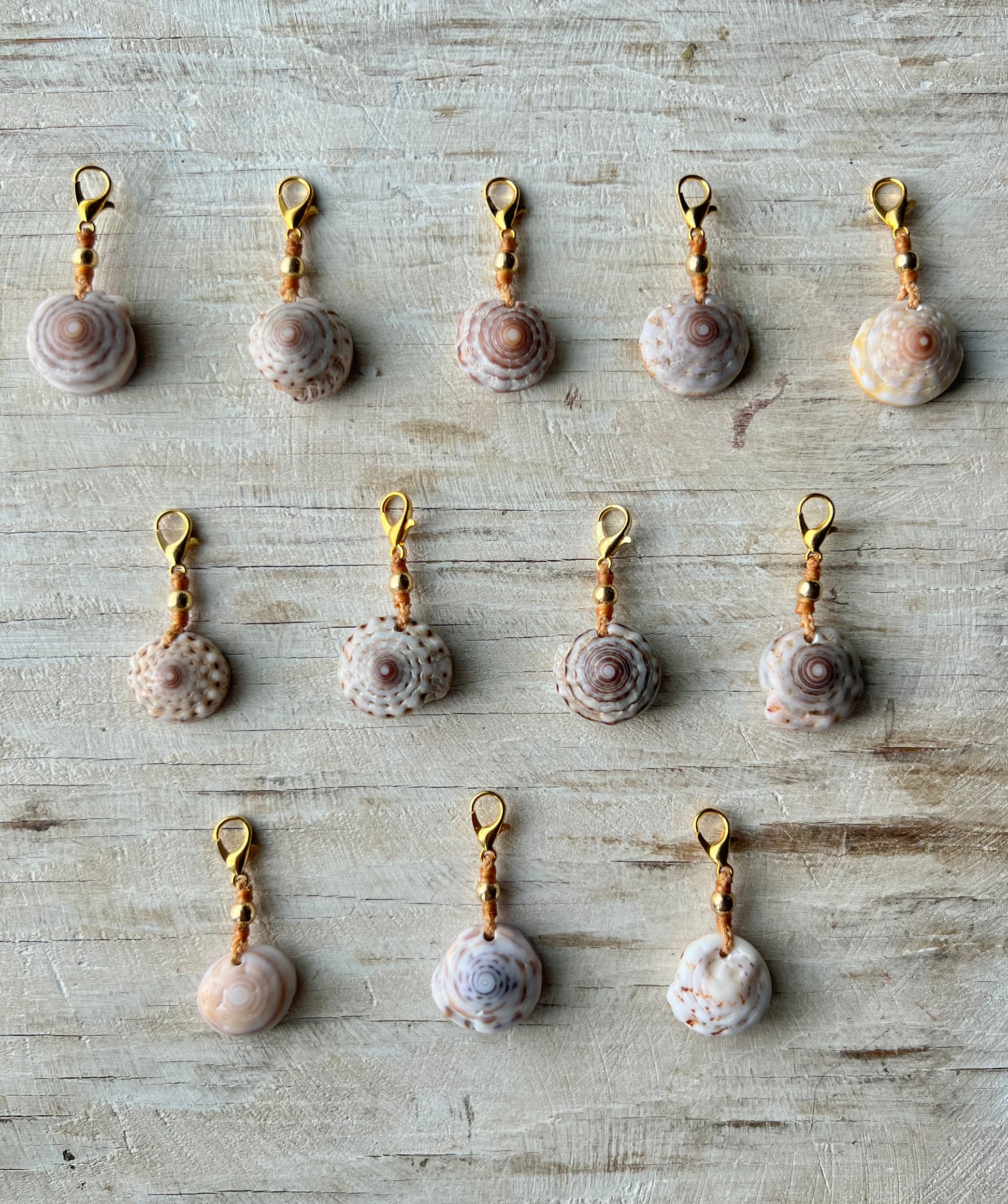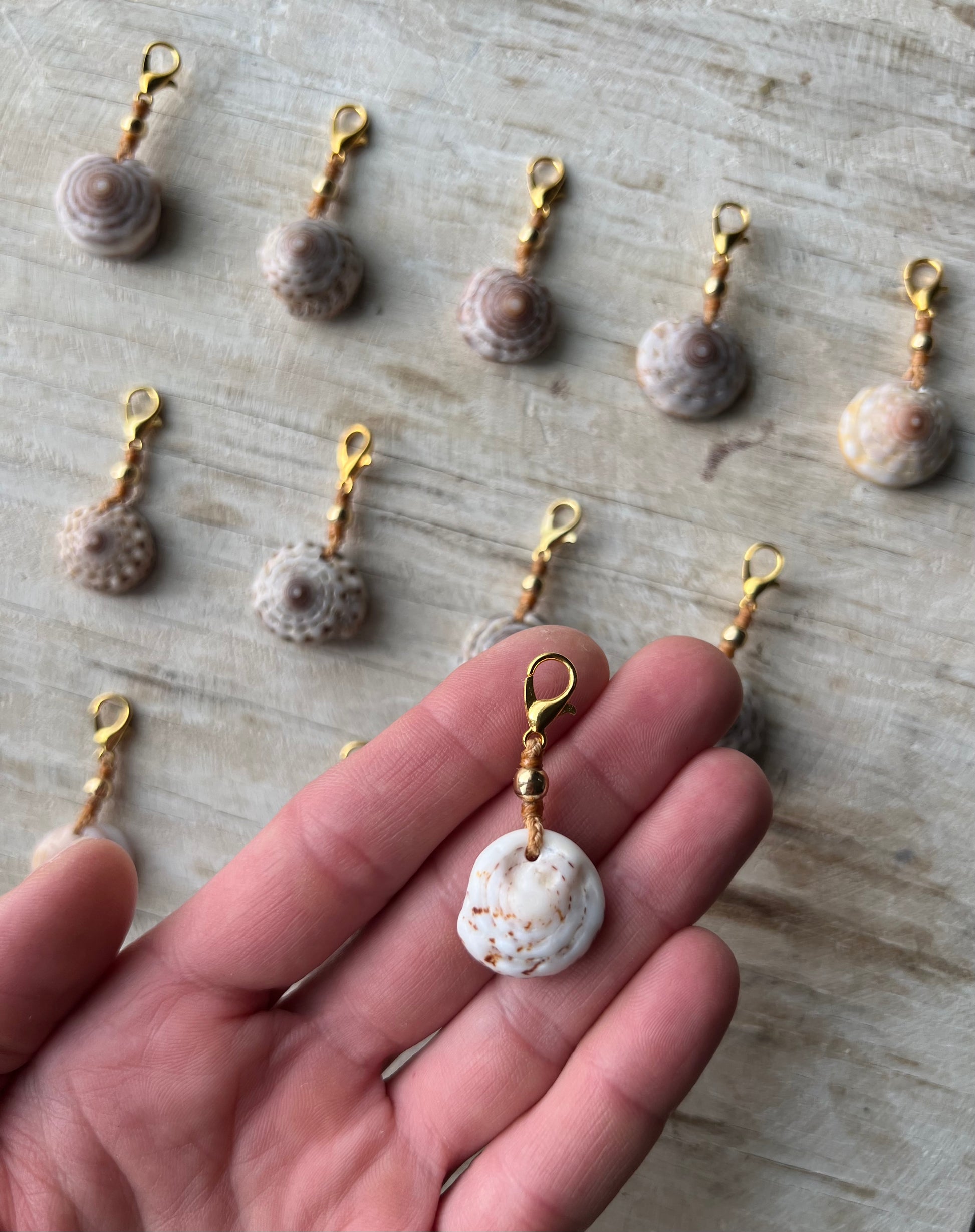 The shell-a-ma-bob is back! One of a kind chunky cone tops are strung on hand braided cord with gold bead detail and gold color lobster claw clip. Clip this ridiculously cute accessory anywhere...on a key chain, purse zipper, get creative!