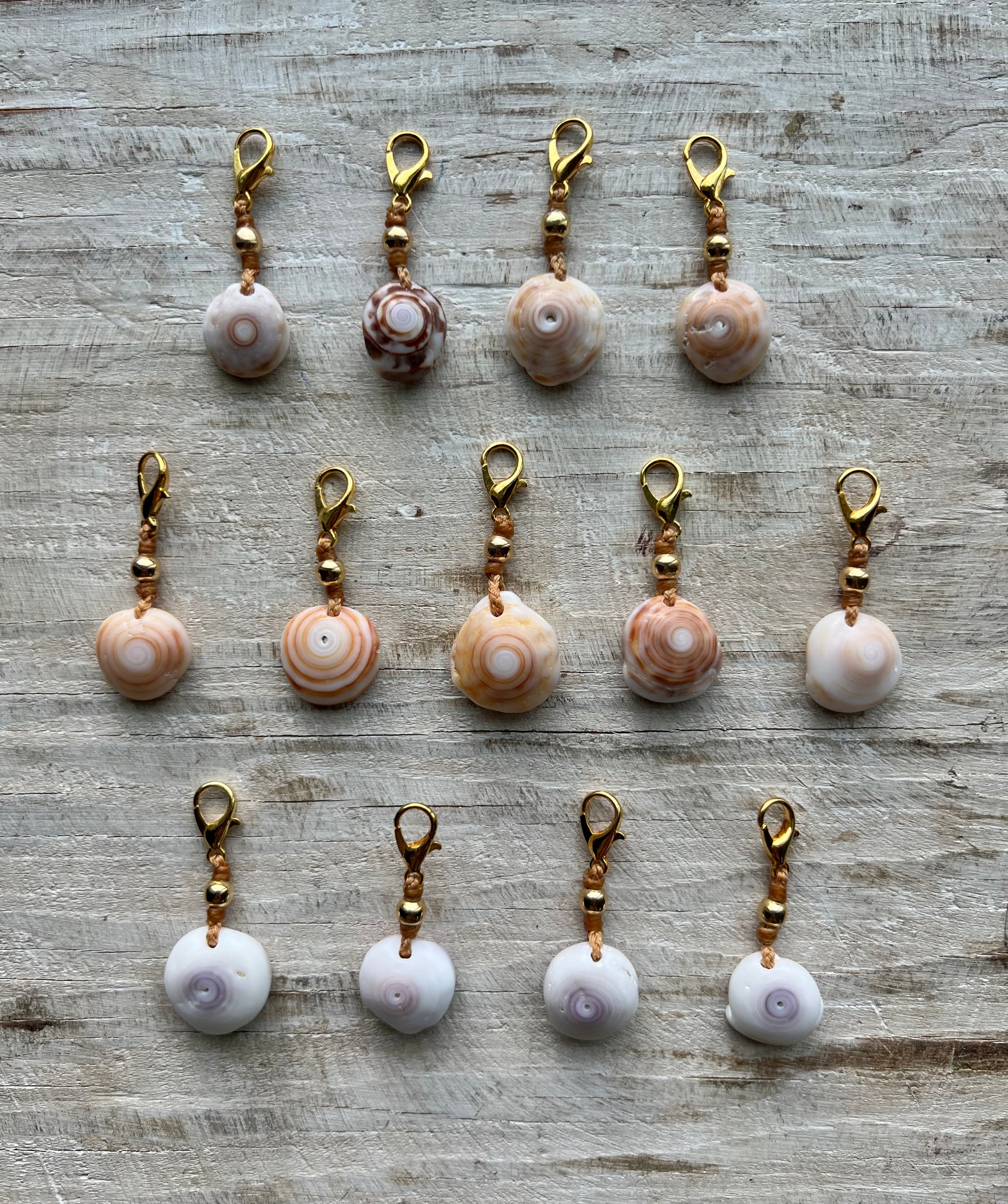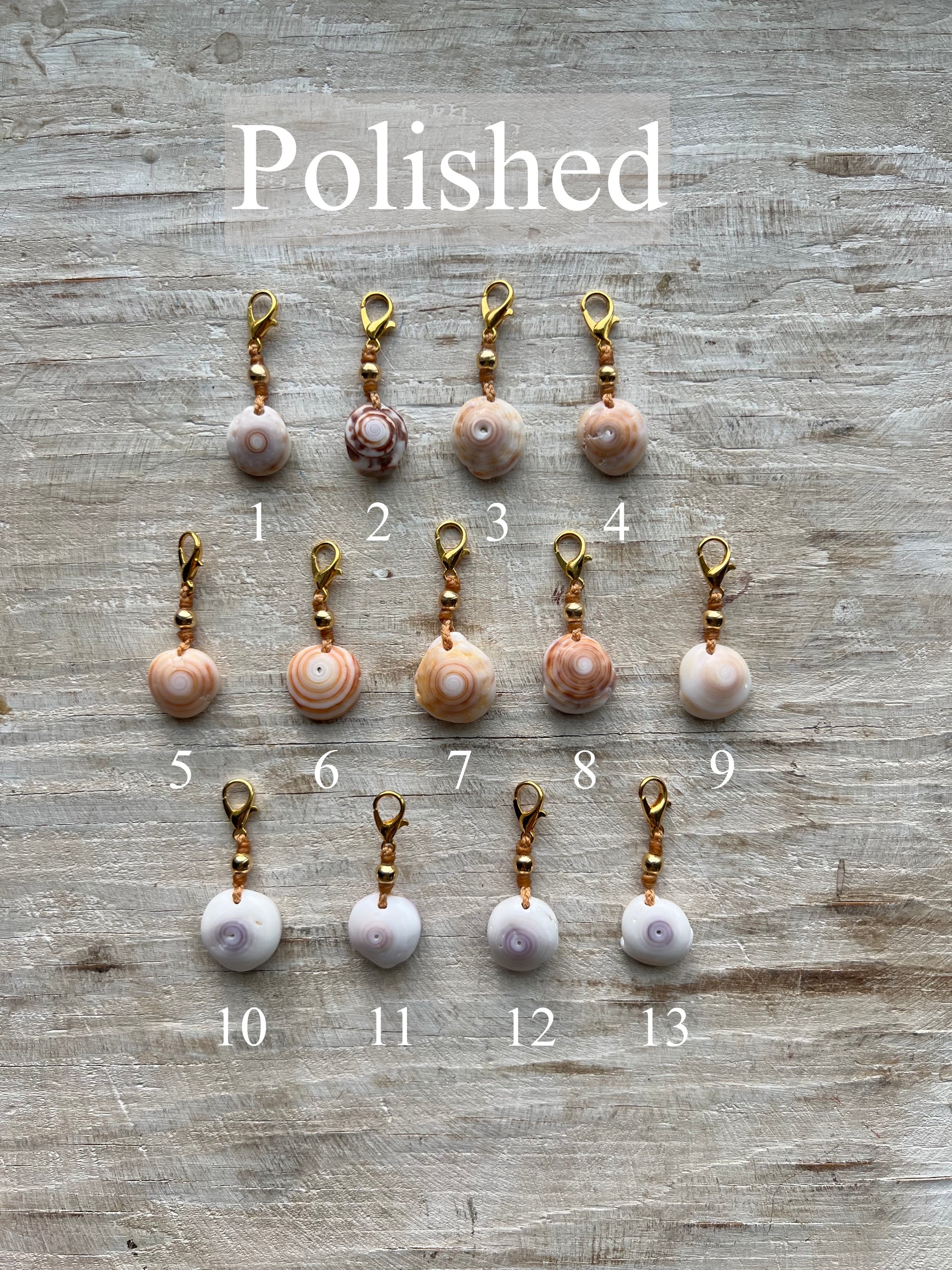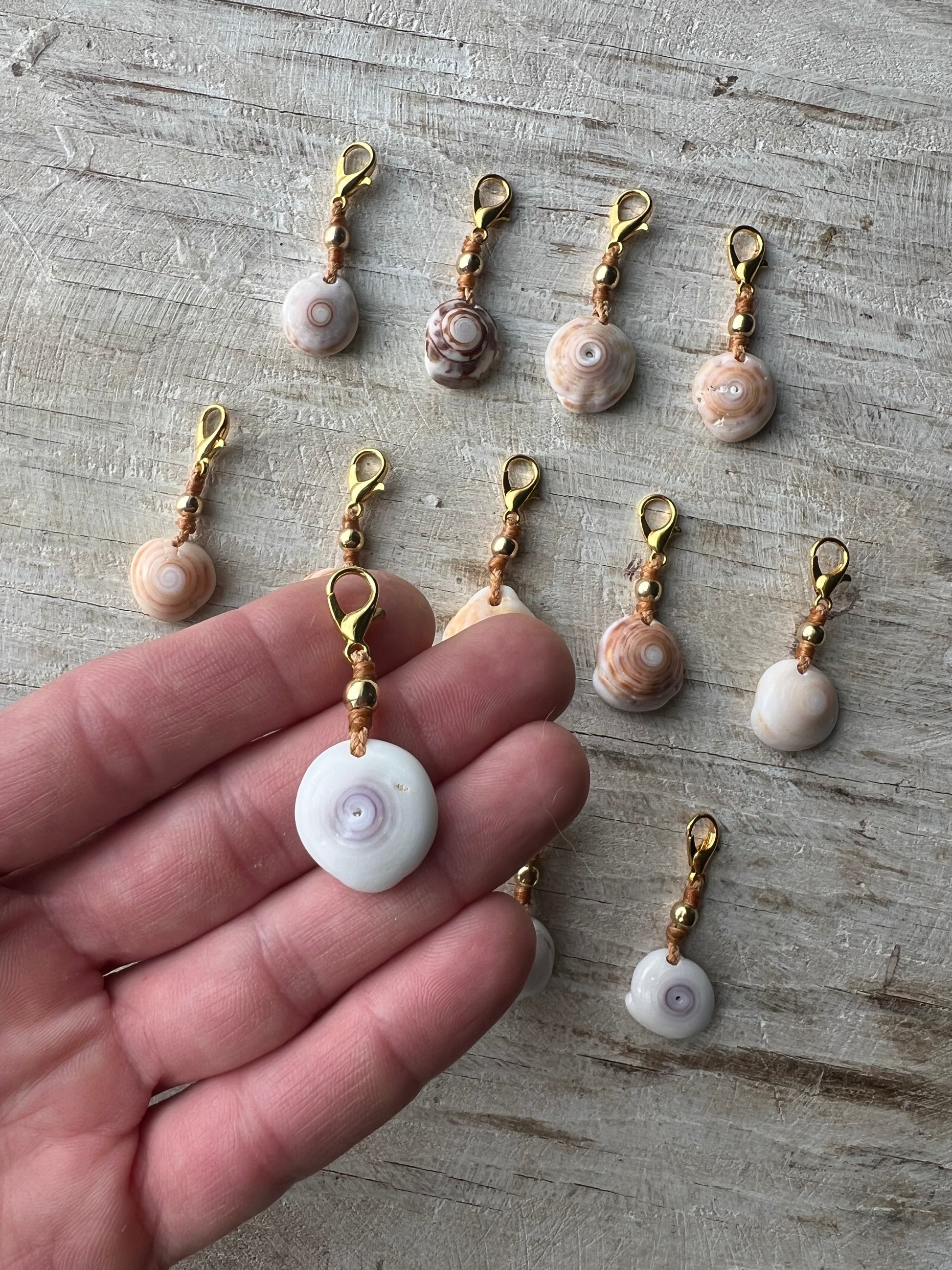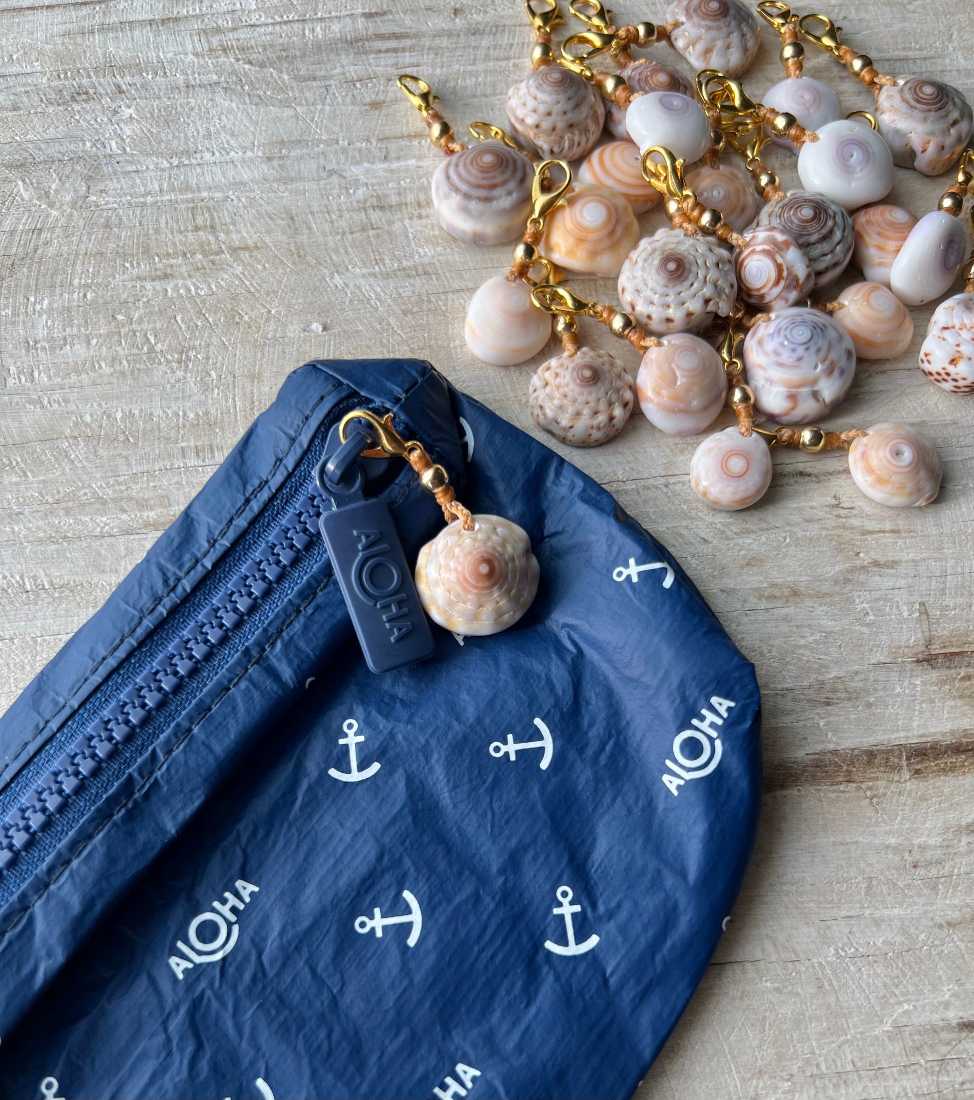 The shell-a-ma-bob is back! One of a kind chunky cone tops are strung on hand braided cord with gold bead detail and gold color lobster claw clip. Clip this ridiculously cute accessory anywhere...on a key chain, purse zipper, get creative!