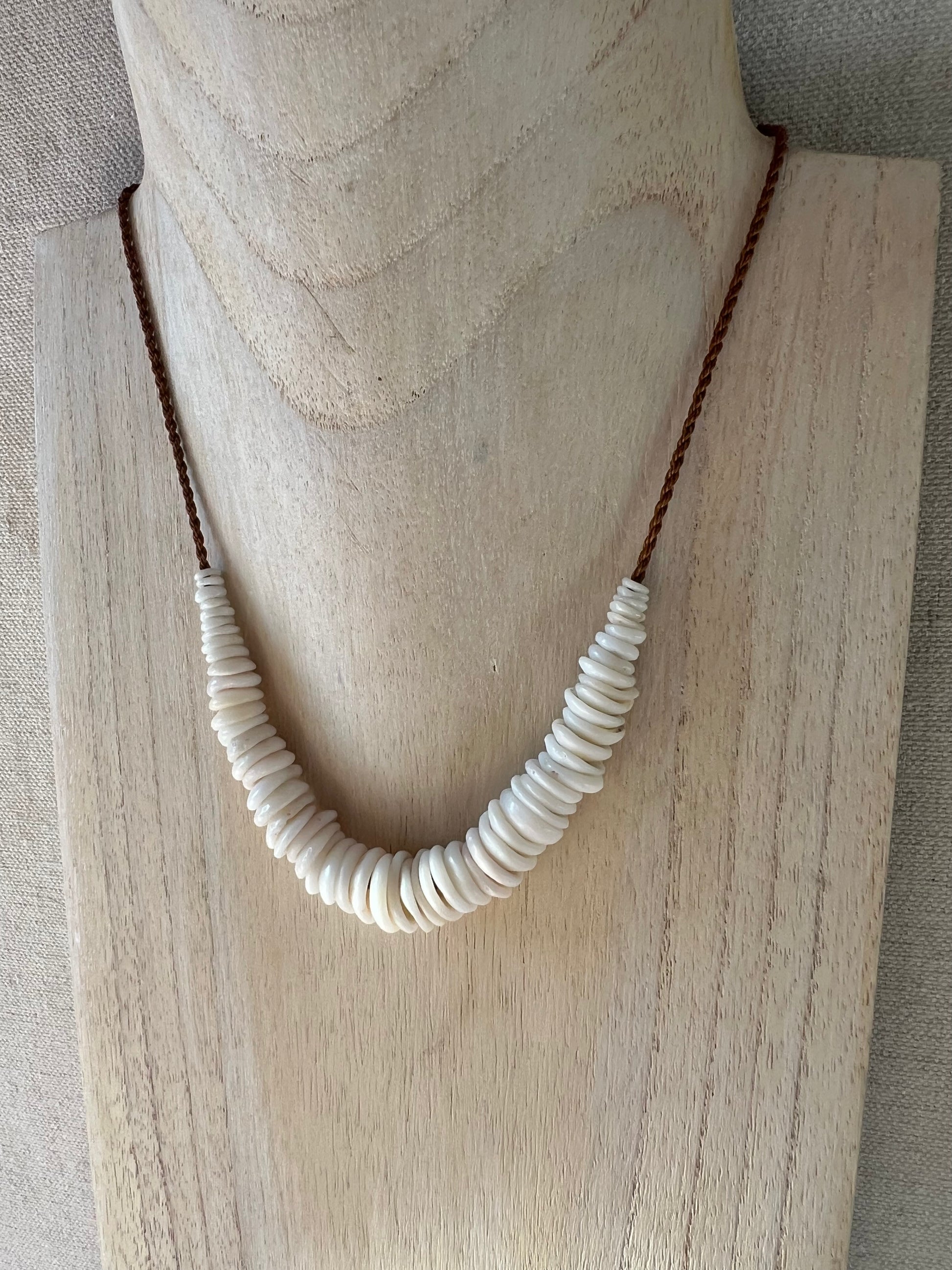 This authentic collection of natural pukas is strung, small to large and back again, on hand twisted 4 ply rope (made from flat waxed polyester thread) in a medium shade of almond brown.