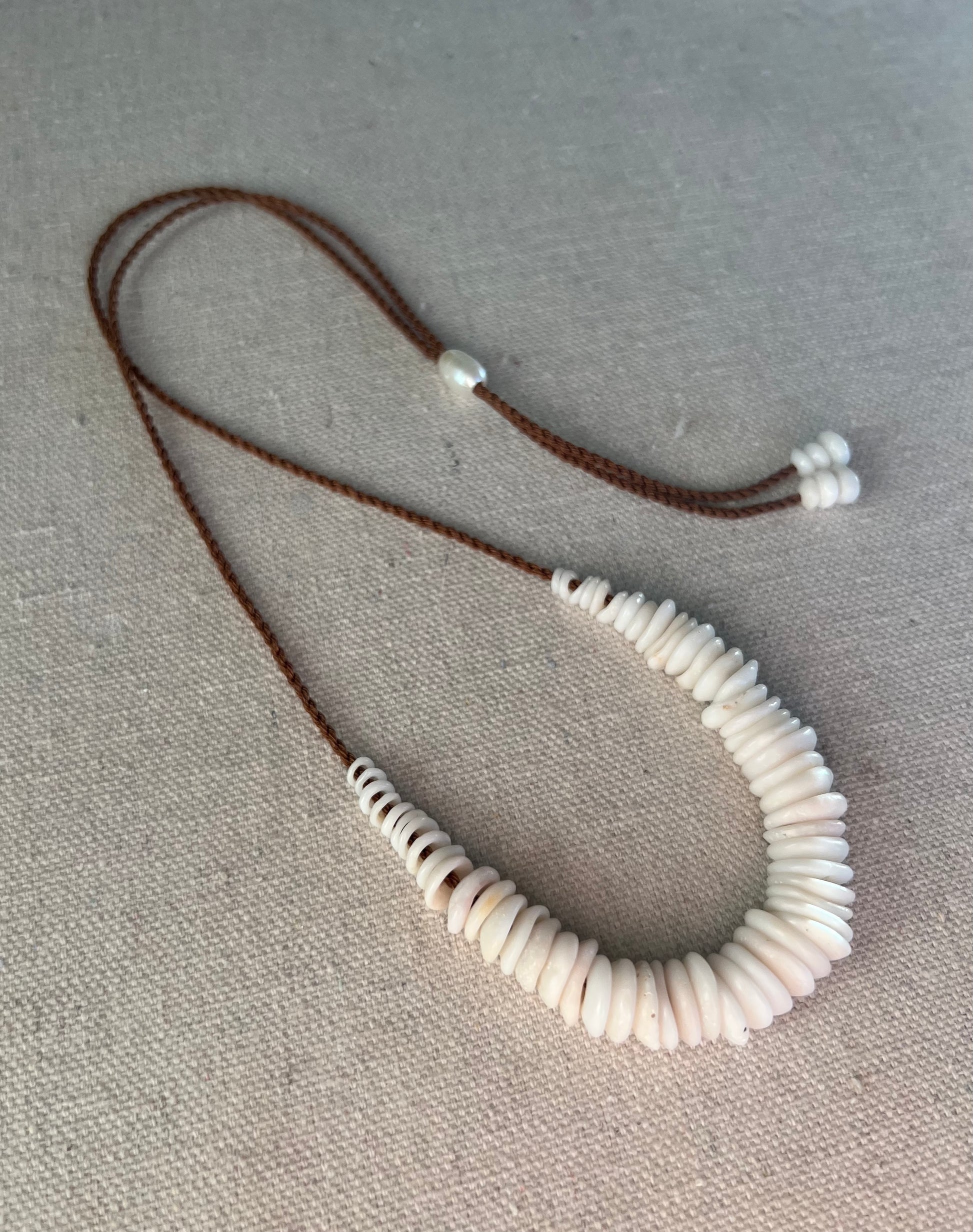The secure adjustable closure is created using a sliding freshwater pearl, and each cord end is finished with three miniature pukas. The details and of this necklace are sweetly feminine as well as durable and functional.